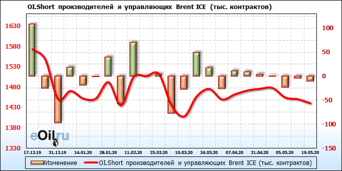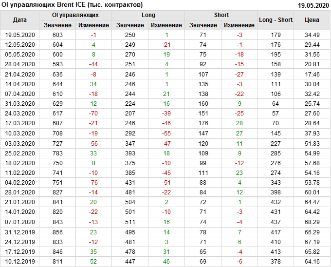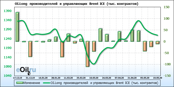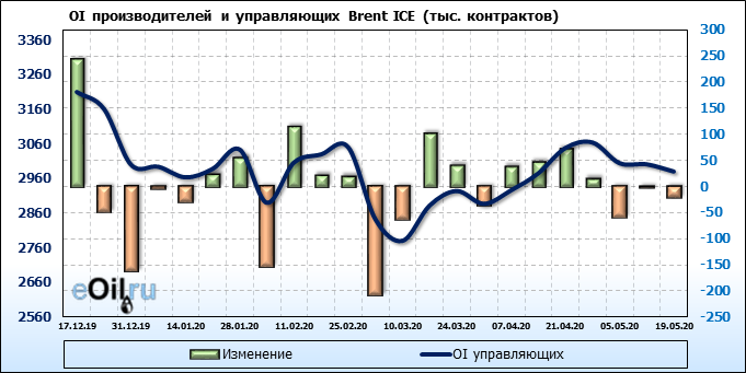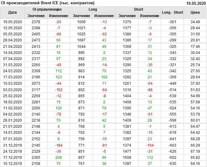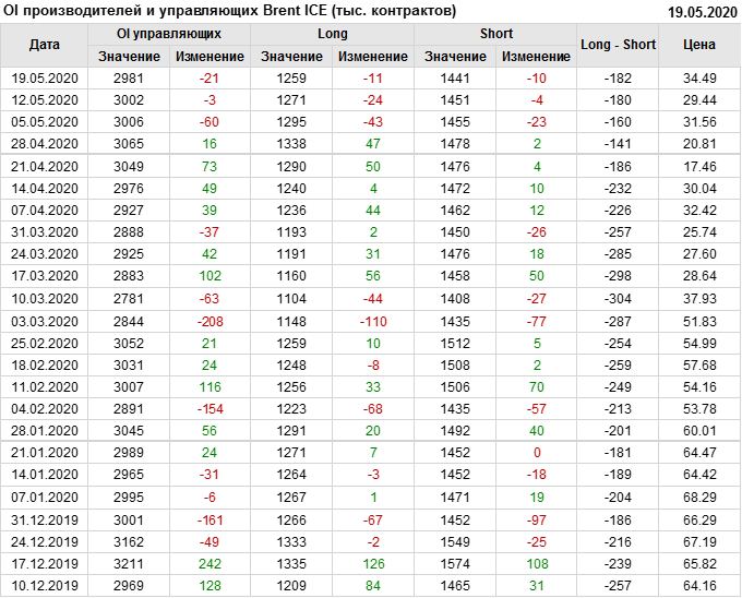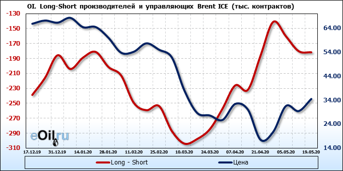 За прошлую неделю, 13.05.20 — 19.05.20, разница между длинными и короткими позициями производителей и управляющих упала на 2 тыс. контрактов. За отчетный период времени, цена выросла на 5.05 доллара. Разница совокупного объема длинных и коротких позиций производителей и управляющих на прошедшей неделе снизилась, в то время как цены выросли. Рынок теряет доверие покупателей, что, при продолжении данной динамики, приведет к стабилизации или падению цен в ближайшее время.