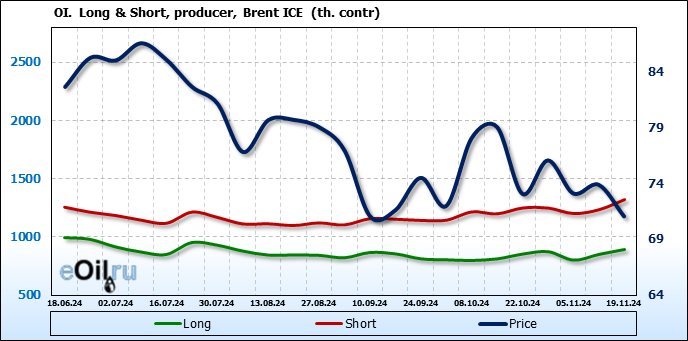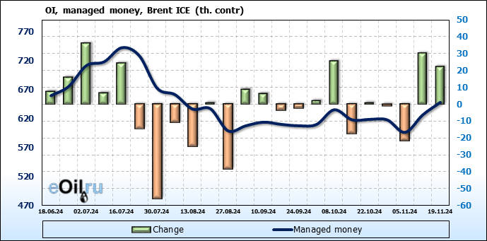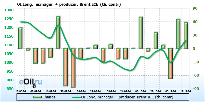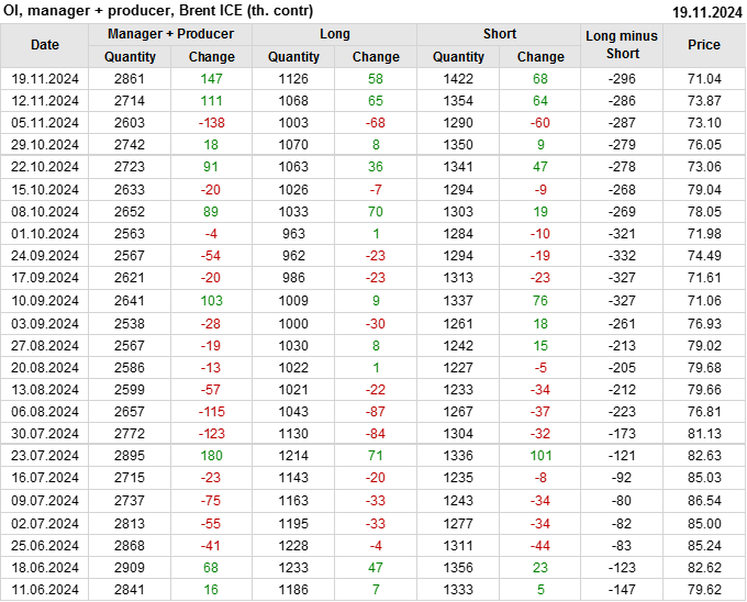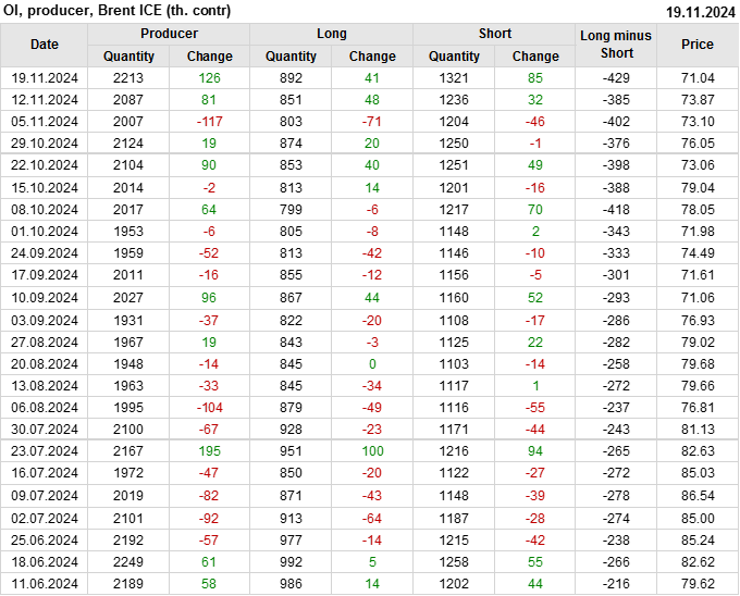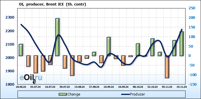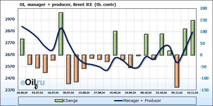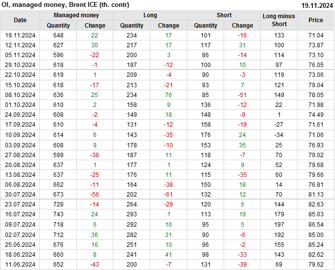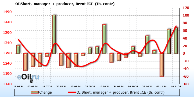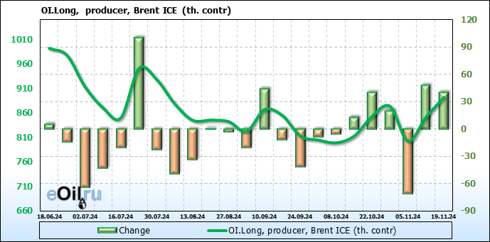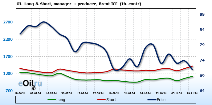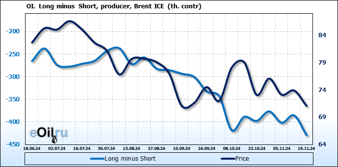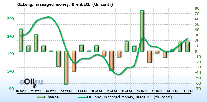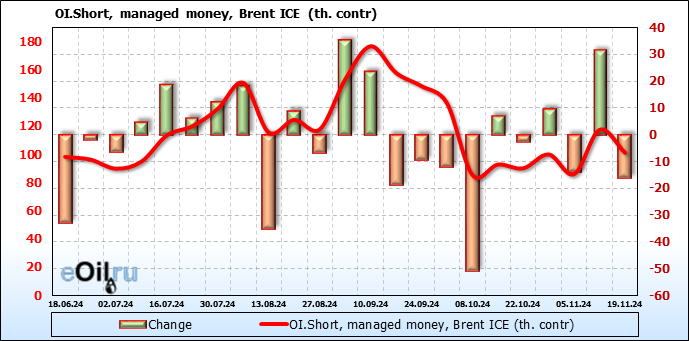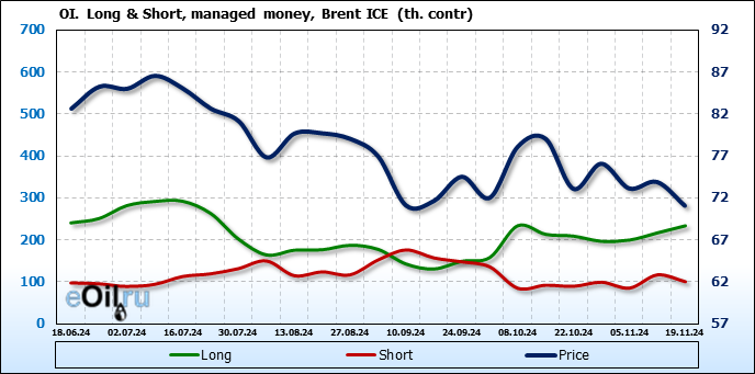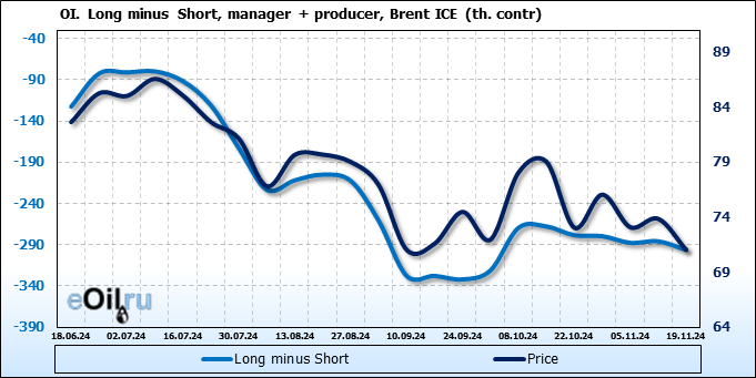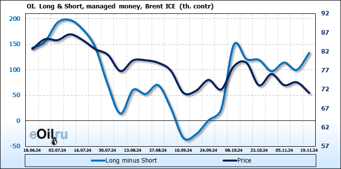 За прошедшую неделю, 13.11.24 — 19.11.24, разница между длинными и короткими позициями управляющих увеличилась на 33.3 тыс. контрактов. В тоже время, цена упала на 2.83 доллара.