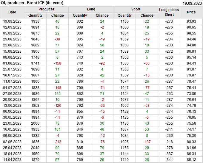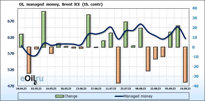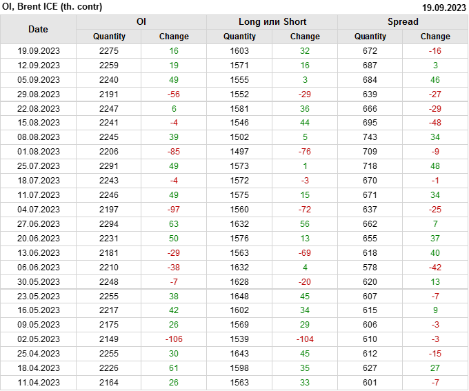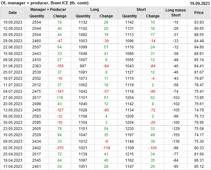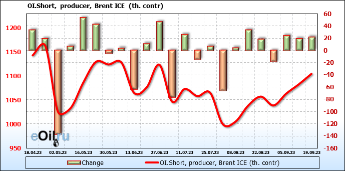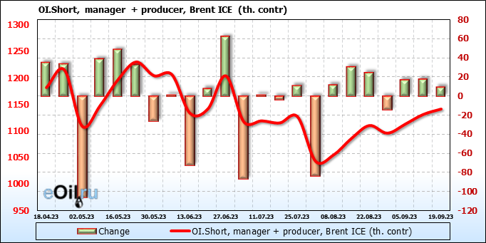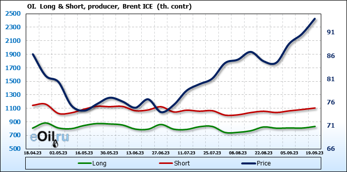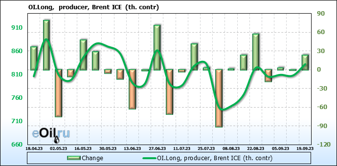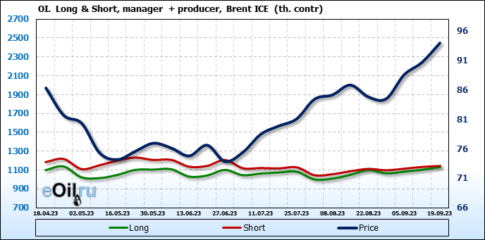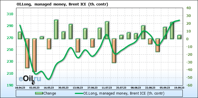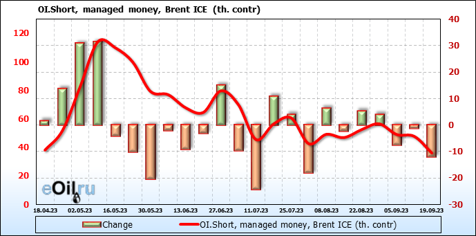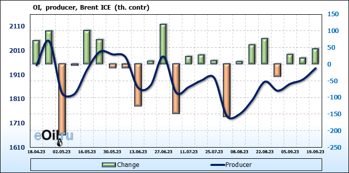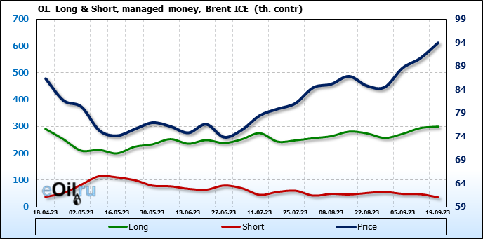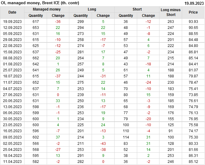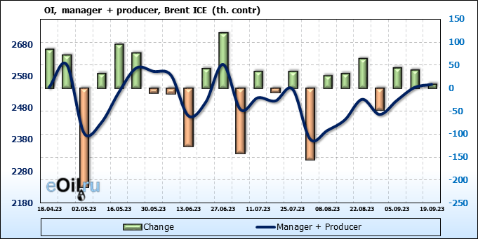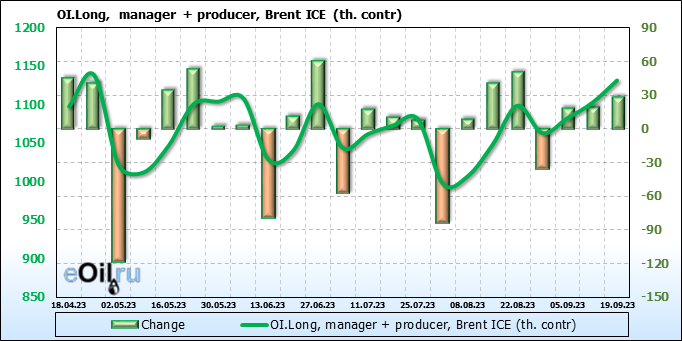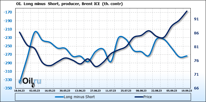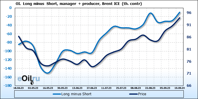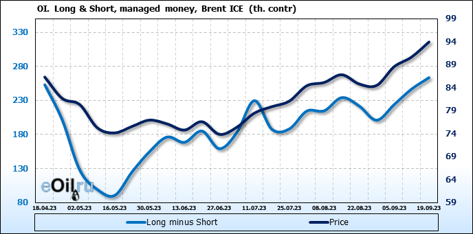 За прошедшую неделю, 13.09.23 — 19.09.23, разница между длинными и короткими позициями управляющих увеличилась на 16.8 тыс. контрактов. В тоже время, цена выросла на 3.28 доллара.