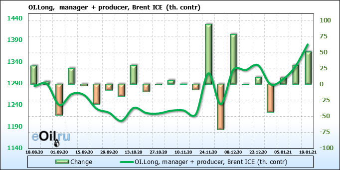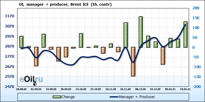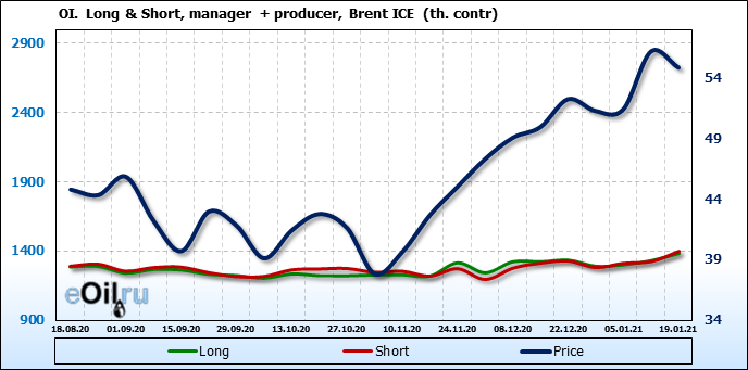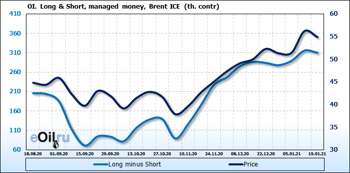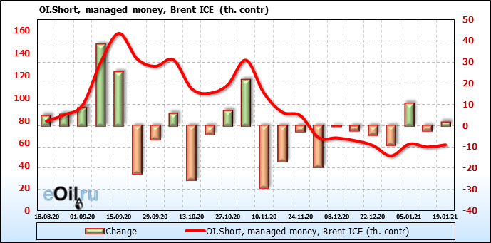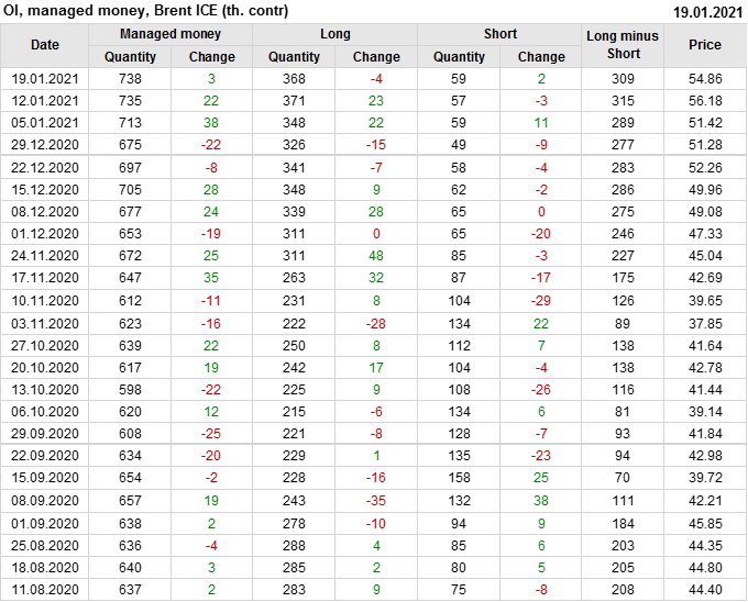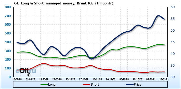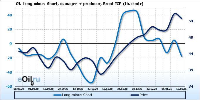 За прошлую неделю, 13.01.21 — 19.01.21, разница между длинными и короткими позициями управляющих упала на 5 тыс. контрактов. В тоже время, цена упала на 1.328 доллара. Наращивание коротких позиций спекулянтами приводит к падению цен. Если давление со стороны медведей продолжится, то мы можем увидеть новые минимумы.