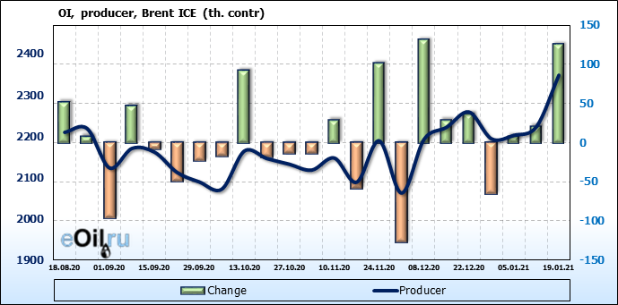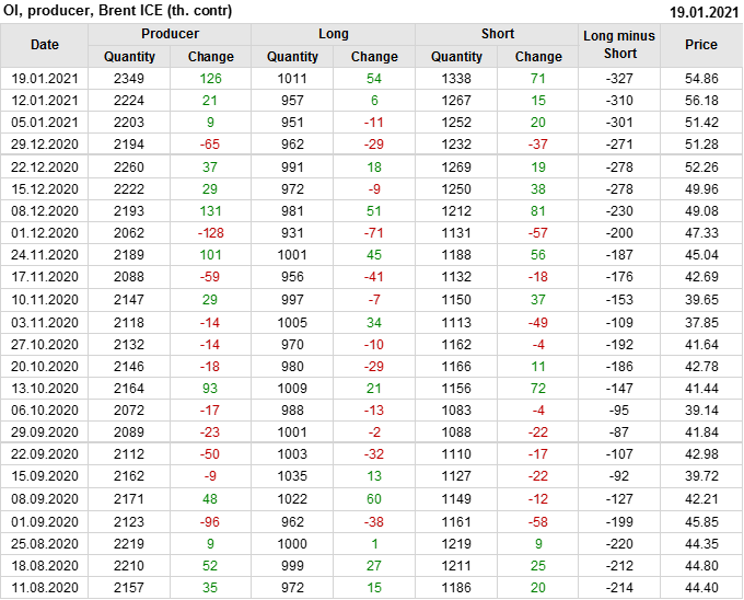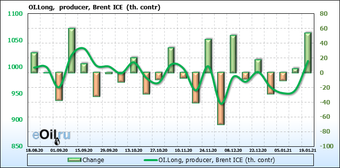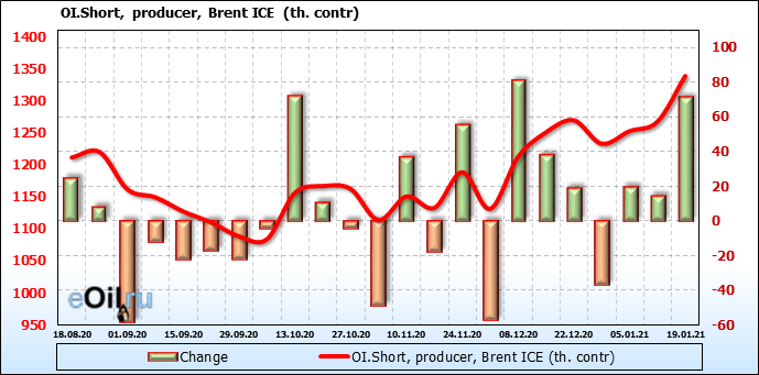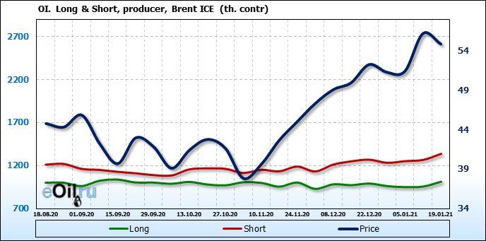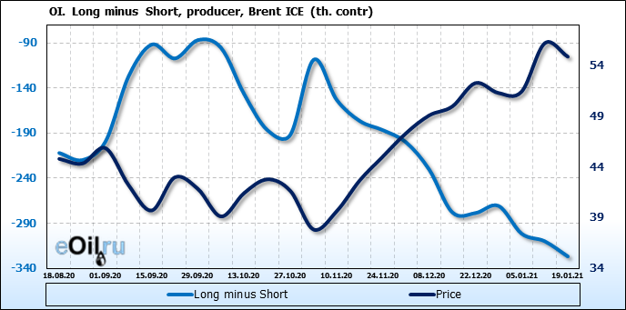 За прошлую неделю, 13.01.21 — 19.01.21, разница между длинными и короткими позициями производителей упала на 17 тыс. контрактов. В тоже время, цена упала на 1.328 доллара. Производители наращивают короткие позиции, что не дает цене расти. В такой ситуации на рынке возможно ускорение падения цен.