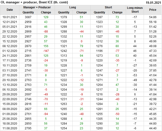 За прошлую неделю, 13.01.21 — 19.01.21, разница между длинными и короткими позициями производителей и управляющих упала на 22 тыс. контрактов. За отчетный период времени, цена упала на 1.328 доллара. Производители и управляющие на отчетной недели были склонны продавать. Суммарное число шортов было выше суммарного числа лонгов. Цены также снижаются, что создает привлекательные условия для продавцов в среднесрочной перспективе, одна — две недели.