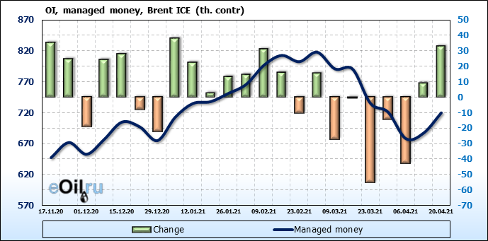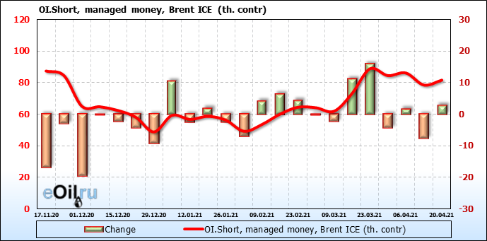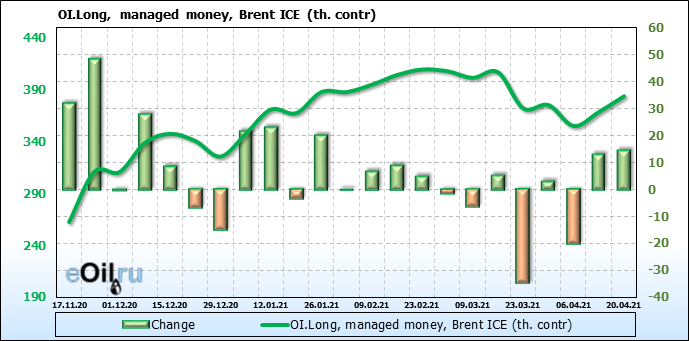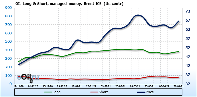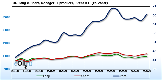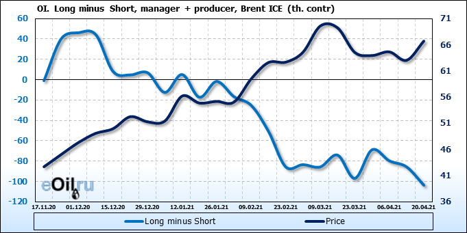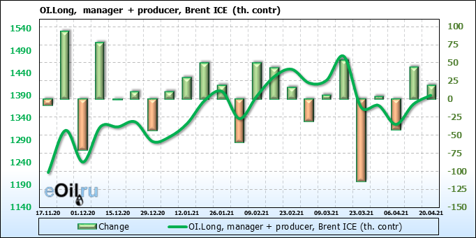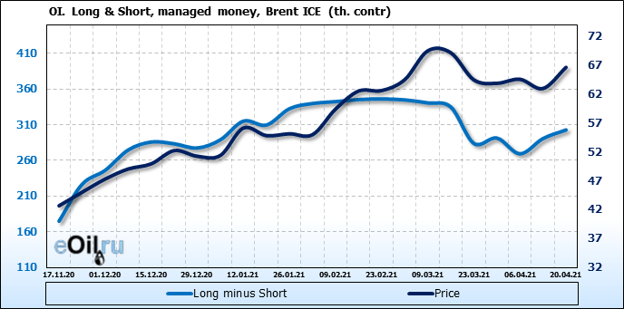 За прошлую неделю, 14.04.21 — 20.04.21, разница между длинными и короткими позициями управляющих выросла на 12 тыс. контрактов. В тоже время, цена выросла на 3.676 доллара. Управляющие наращивают позиции, разгоняя тем самым рост цен, что говорит нам о текущей силе рынка.