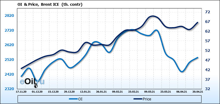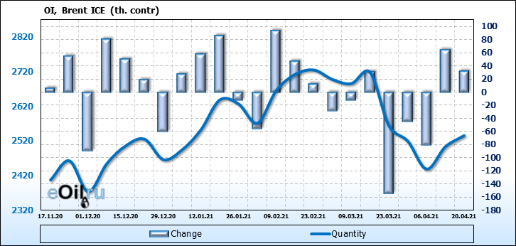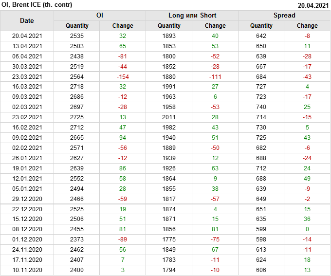 За прошлую неделю, 14.04.21 — 20.04.21, открытый интерес вырос на 32 тыс. контрактов. Объем вовлеченных в торговлю контрактов составляет 2 535 295 штук. Текущее положение дел на рынке таково, что деньги в течение прошлой недели приходили на рынок поддерживая тенденцию.