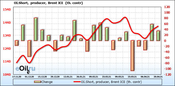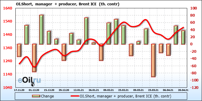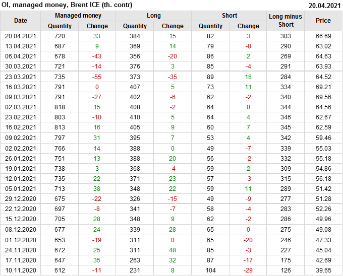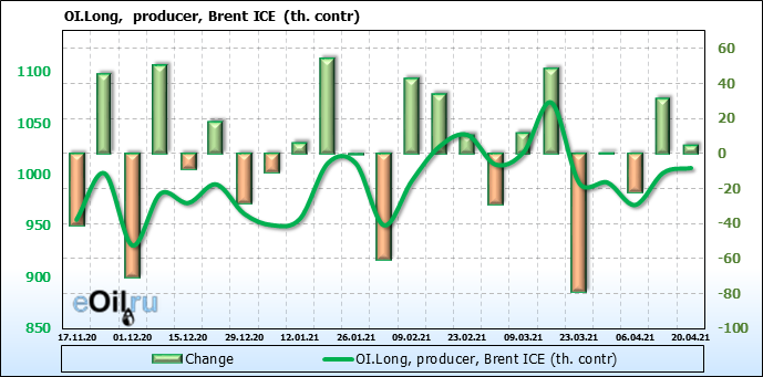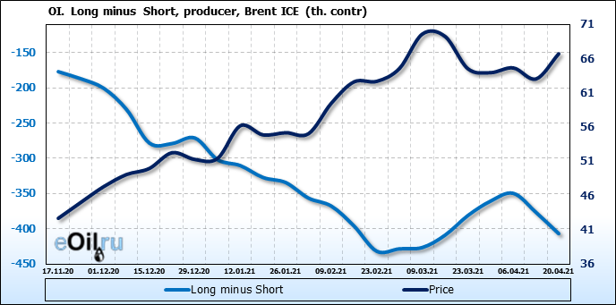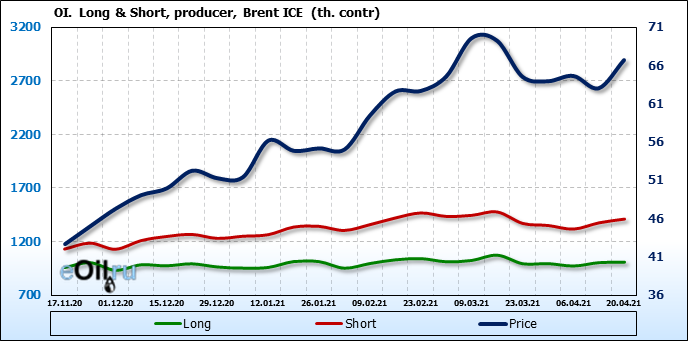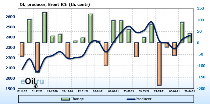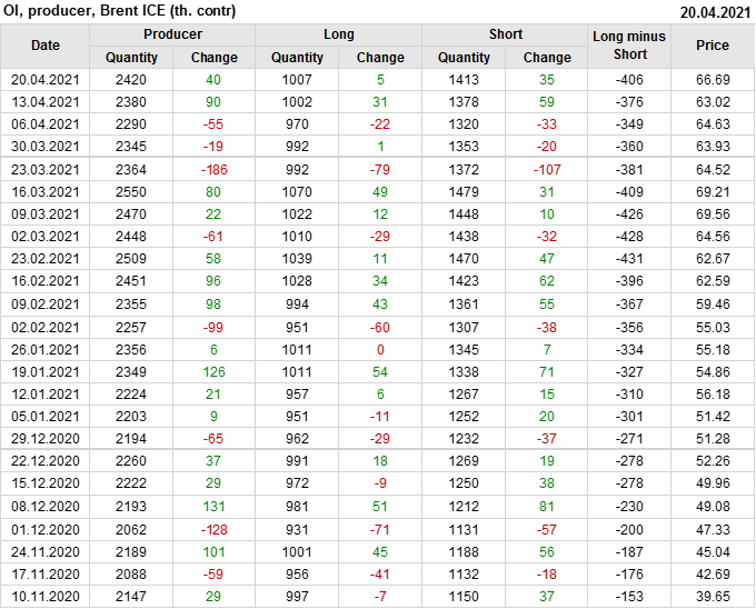 За прошлую неделю, 14.04.21 — 20.04.21, разница между длинными и короткими позициями производителей выросла на 30 тыс. контрактов. В тоже время, цена выросла на 3.676 доллара. Производители увеличивают продажи, предполагая, что текущие уровни являются привлекательными для них. И не смотря на это, рынок продолжает расти, что показывает силу текущего тренда.
