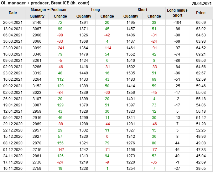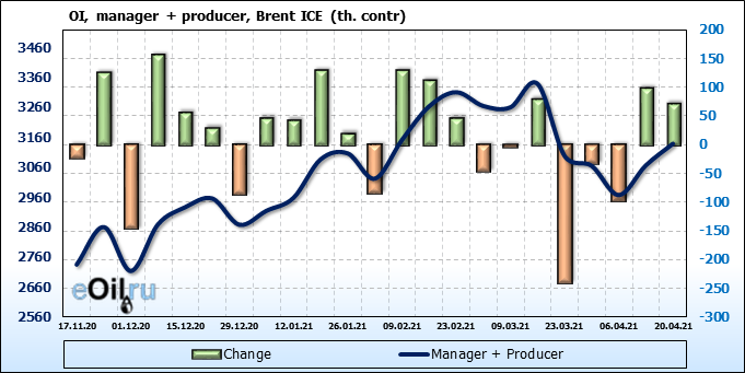 За прошлую неделю, 14.04.21 — 20.04.21, разница между длинными и короткими позициями производителей и управляющих упала на 18 тыс. контрактов. За отчетный период времени, цена выросла на 3.676 доллара. Разница совокупного объема длинных и коротких позиций производителей и управляющих на прошедшей неделе снизилась, в то время как цены выросли. Рынок теряет доверие покупателей, что, при продолжении данной динамики, приведет к стабилизации или падению цен в ближайшее время.