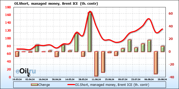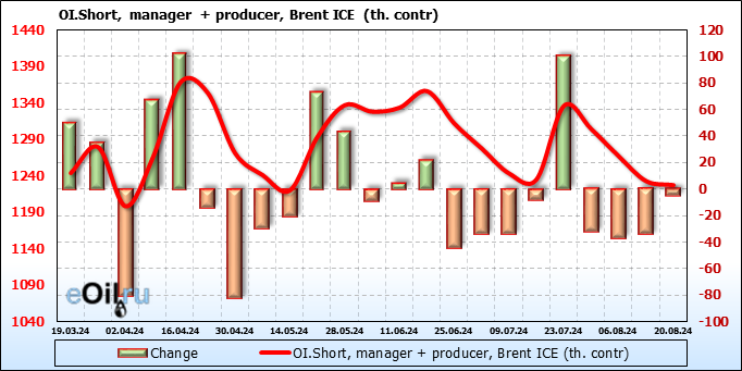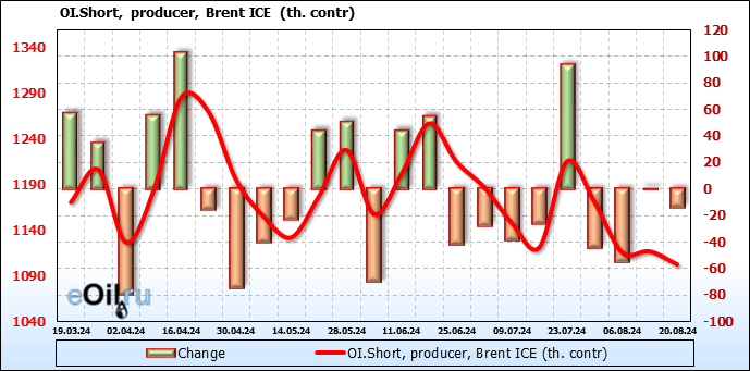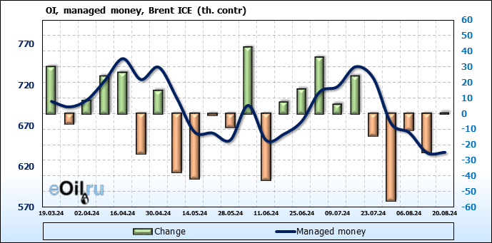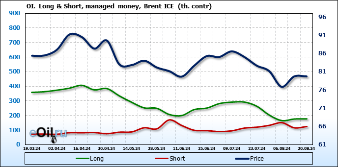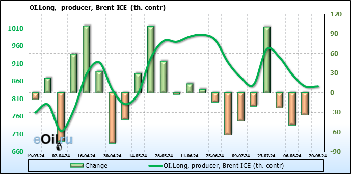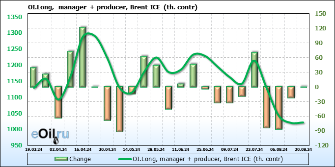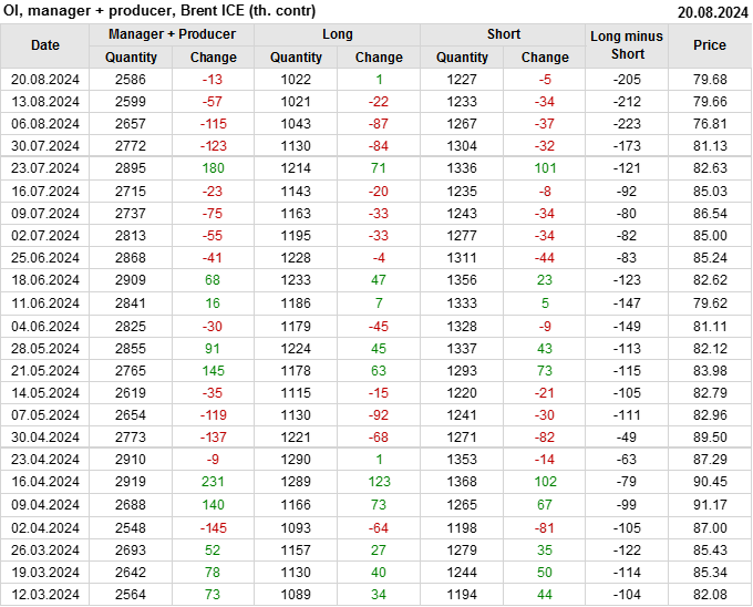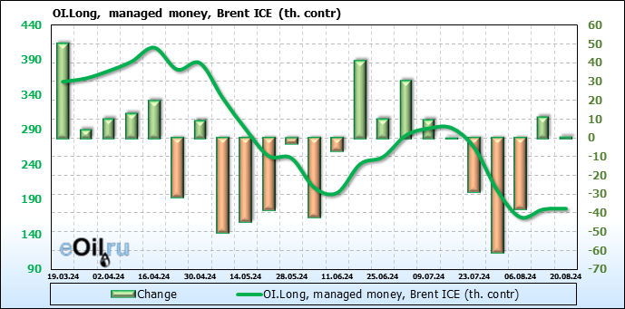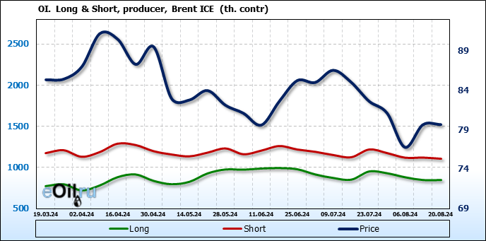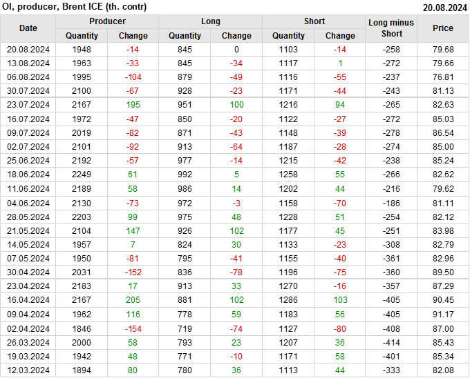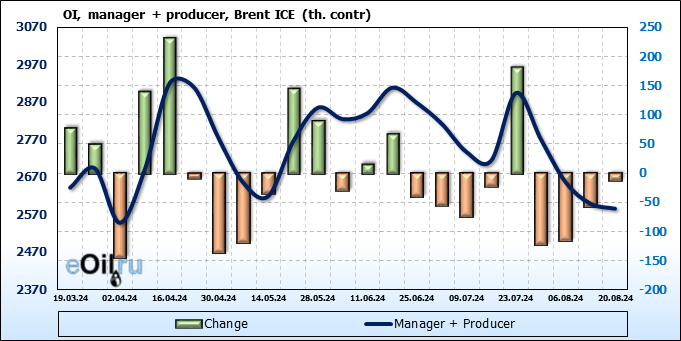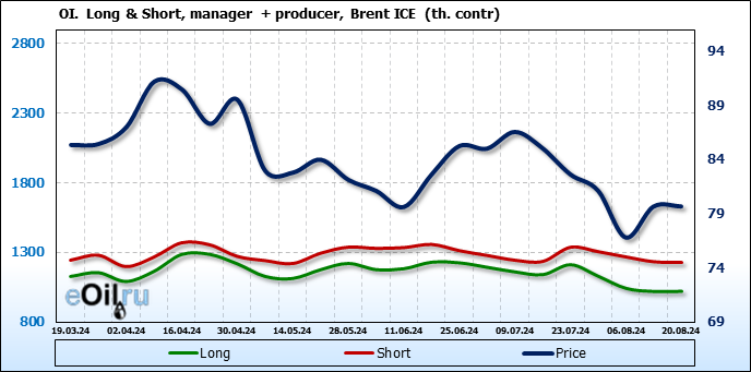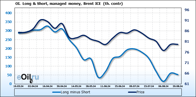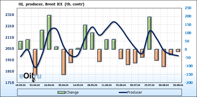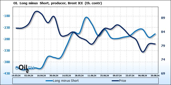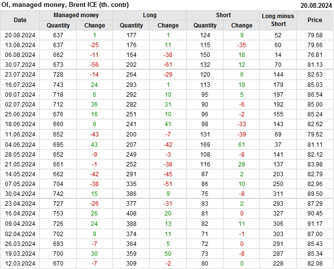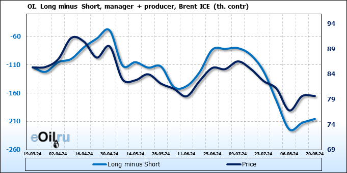 За прошедшую неделю, 14.08.24 — 20.08.24, разница между длинными и короткими позициями управляющих сократилась на 7.9 тыс. контрактов. В тоже время, цена выросла на 0.02 доллара.