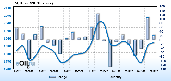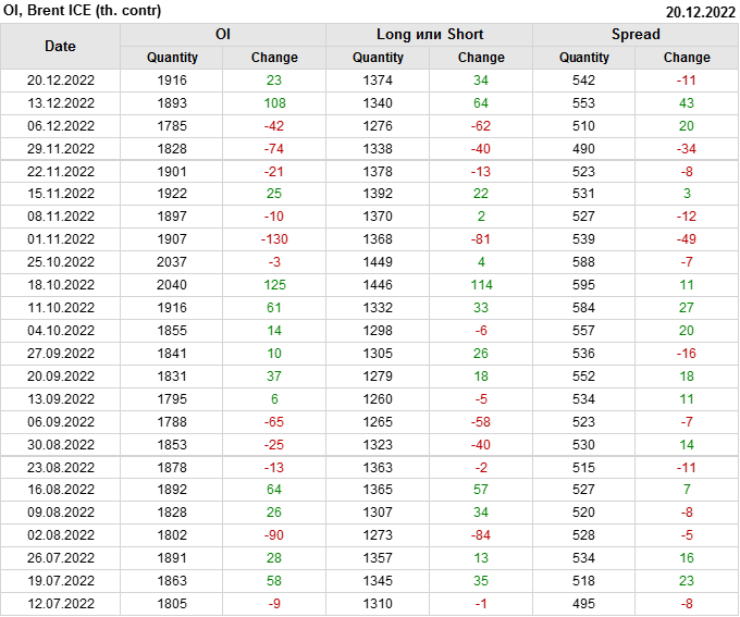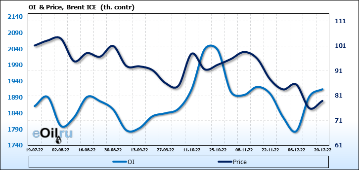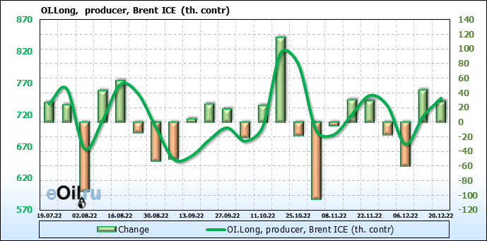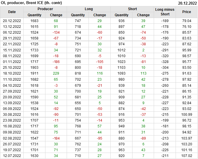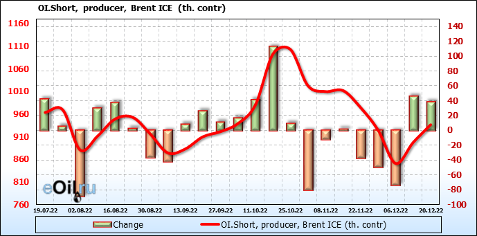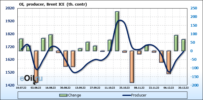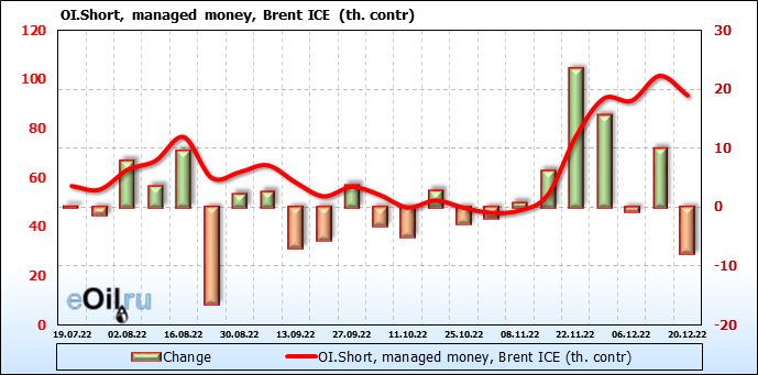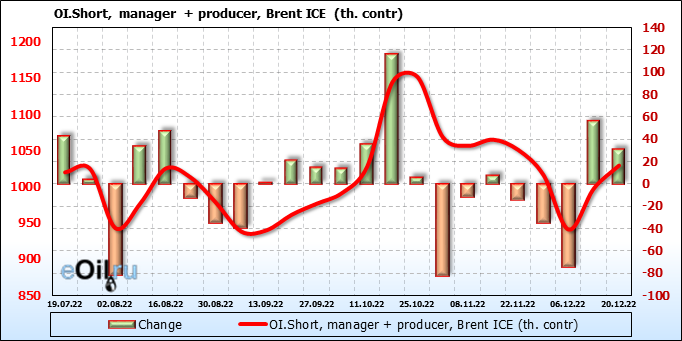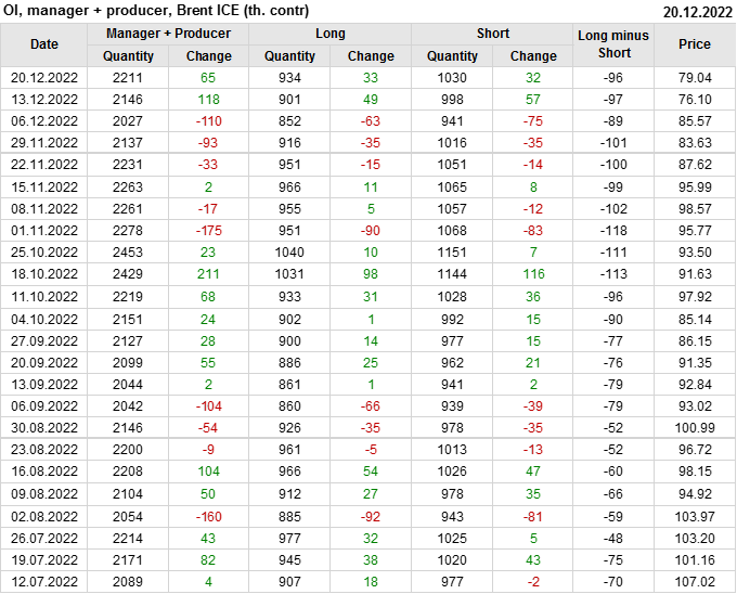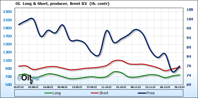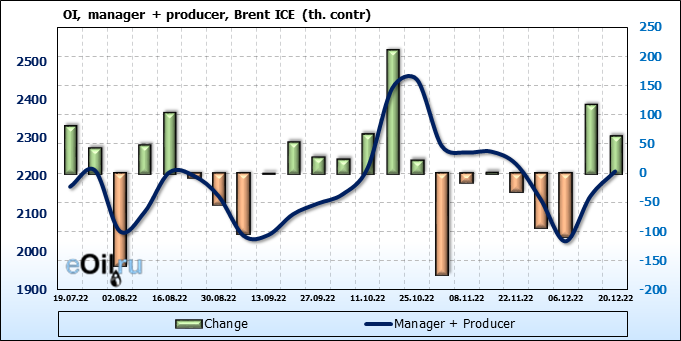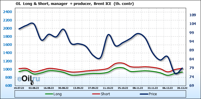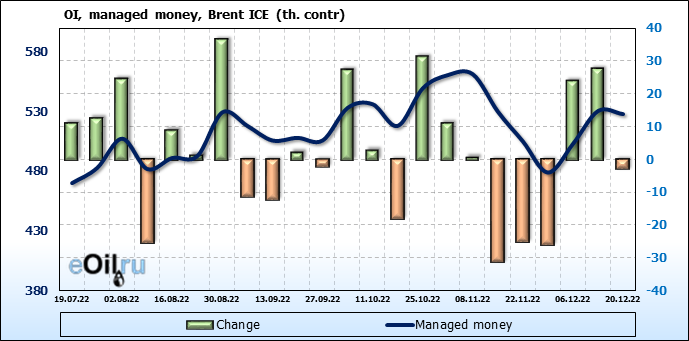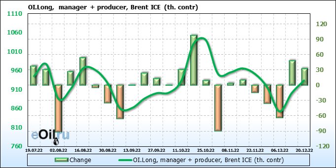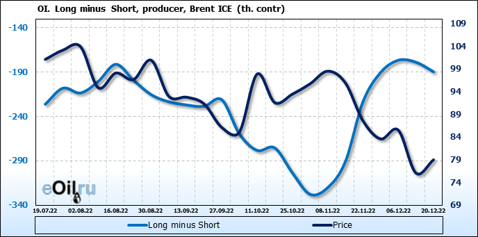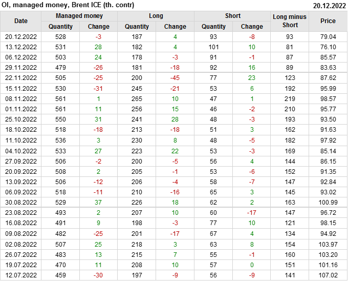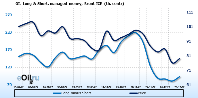 За прошедшую неделю, 14.12.22 — 20.12.22, разница между длинными и короткими позициями управляющих увеличилась на 12.4 тыс. контрактов. В тоже время, цена выросла на 2.94 доллара.