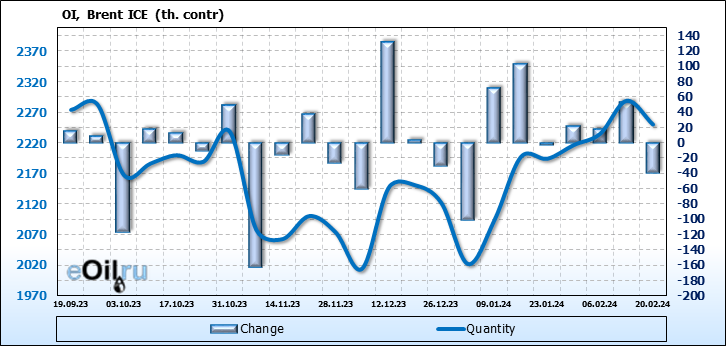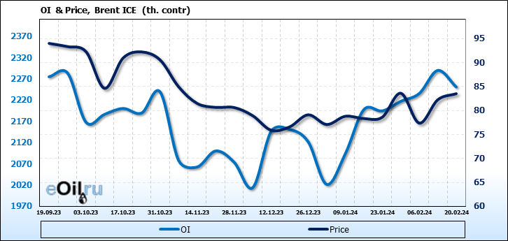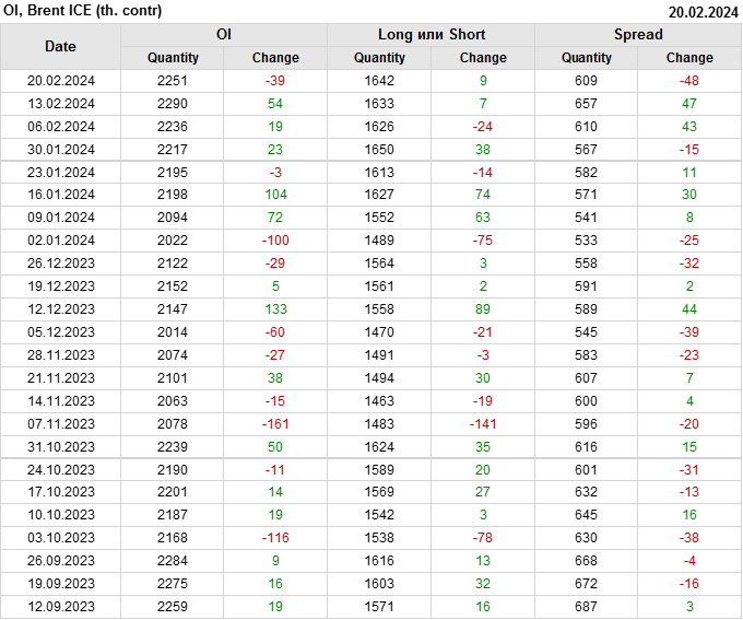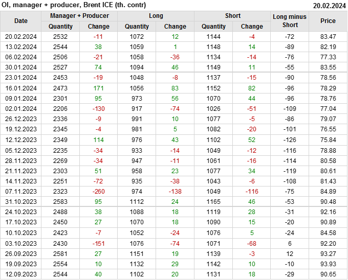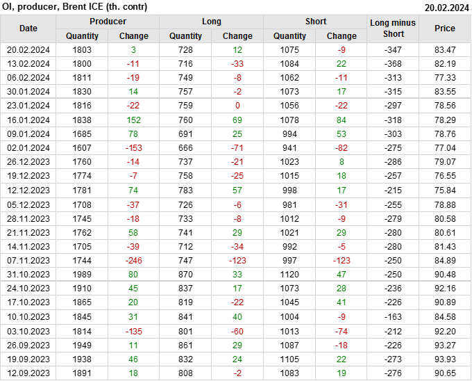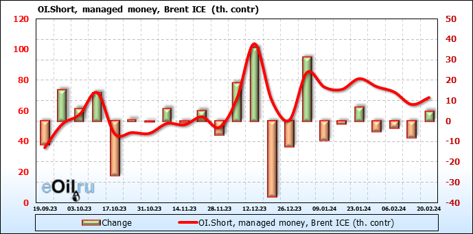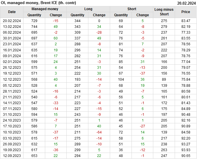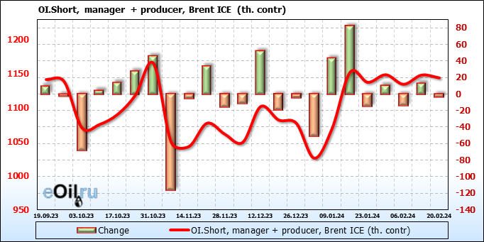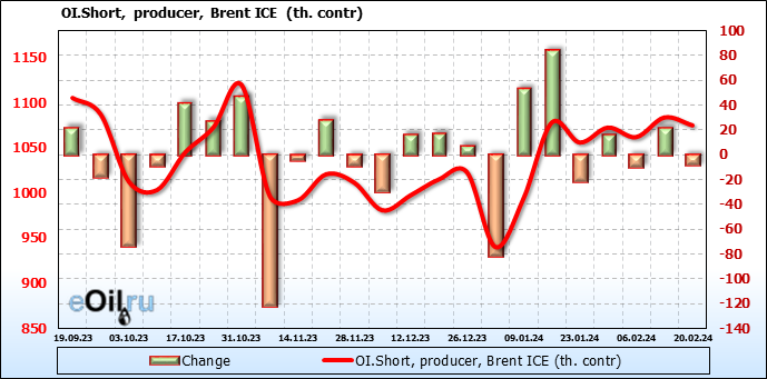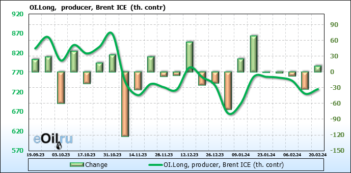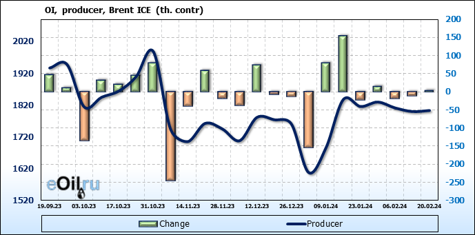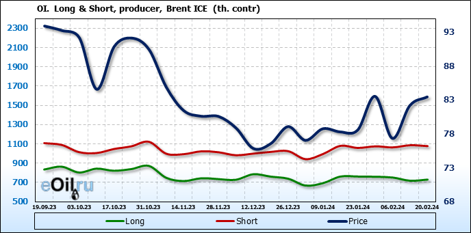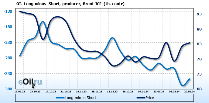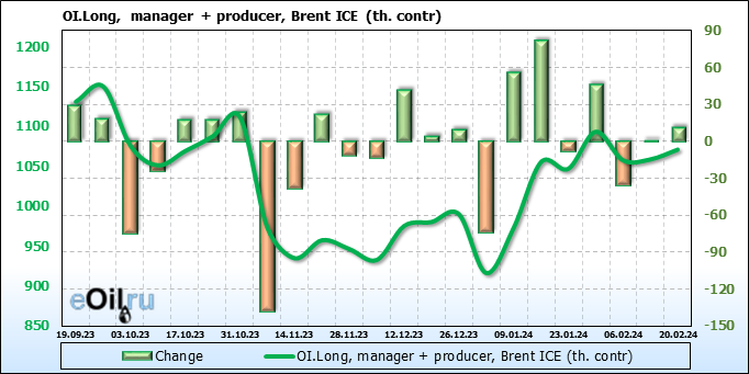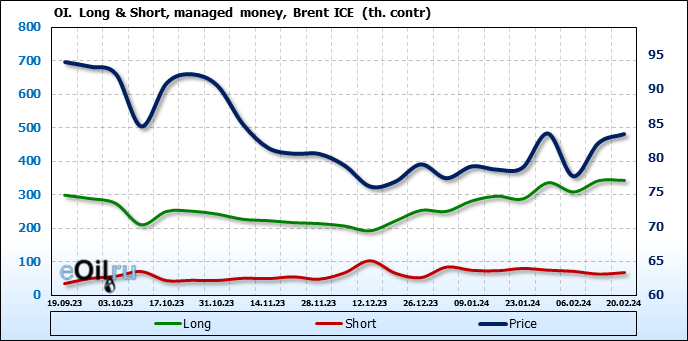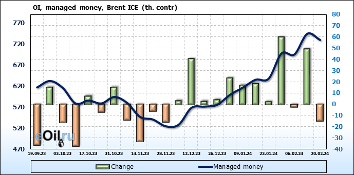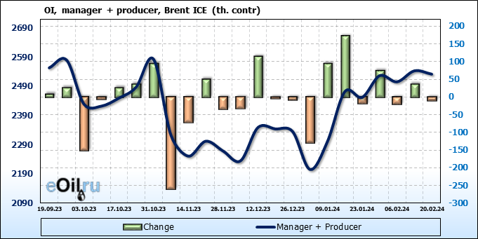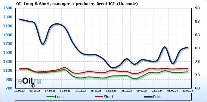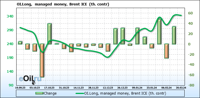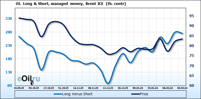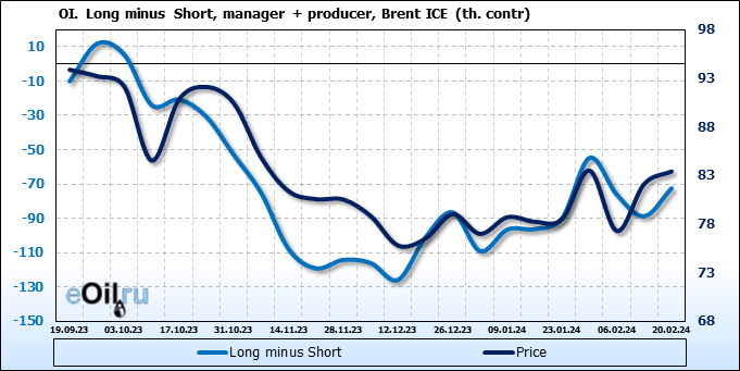 За прошедшую неделю, 14.02.24 — 20.02.24, разница между длинными и короткими позициями управляющих сократилась на 4.2 тыс. контрактов. В тоже время, цена выросла на 1.28 доллара.