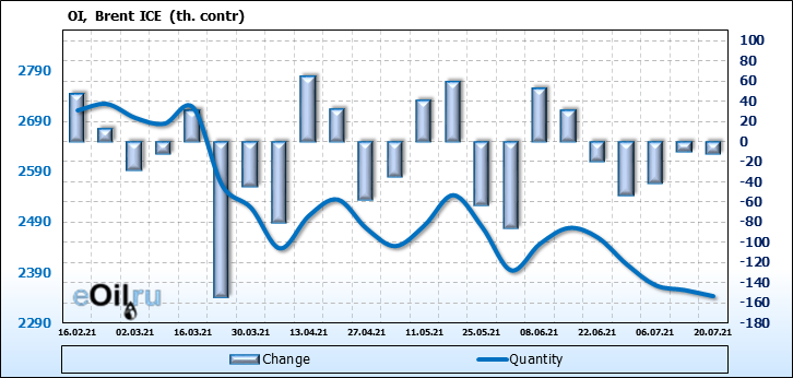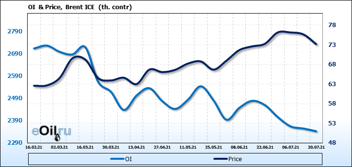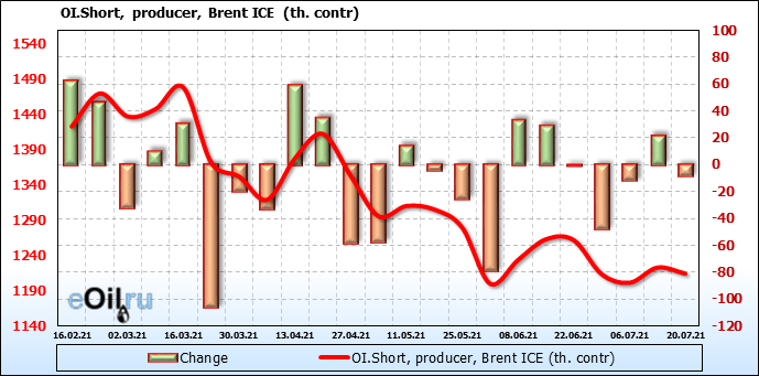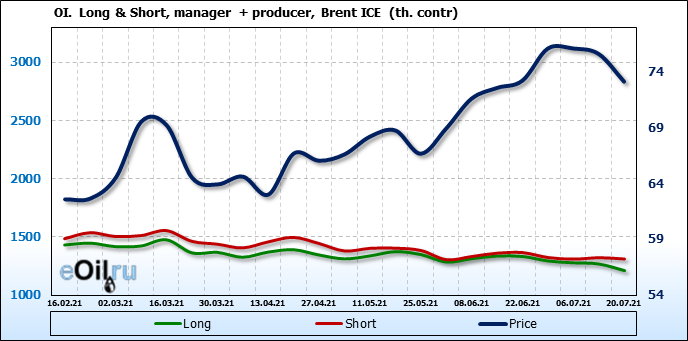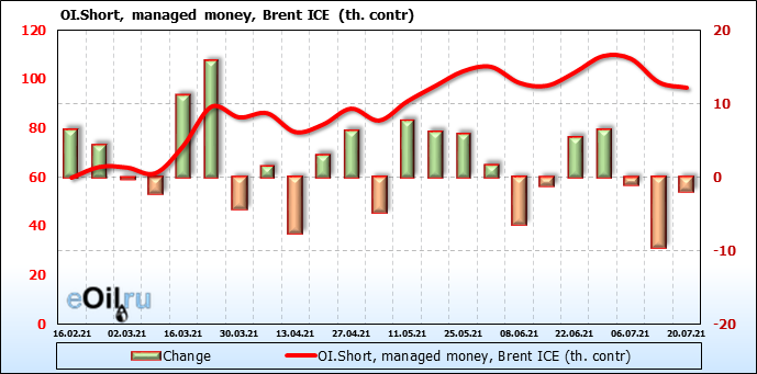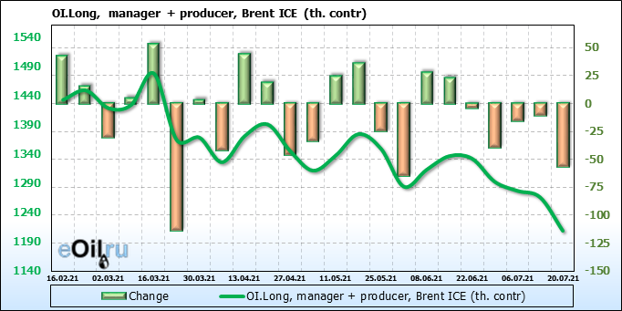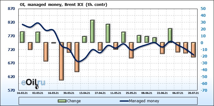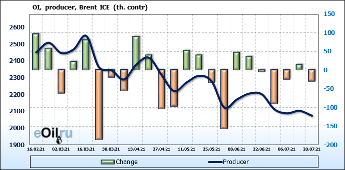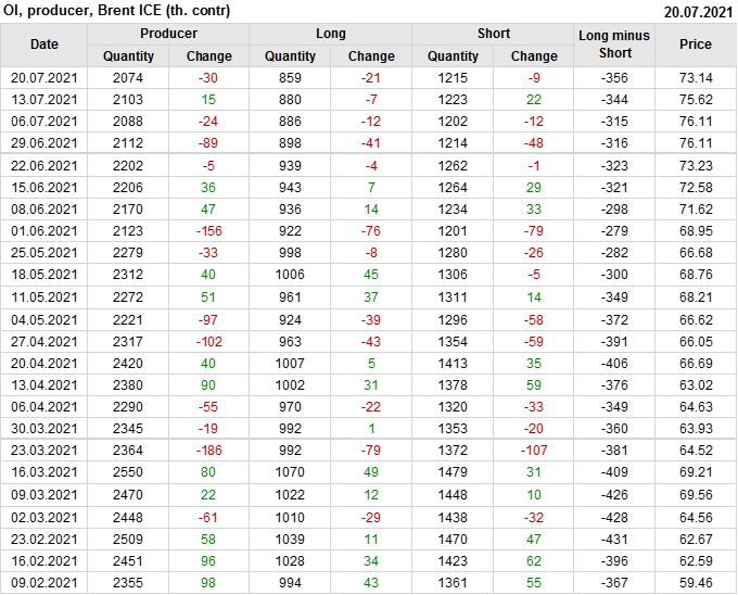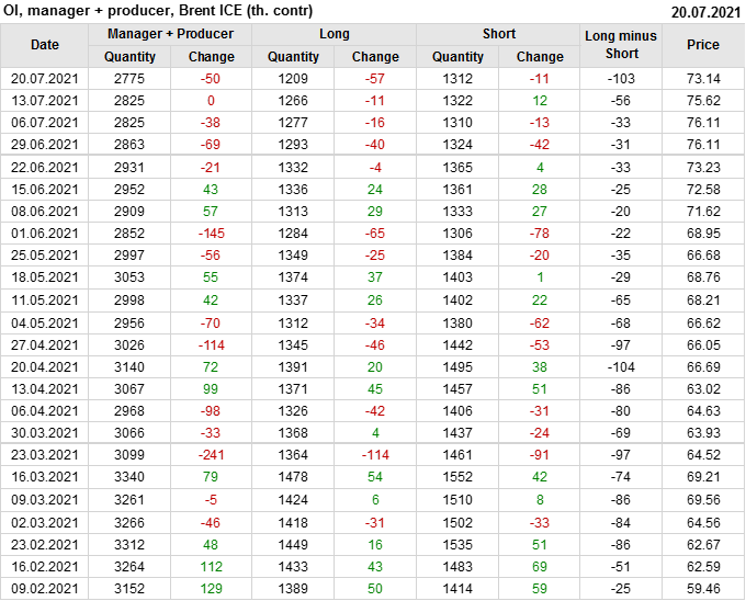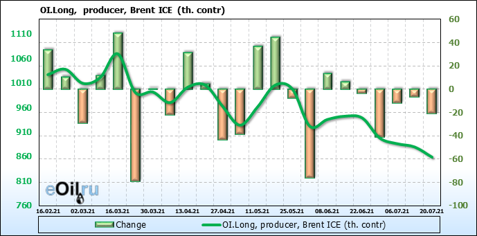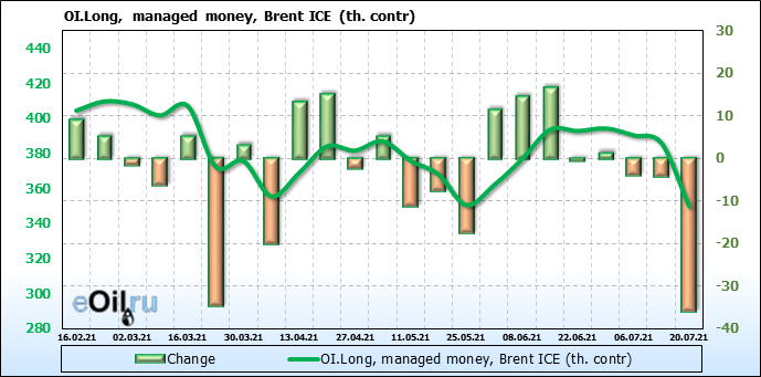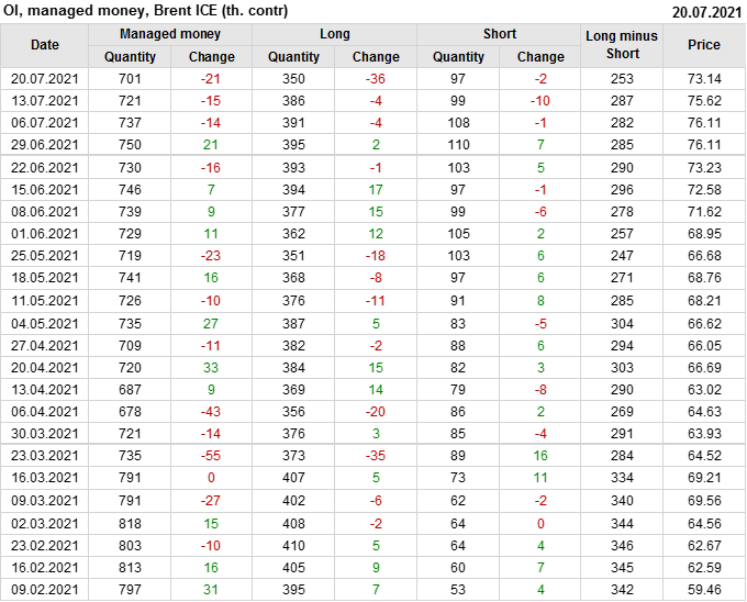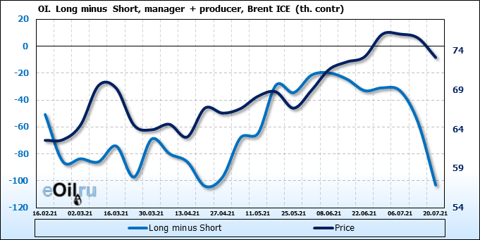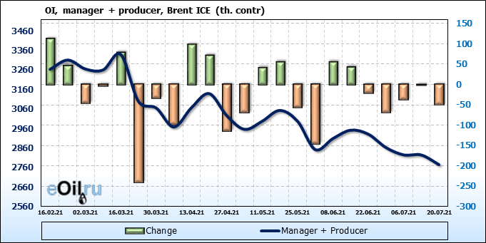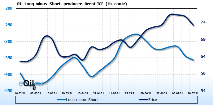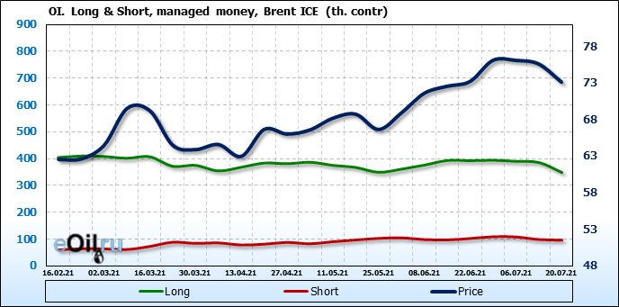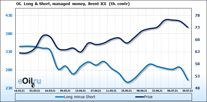 За прошедшую неделю, 14.07.21 — 20.07.21, разница между длинными и короткими позициями управляющих сократилась на 34.2 тыс. контрактов. В тоже время, цена упала на 2.48 доллара.