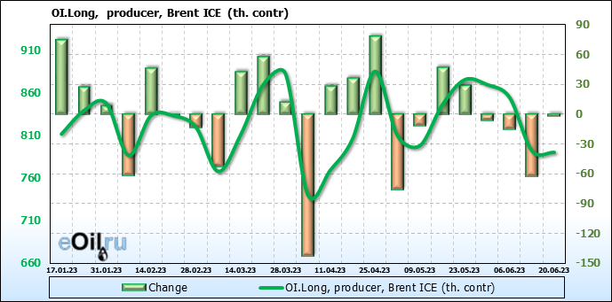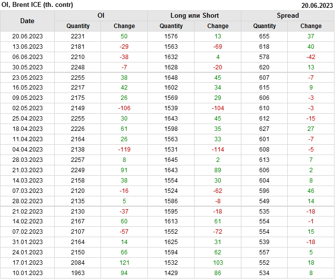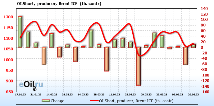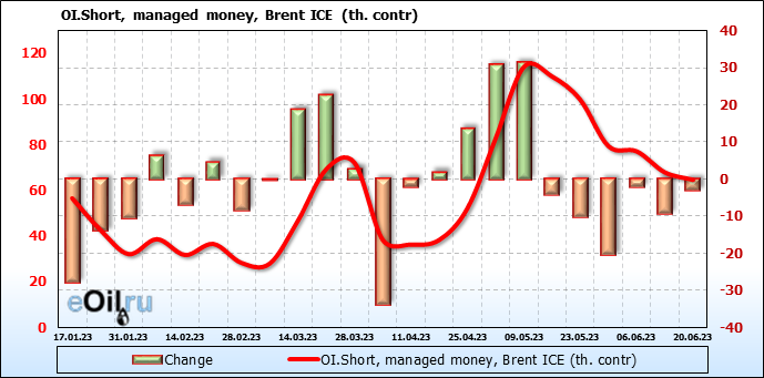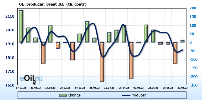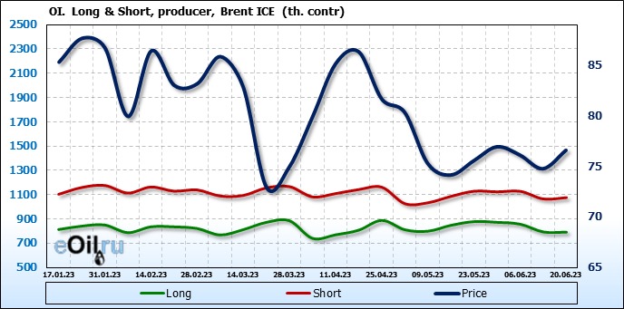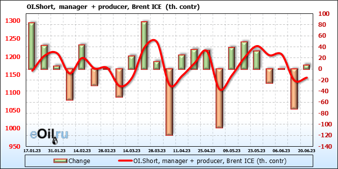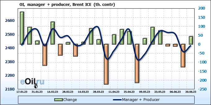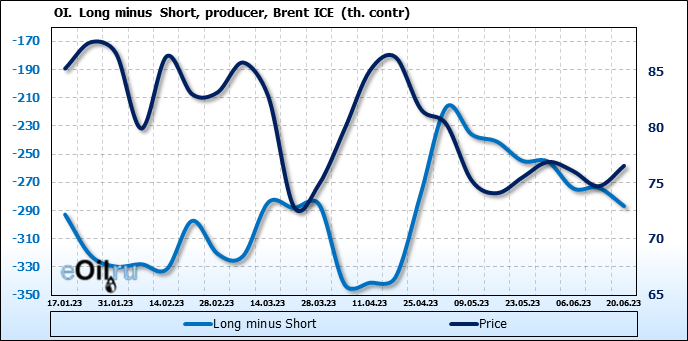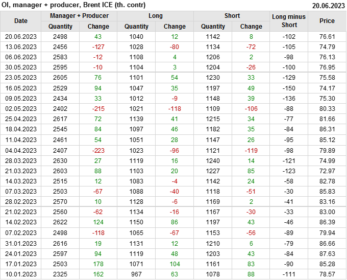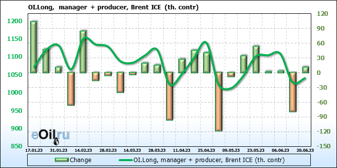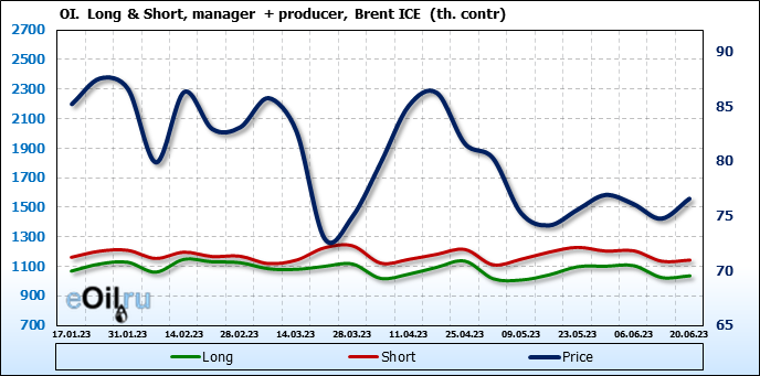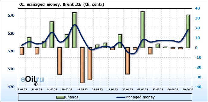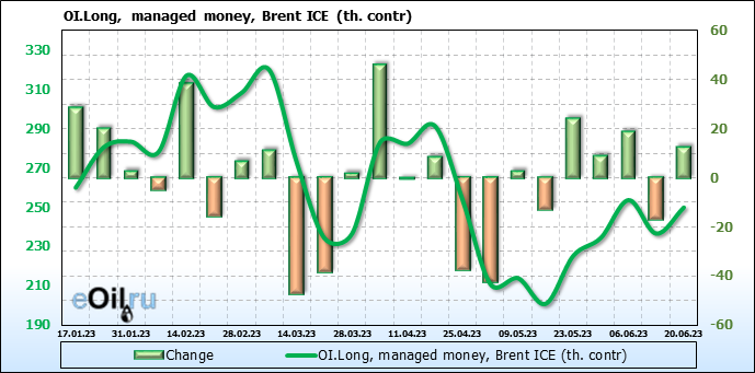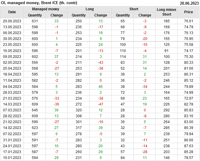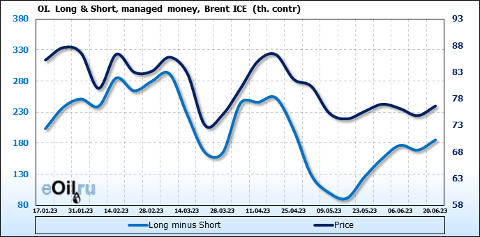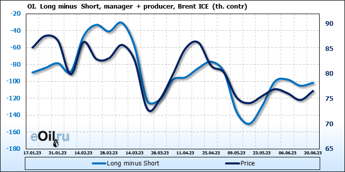 За прошедшую неделю, 14.06.23 — 20.06.23, разница между длинными и короткими позициями управляющих увеличилась на 16.6 тыс. контрактов. В тоже время, цена выросла на 1.82 доллара.