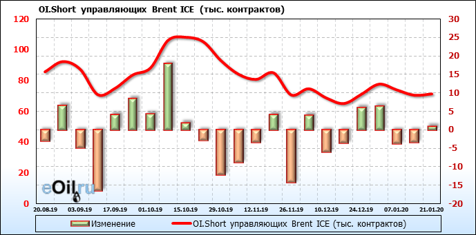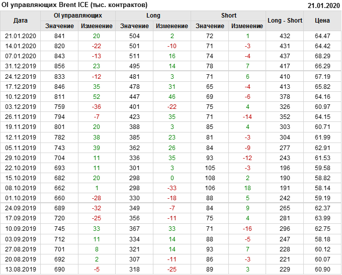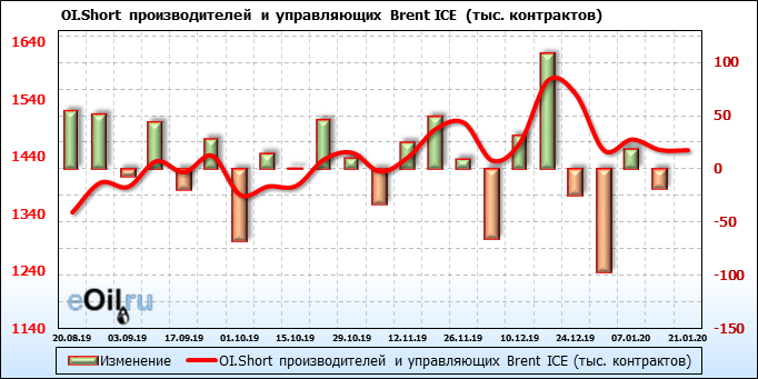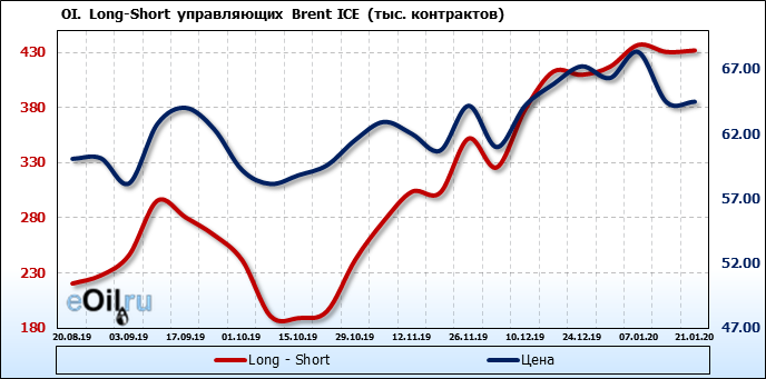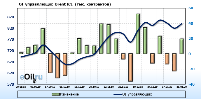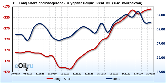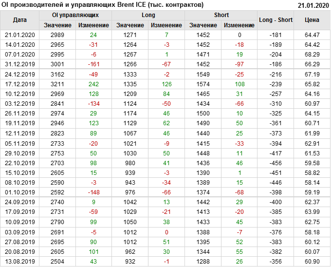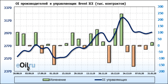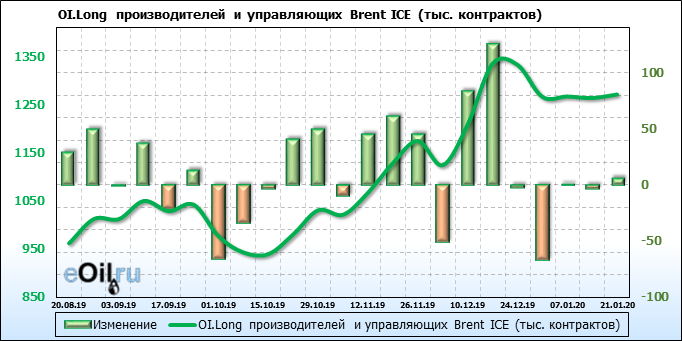 За прошлую неделю, 15.01.20 — 21.01.20, разница между длинными и короткими позициями управляющих выросла на 1 тыс. контрактов. В тоже время, цена выросла на 0.05 доллара. Управляющие наращивают позиции, разгоняя тем самым рост цен, что говорит нам о текущей силе рынка.
