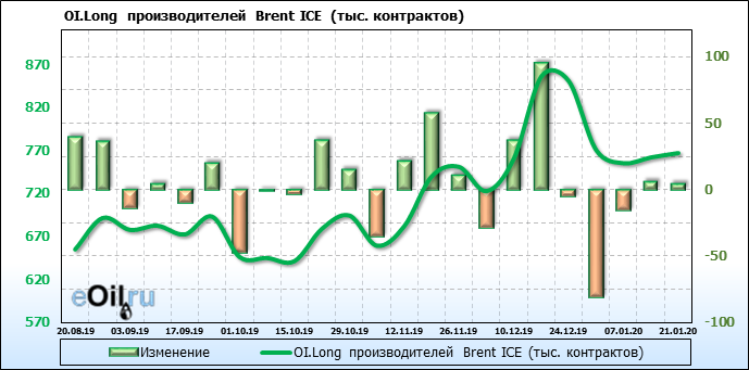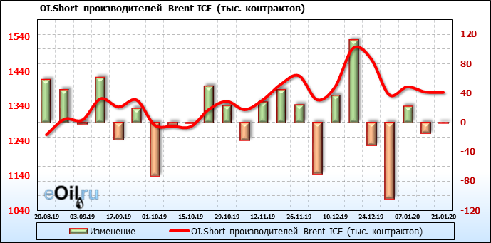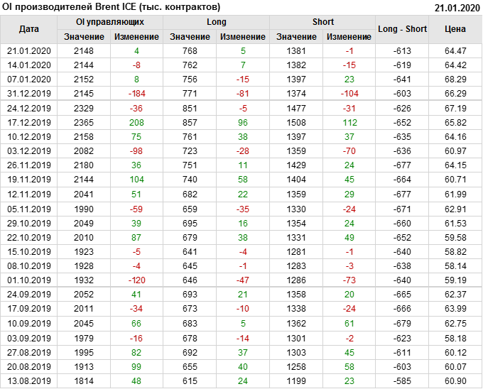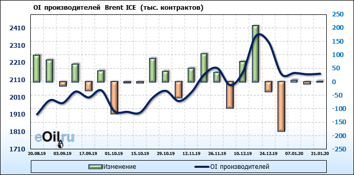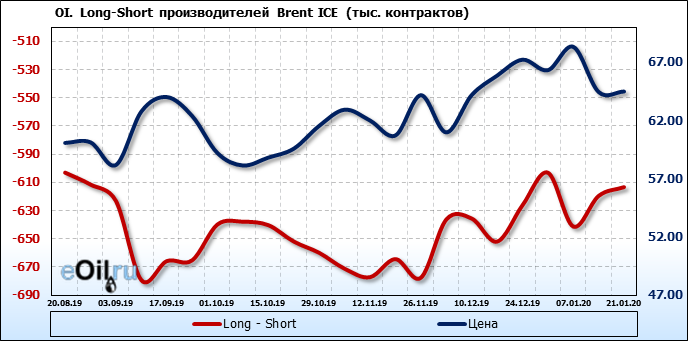 За прошлую неделю, 15.01.20 — 21.01.20, разница между длинными и короткими позициями производителей выросла на 6 тыс. контрактов. В тоже время, цена выросла на 0.05 доллара. Производители не торопятся наращивать продажи, предполагая, что возможен рост цены в ближайшее время.