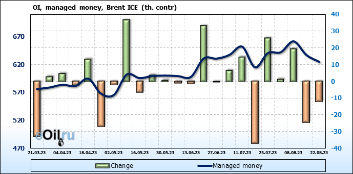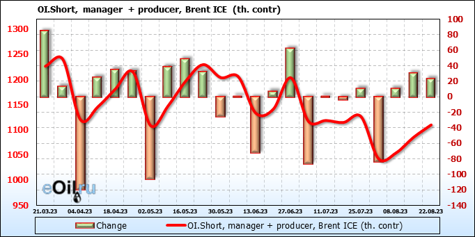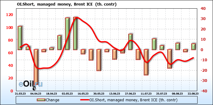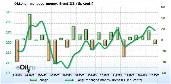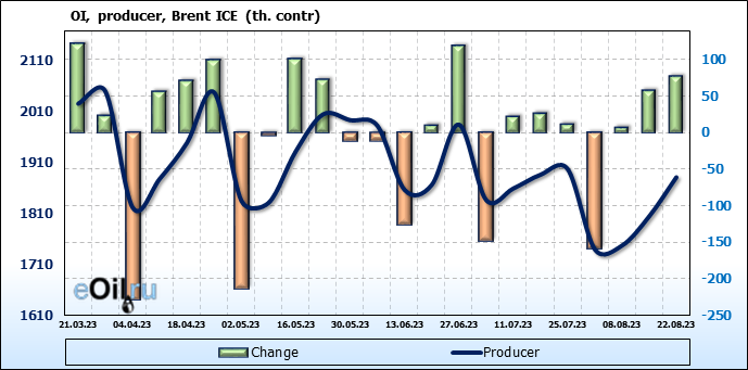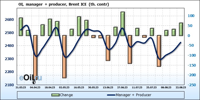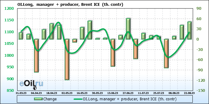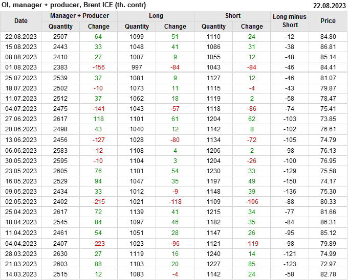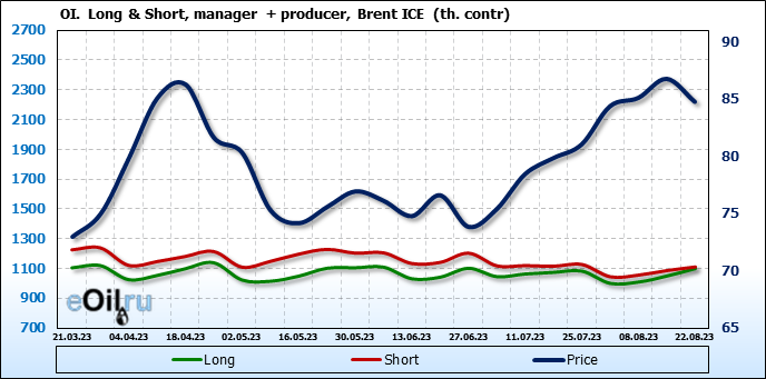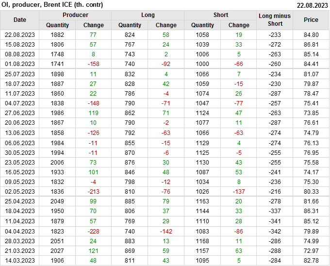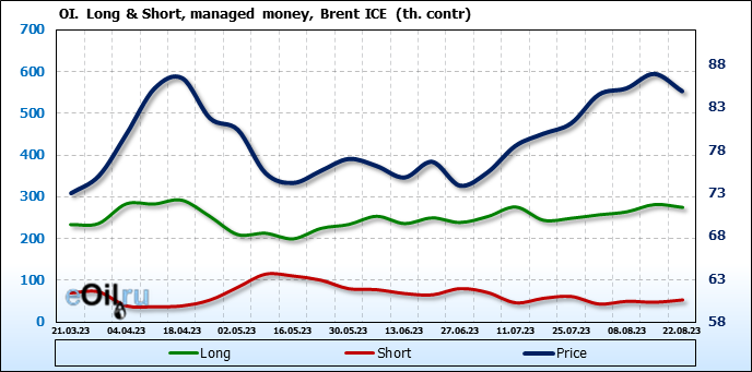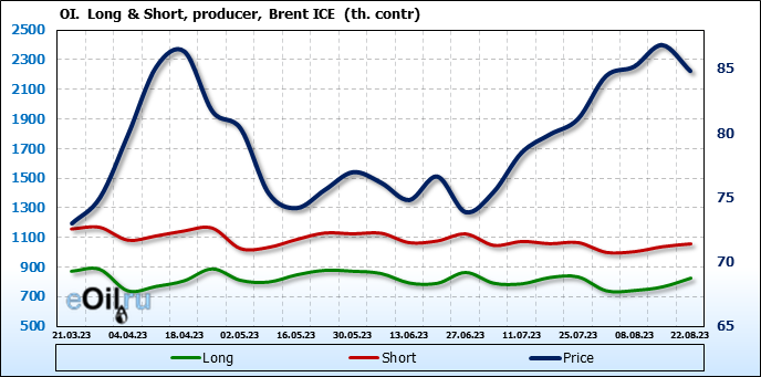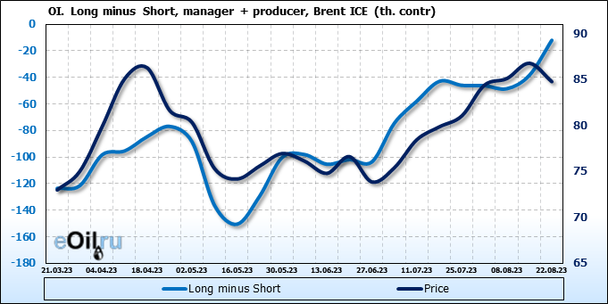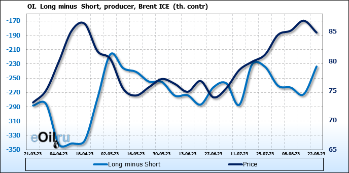 За прошедшую неделю, 16.08.23 — 22.08.23, разница между длинными и короткими позициями управляющих сократилась на 12.4 тыс. контрактов. В тоже время, цена упала на 2.01 доллара.