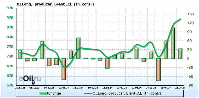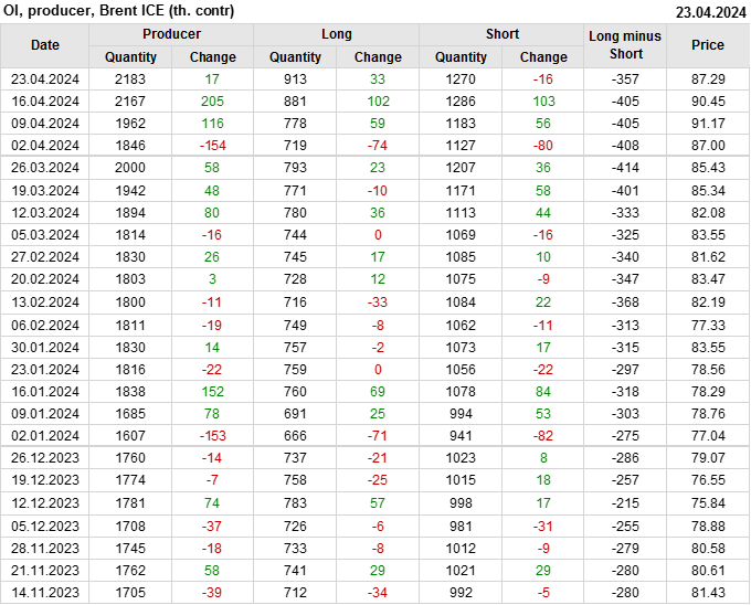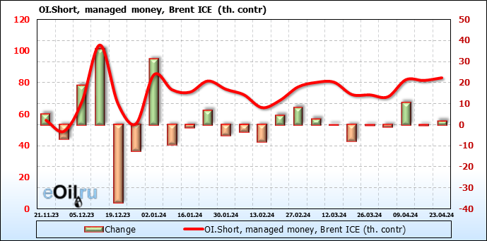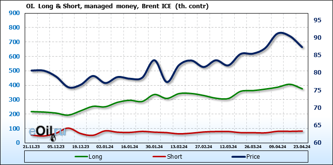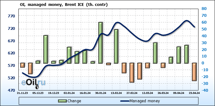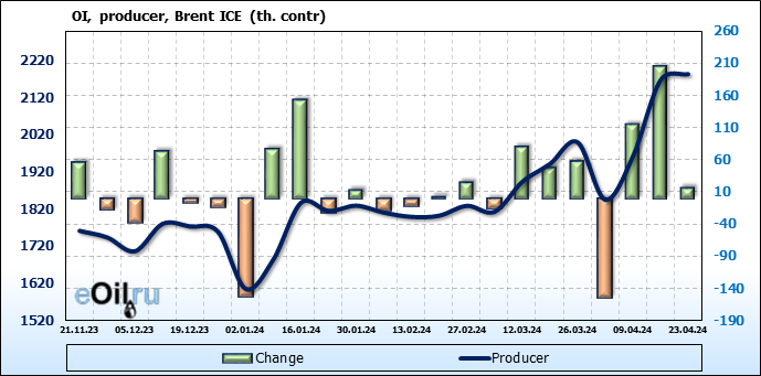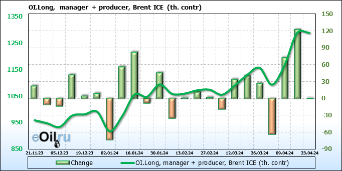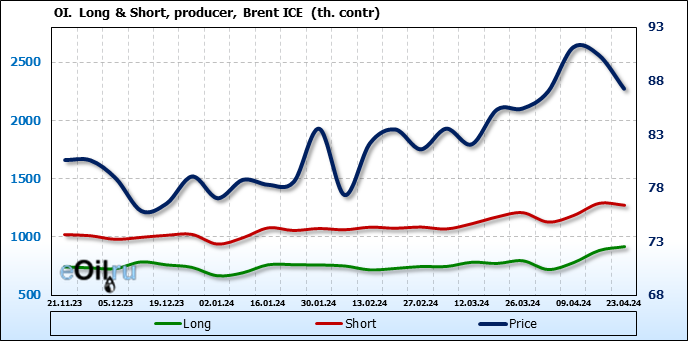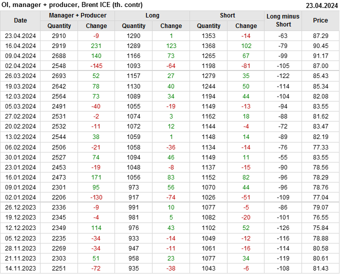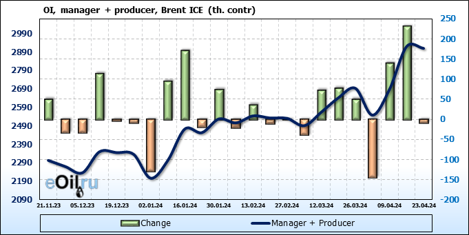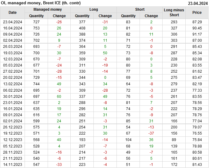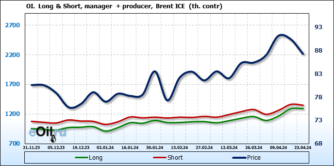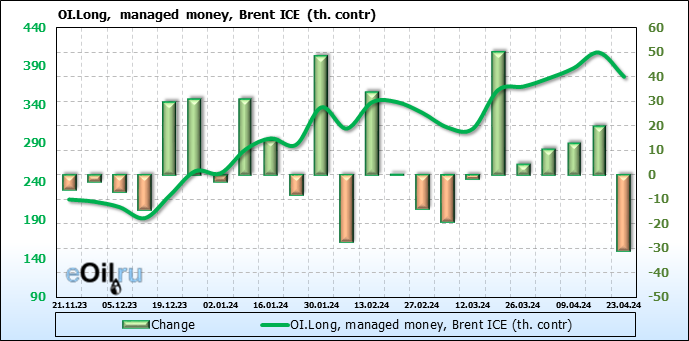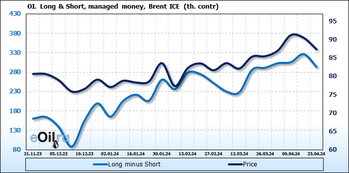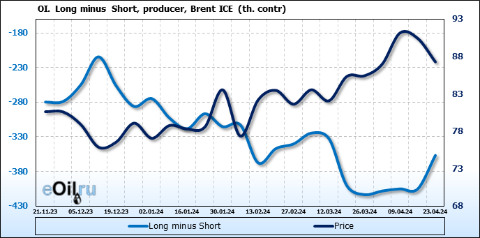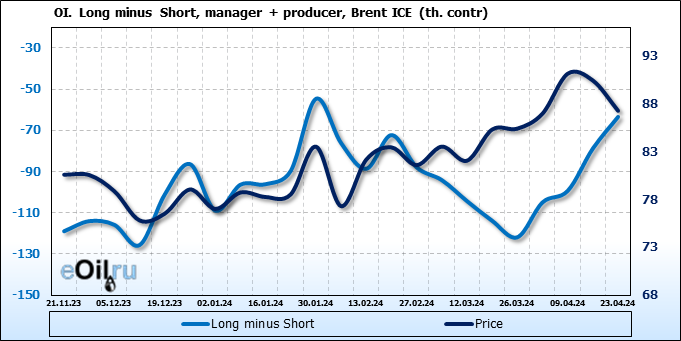 За прошедшую неделю, 17.04.24 — 23.04.24, разница между длинными и короткими позициями управляющих сократилась на 33.2 тыс. контрактов. В тоже время, цена упала на 3.16 доллара.