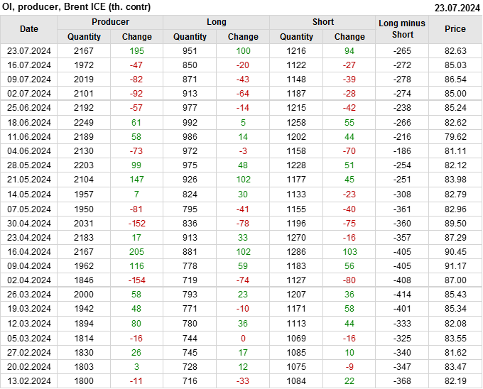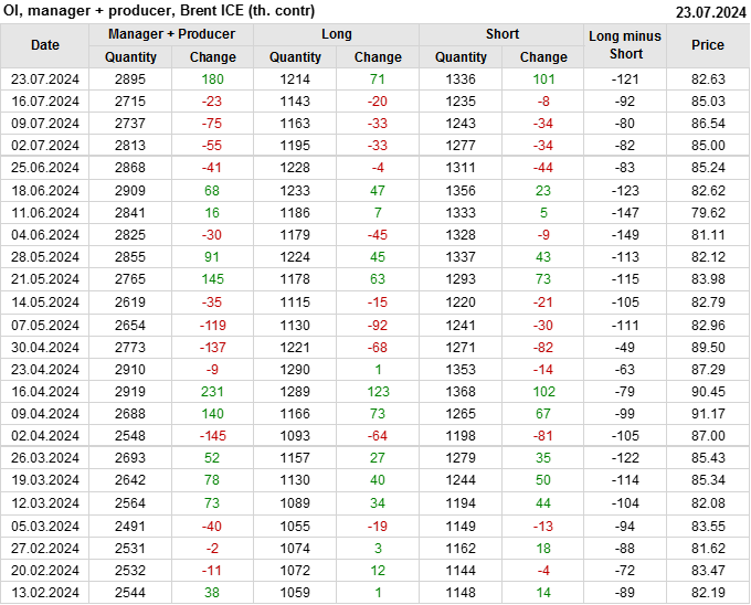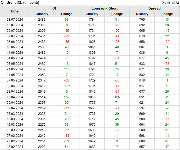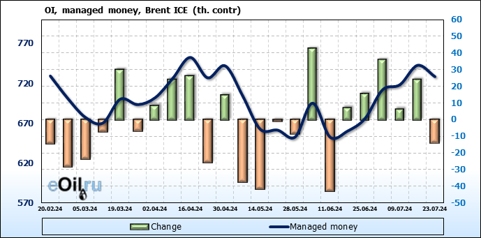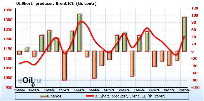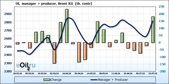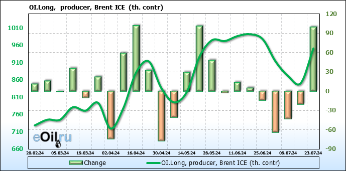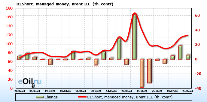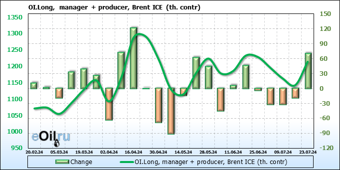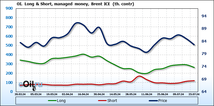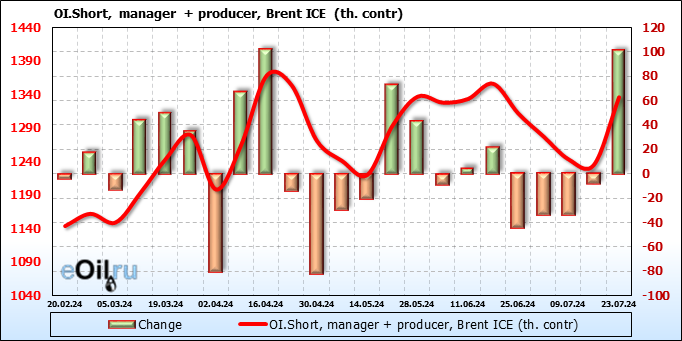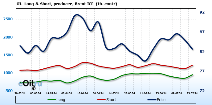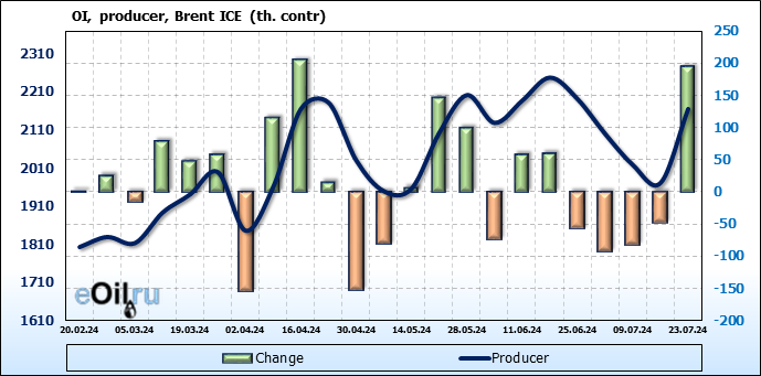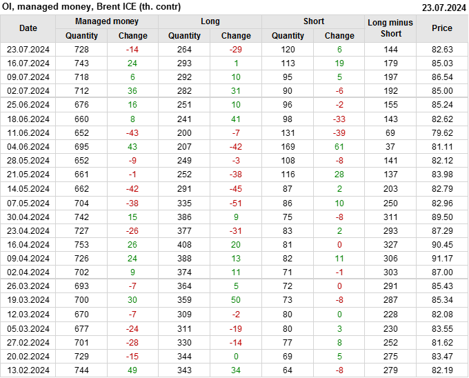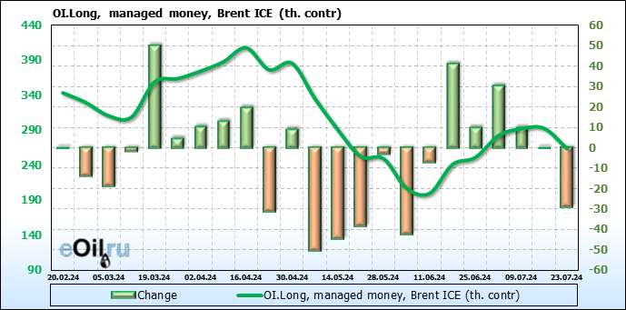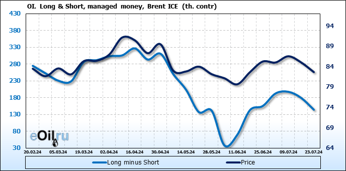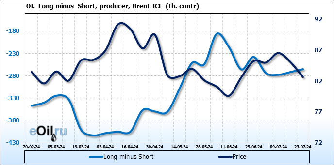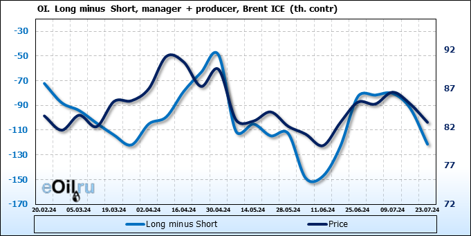 За прошедшую неделю, 17.07.24 — 23.07.24, разница между длинными и короткими позициями управляющих сократилась на 35.5 тыс. контрактов. В тоже время, цена упала на 2.4 доллара.