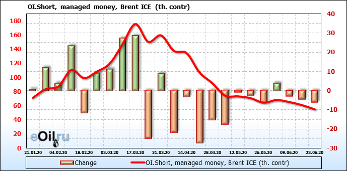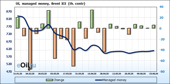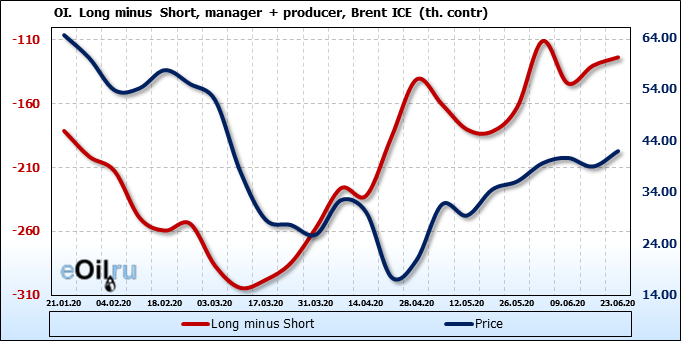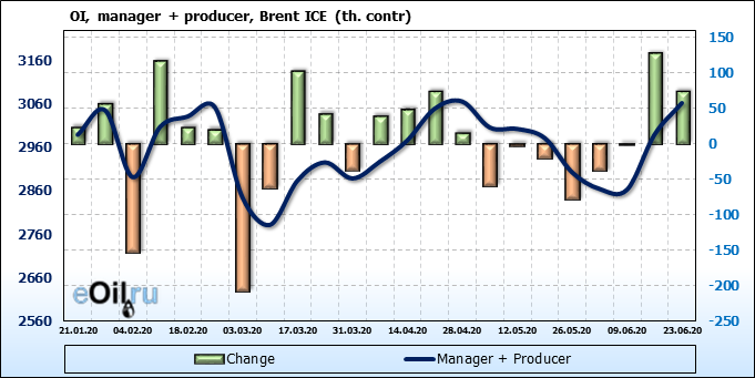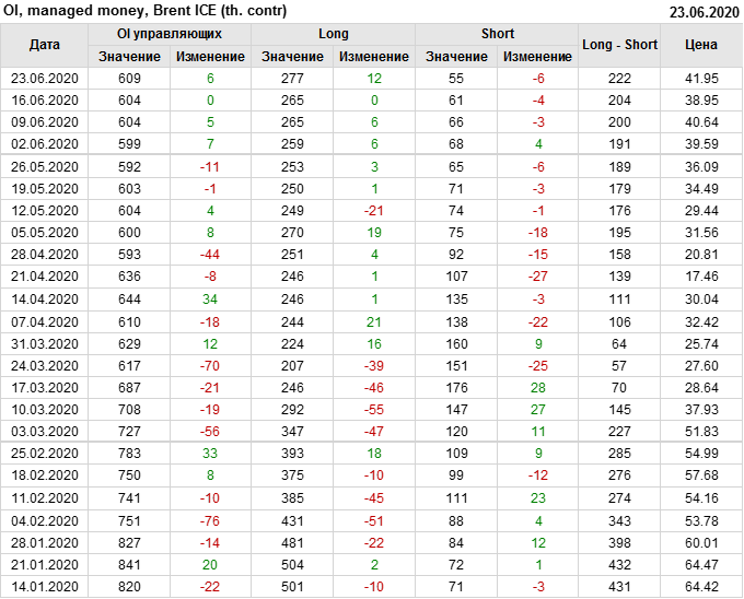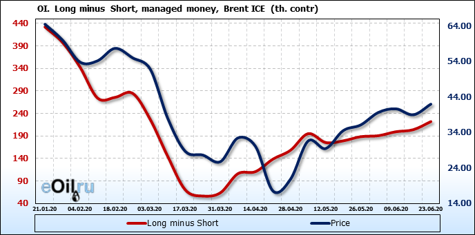 За прошлую неделю, 17.06.20 — 23.06.20, разница между длинными и короткими позициями управляющих выросла на 18 тыс. контрактов. В тоже время, цена выросла на 3.002 доллара. Управляющие наращивают позиции, разгоняя тем самым рост цен, что говорит нам о текущей силе рынка.