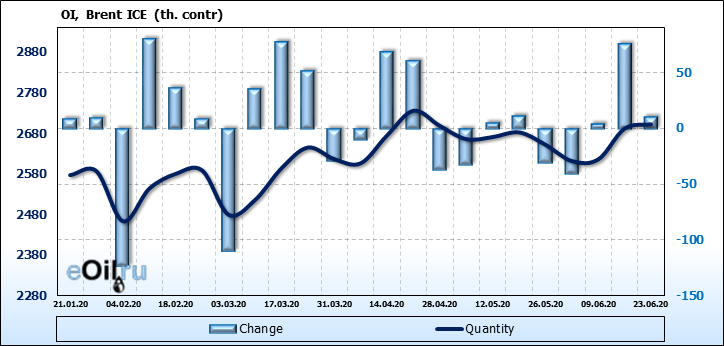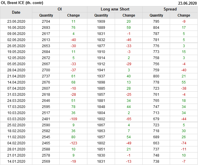 За прошлую неделю, 17.06.20 — 23.06.20, открытый интерес вырос на 11 тыс. контрактов. Объем вовлеченных в торговлю контрактов составляет 2 703 617 штук. Текущее положение дел на рынке таково, что деньги в течение прошлой недели приходили на рынок поддерживая тенденцию.