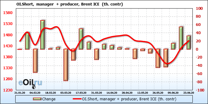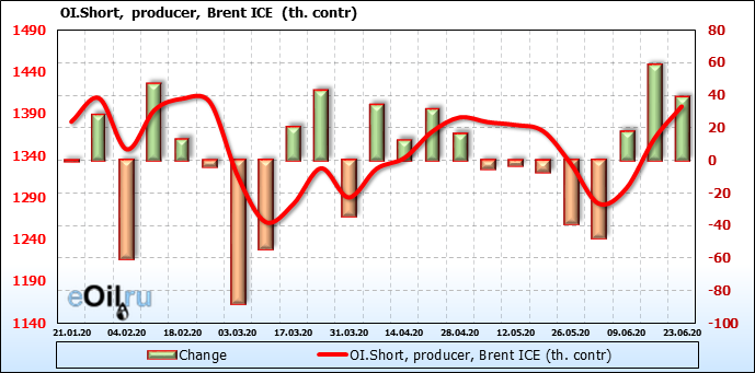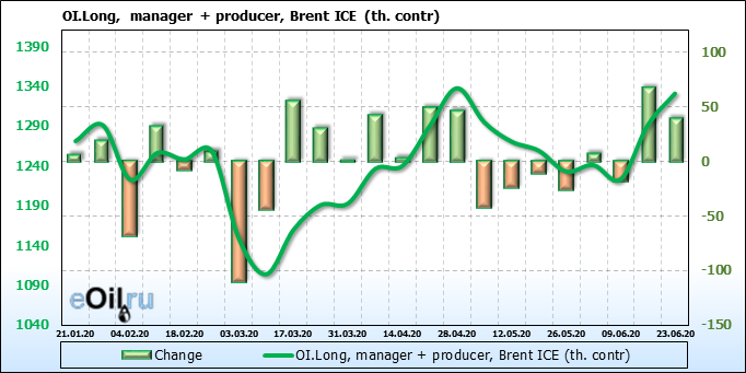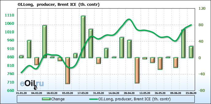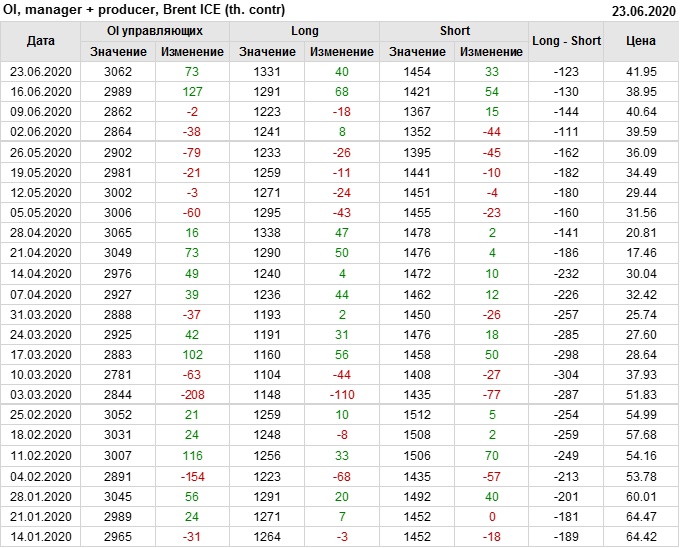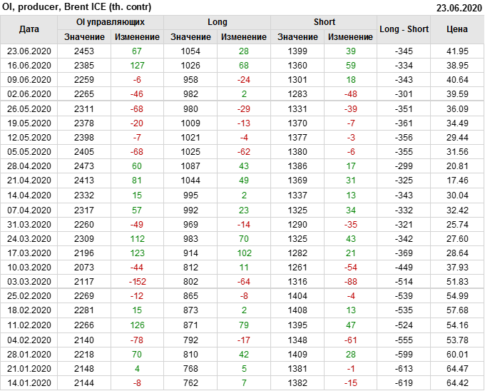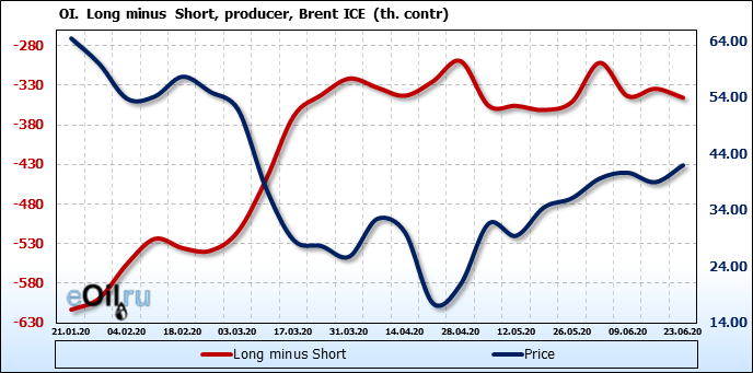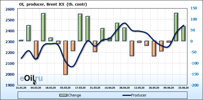 За прошлую неделю, 17.06.20 — 23.06.20, разница между длинными и короткими позициями производителей упала на 11 тыс. контрактов. В тоже время, цена выросла на 3.002 доллара. Производители увеличивают продажи, предполагая, что текущие уровни являются привлекательными для них. И не смотря на это, рынок продолжает расти, что показывает силу текущего тренда.