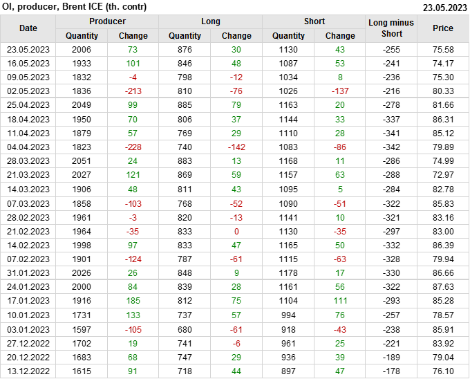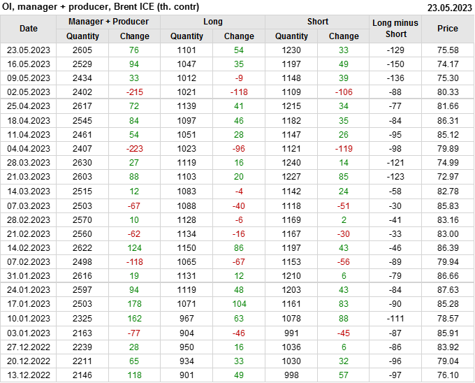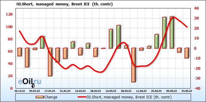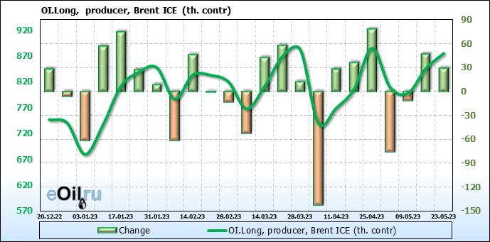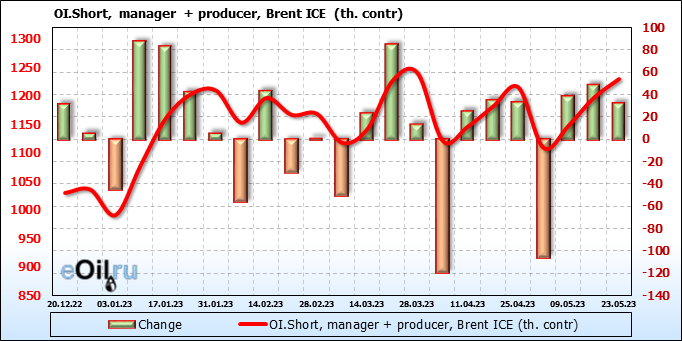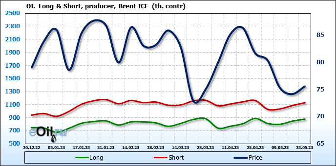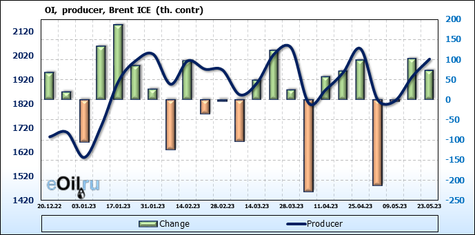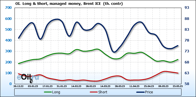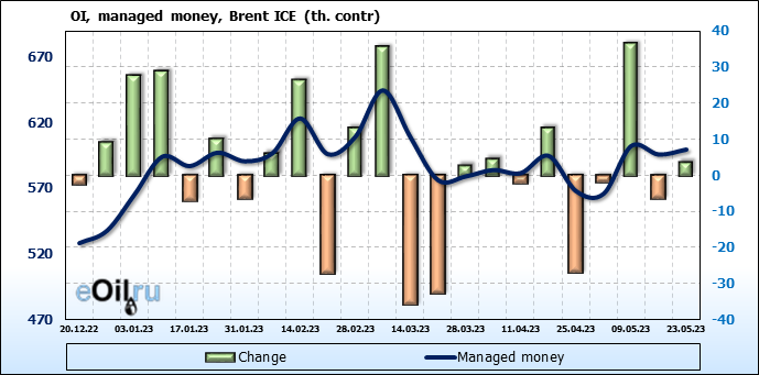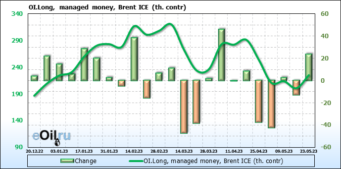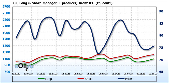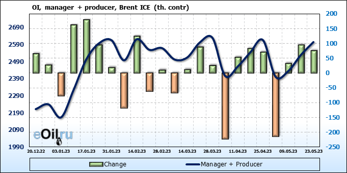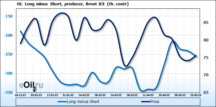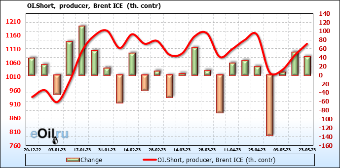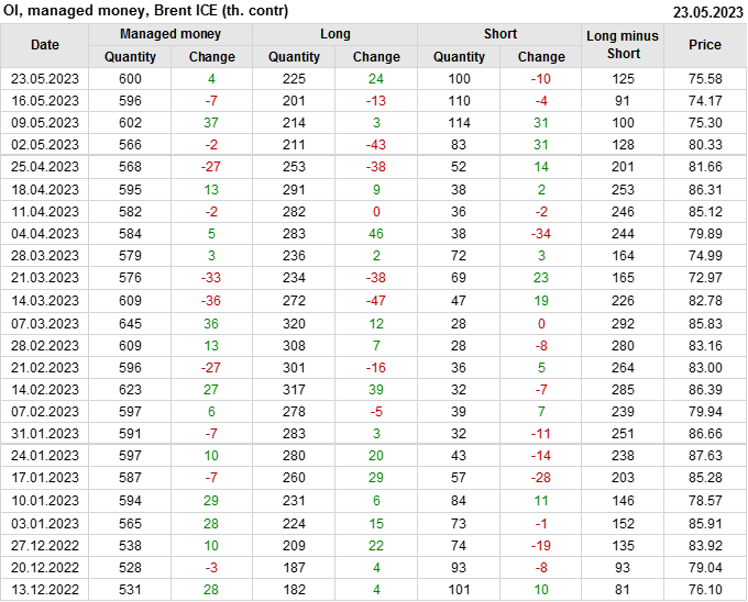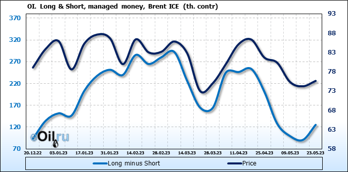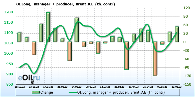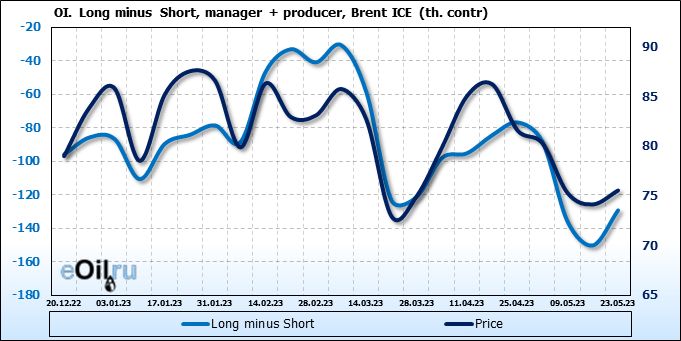За прошедшую неделю, 17.05.23 — 23.05.23, разница между длинными и короткими позициями управляющих увеличилась на 34.6 тыс. контрактов. В тоже время, цена выросла на 1.41 доллара.