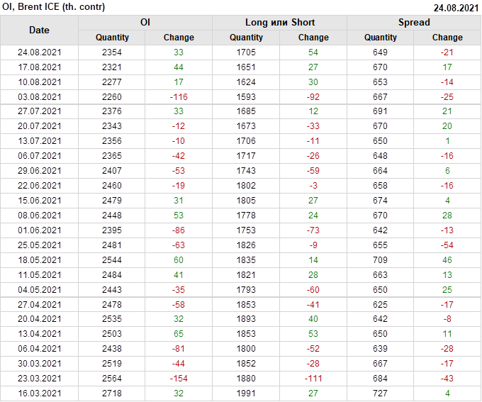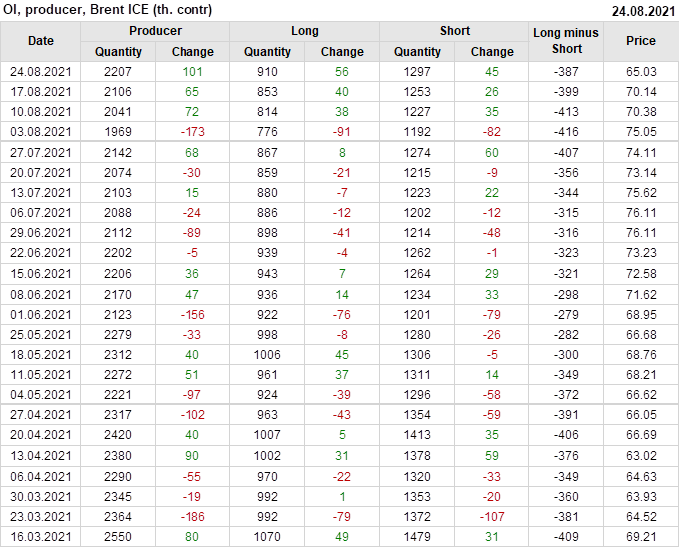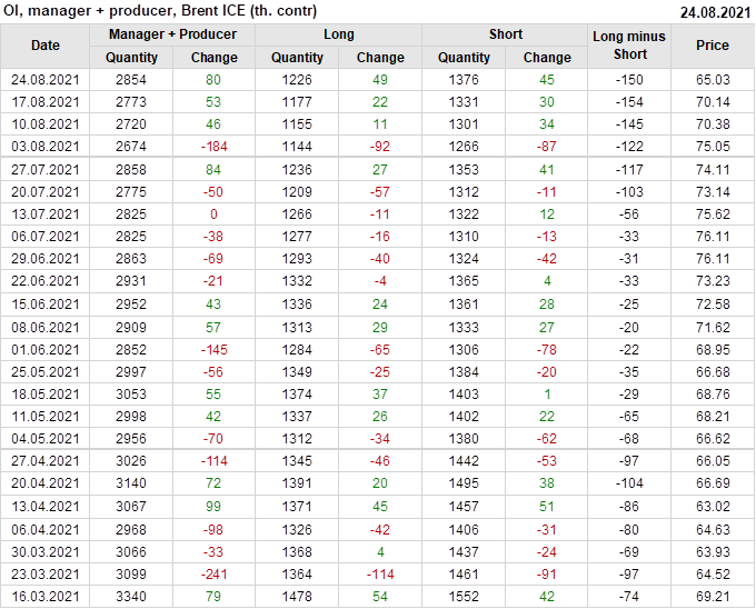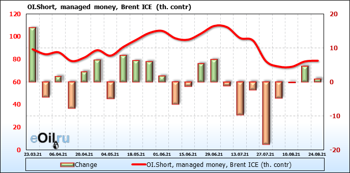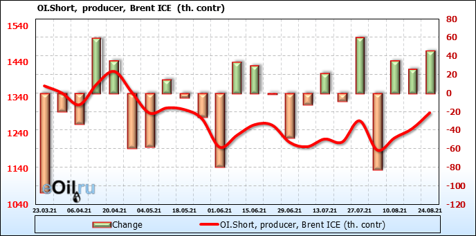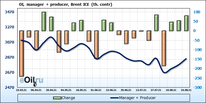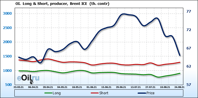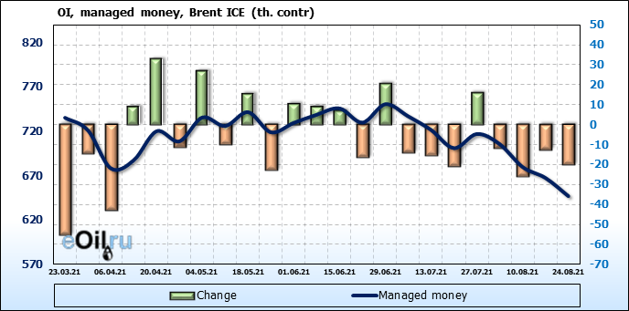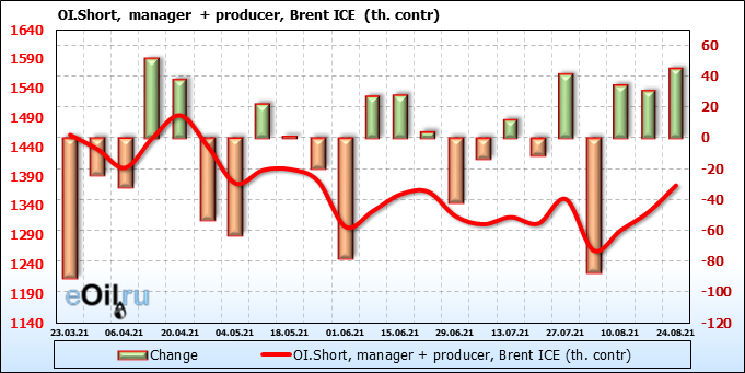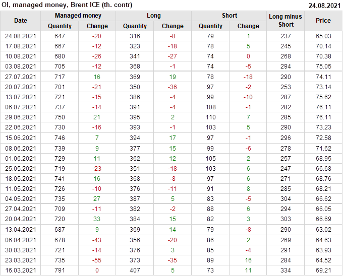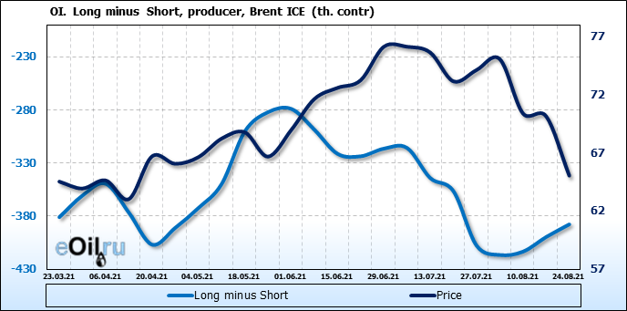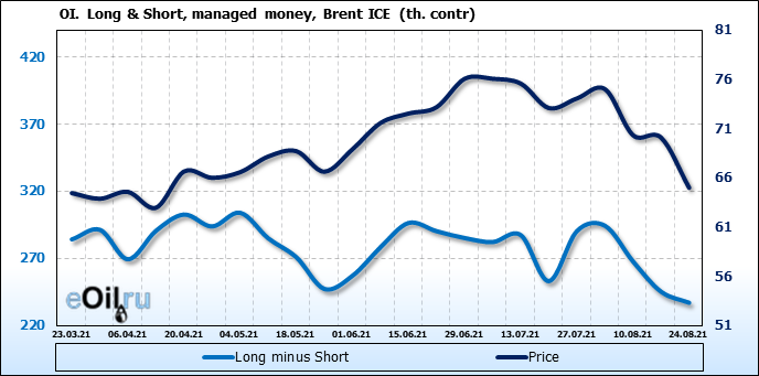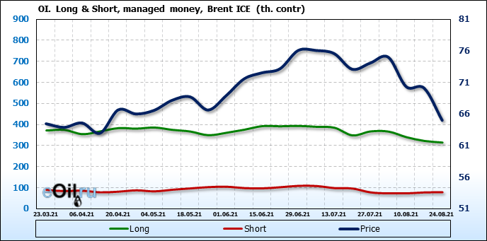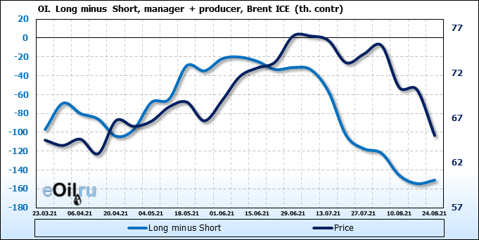 За прошедшую неделю, 18.08.21 — 24.08.21, разница между длинными и короткими позициями управляющих сократилась на 8.2 тыс. контрактов. В тоже время, цена упала на 5.11 доллара.