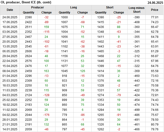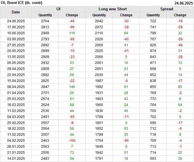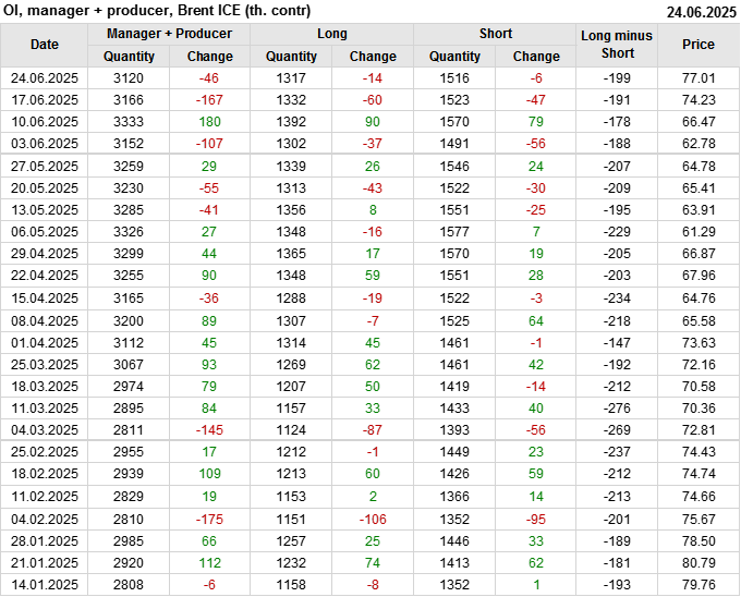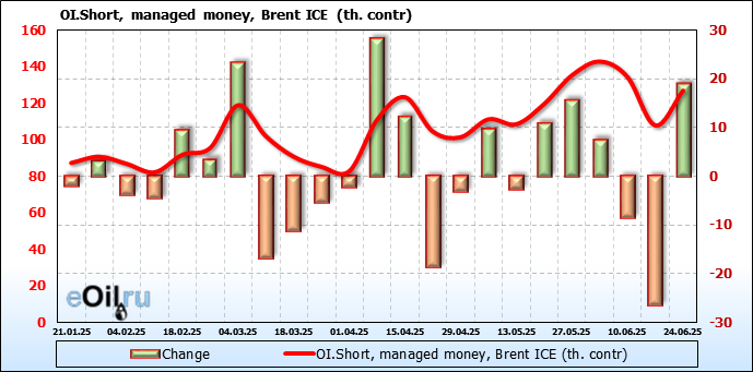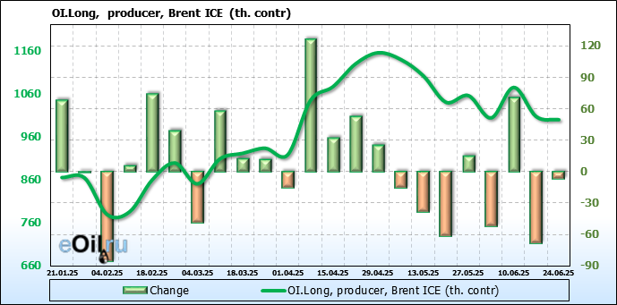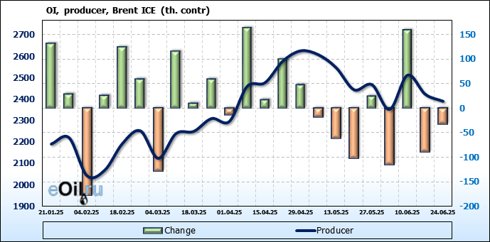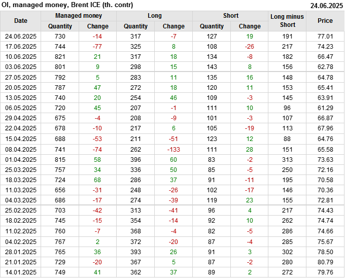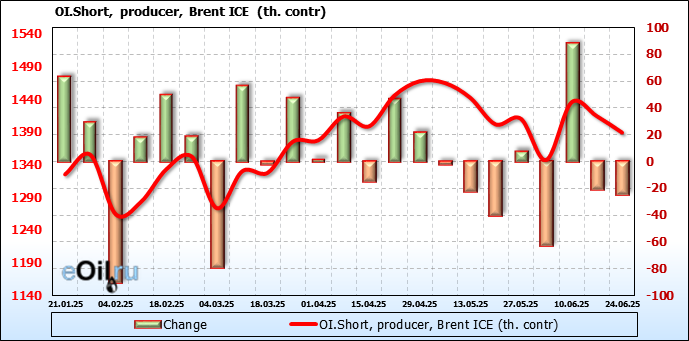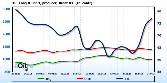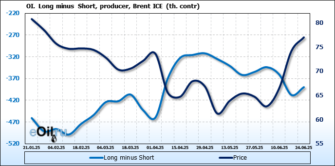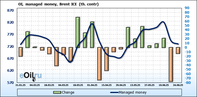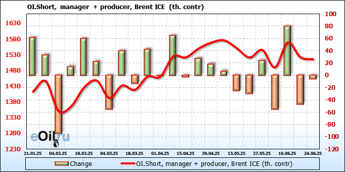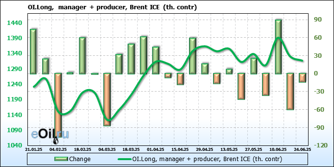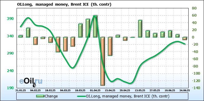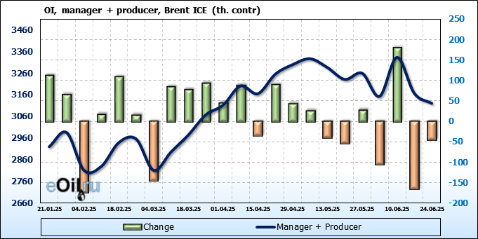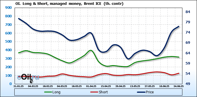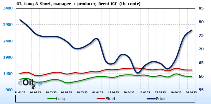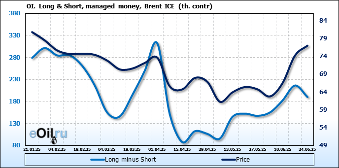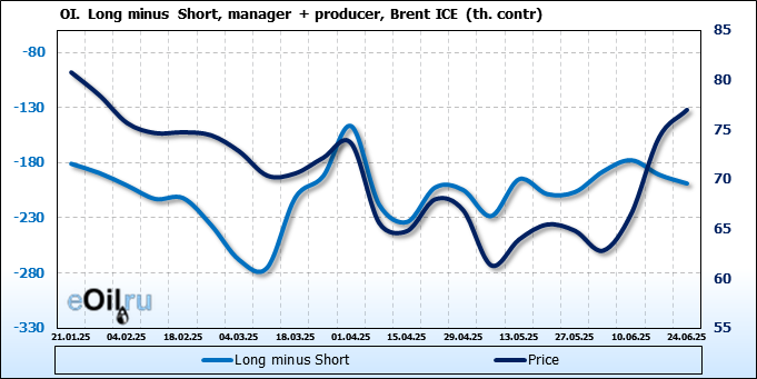 За прошедшую неделю, 18.06.25 — 24.06.25, разница между длинными и короткими позициями управляющих сократилась на 26.2 тыс. контрактов. В тоже время, цена выросла на 2.78 доллара.