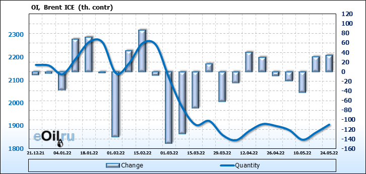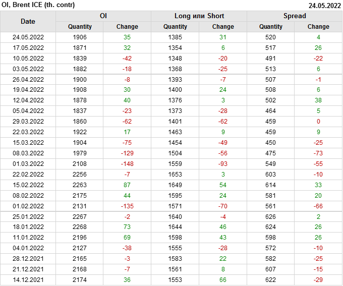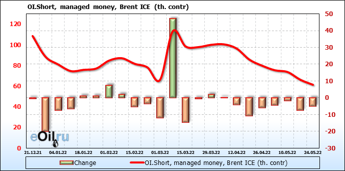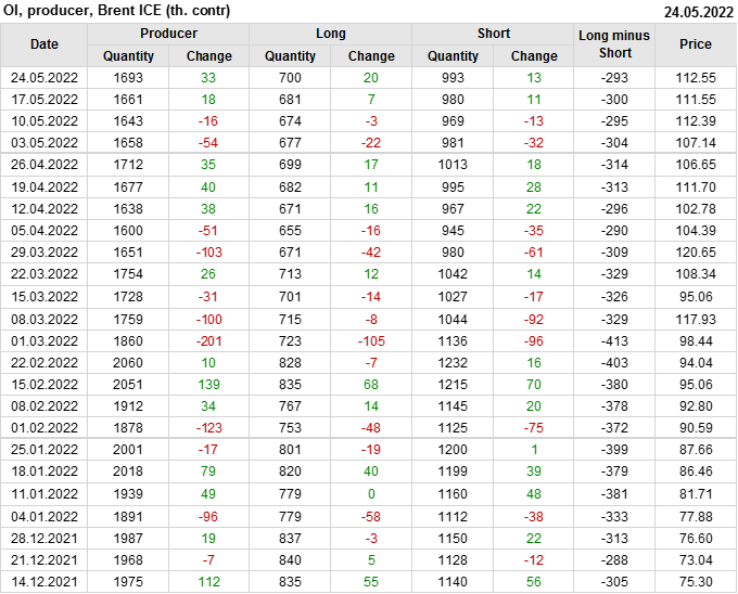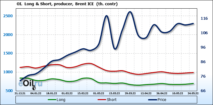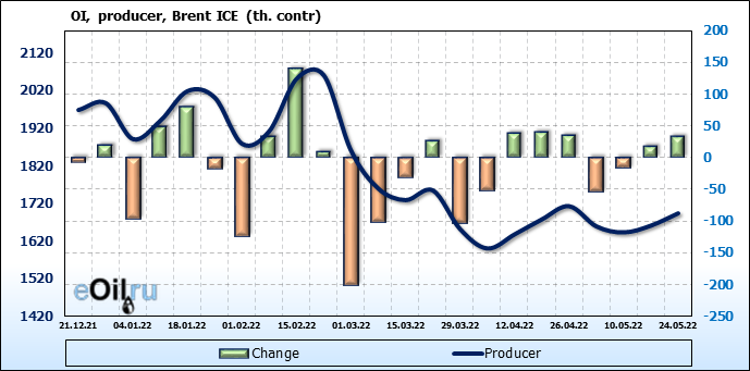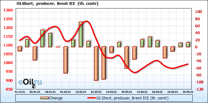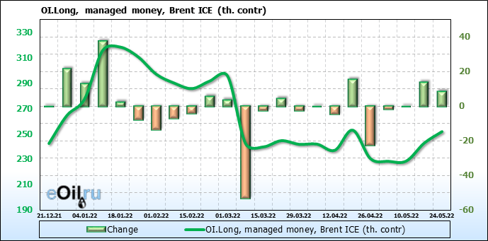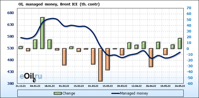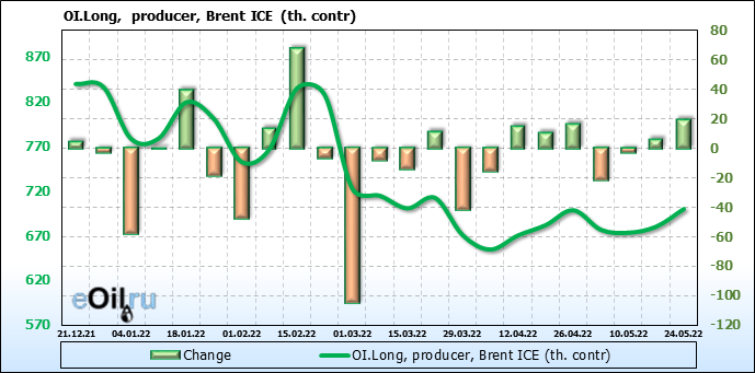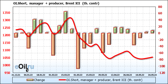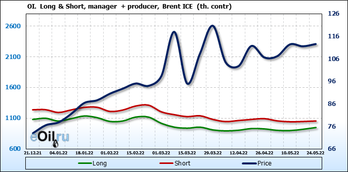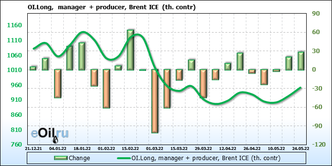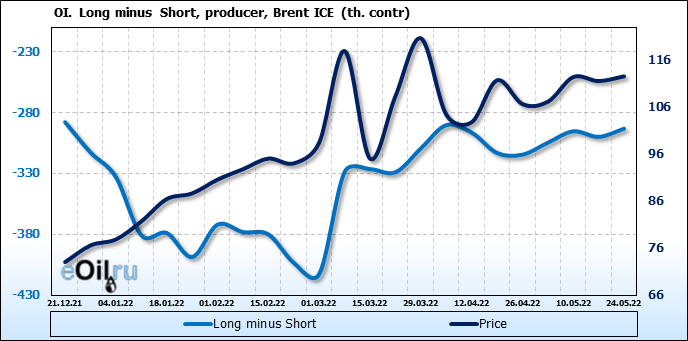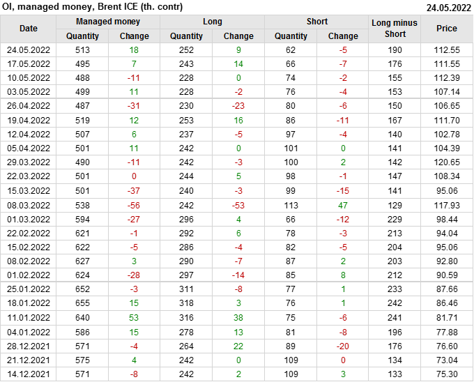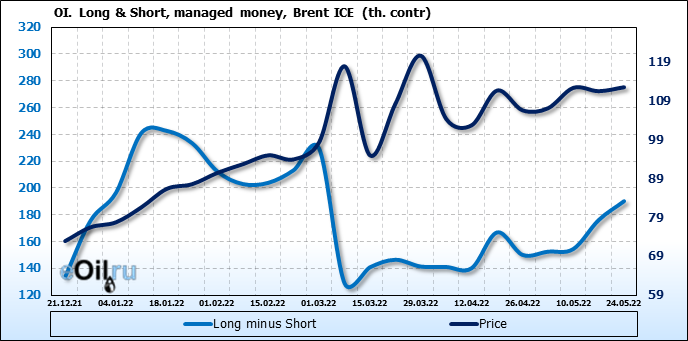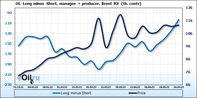 За прошедшую неделю, 18.05.22 — 24.05.22, разница между длинными и короткими позициями управляющих увеличилась на 14 тыс. контрактов. В тоже время, цена выросла на 1 доллар.