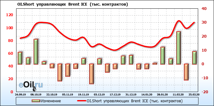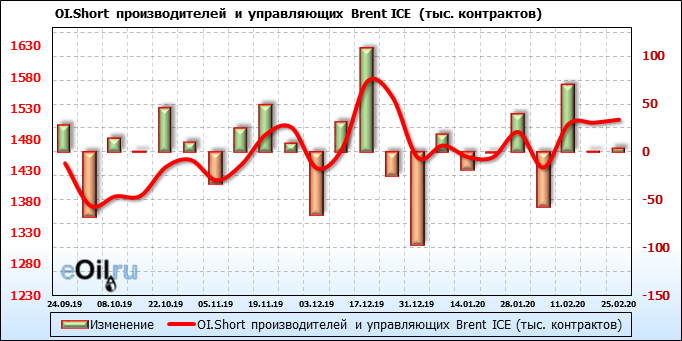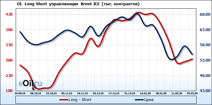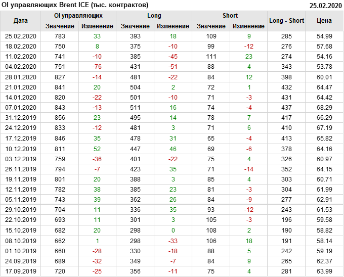 За прошлую неделю, 19.02.20 — 25.02.20, разница между длинными и короткими позициями управляющих выросла на 9 тыс. контрактов. В тоже время, цена упала на 2.69 доллара. Управляющие наращивают длинные позиции, что отражает их видение возможностей роста цены в ближайшее время, и это несмотря на то, что цены на отчетной неделе падали. Если давление со стороны покупателей будет продолжено, рынок развернется вверх.
