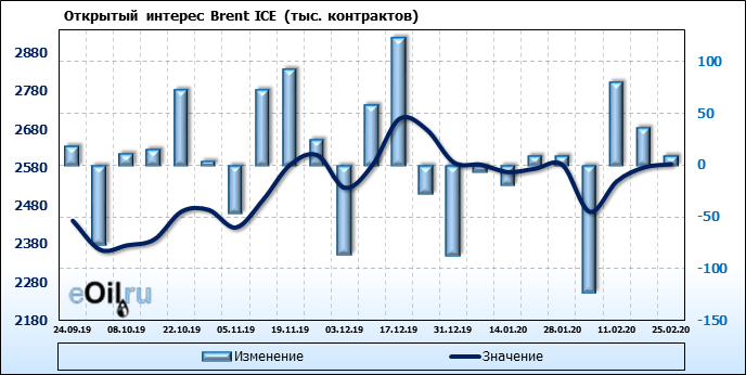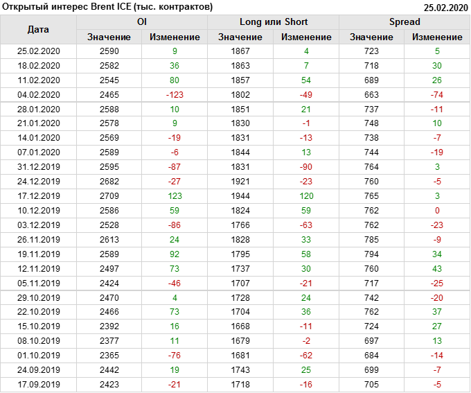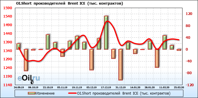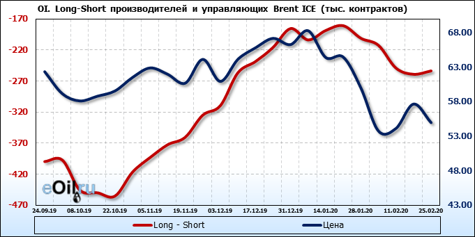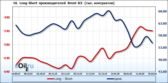 За прошлую неделю, 19.02.20 — 25.02.20, разница между длинными и короткими позициями производителей упала на 3 тыс. контрактов. В тоже время, цена упала на 2.69 доллара. Производители наращивают короткие позиции, что не дает цене расти. В такой ситуации на рынке возможно ускорение падения цен.