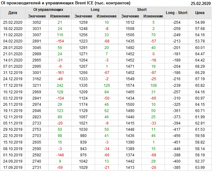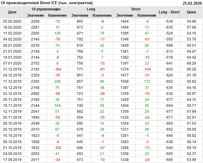 За прошлую неделю, 19.02.20 — 25.02.20, разница между длинными и короткими позициями производителей и управляющих выросла на 5 тыс. контрактов. За отчетный период времени, цена упала на 2.69 доллара. Производители и управляющие в своей совокупности смотрели вверх, не смотря на то, что цена продолжала снижаться. Подобный дисбаланс должен привести к стабилизации и развороту цен вверх в скором времени.