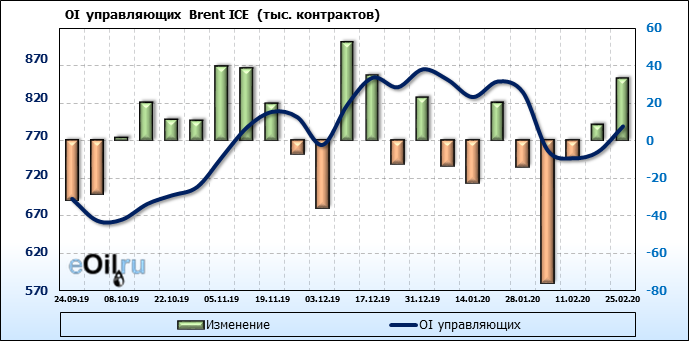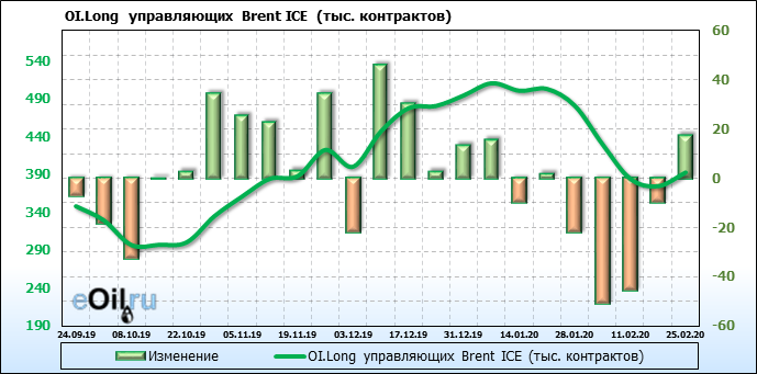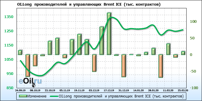 За прошлую неделю, 19.02.20 — 25.02.20, разница между длинными и короткими позициями управляющих выросла на 9 тыс. контрактов. В тоже время, цена упала на 2.69 доллара. Управляющие наращивают длинные позиции, что отражает их видение возможностей роста цены в ближайшее время, и это несмотря на то, что цены на отчетной неделе падали. Если давление со стороны покупателей будет продолжено, рынок развернется вверх.
