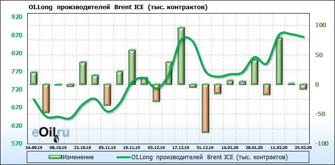 За прошлую неделю, 19.02.20 — 25.02.20, разница между длинными и короткими позициями производителей упала на 3 тыс. контрактов. В тоже время, цена упала на 2.69 доллара. Производители наращивают короткие позиции, что не дает цене расти. В такой ситуации на рынке возможно ускорение падения цен.