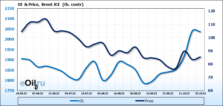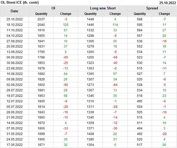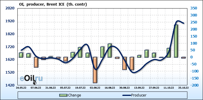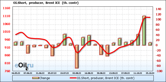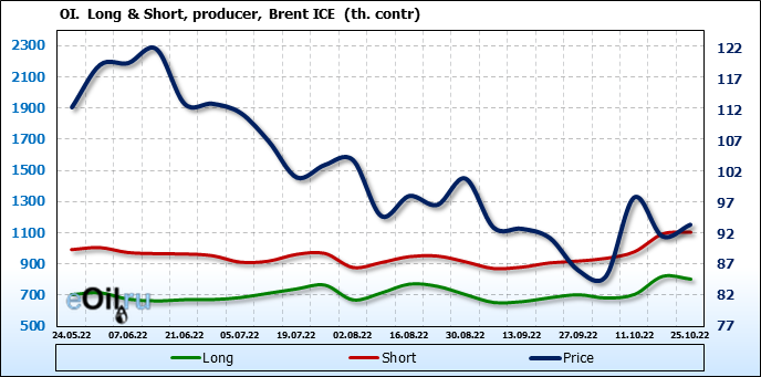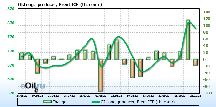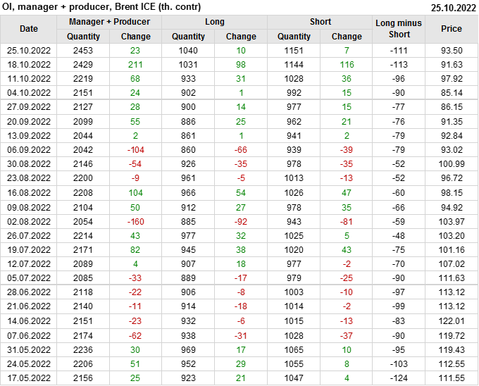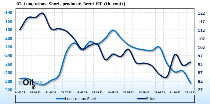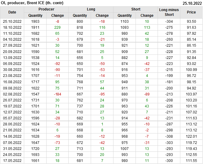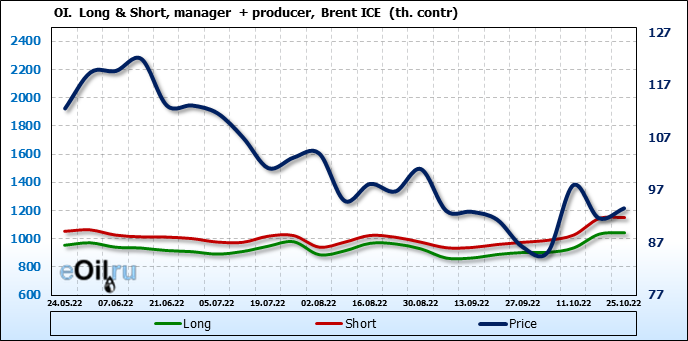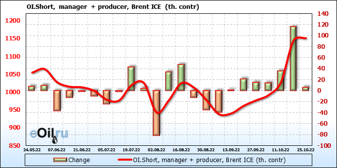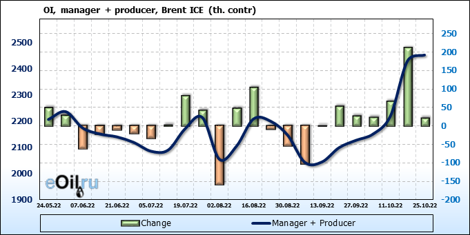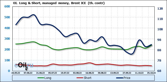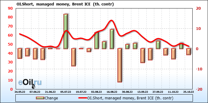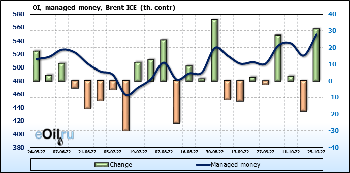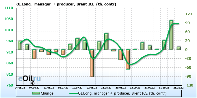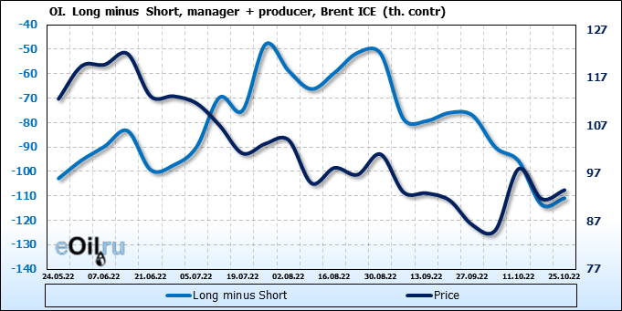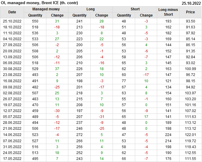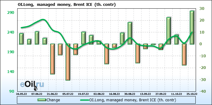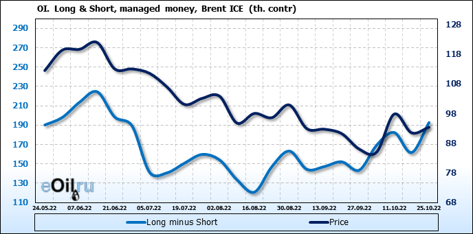 За прошедшую неделю, 19.10.22 — 25.10.22, разница между длинными и короткими позициями управляющих увеличилась на 30.9 тыс. контрактов. В тоже время, цена выросла на 1.87 доллара.