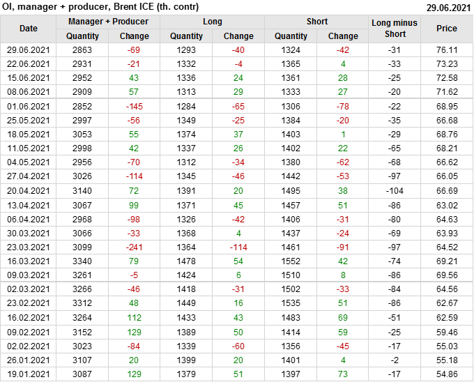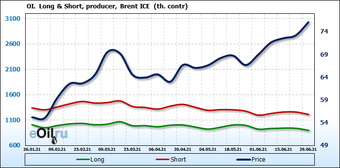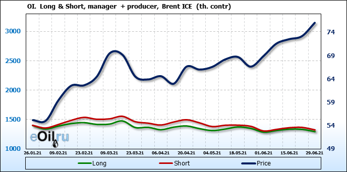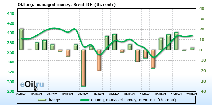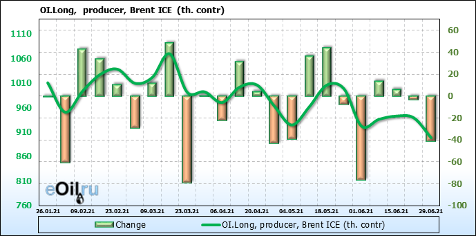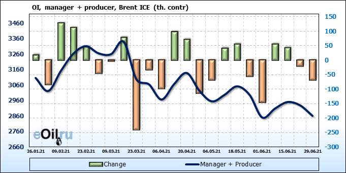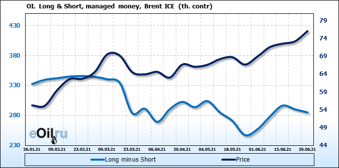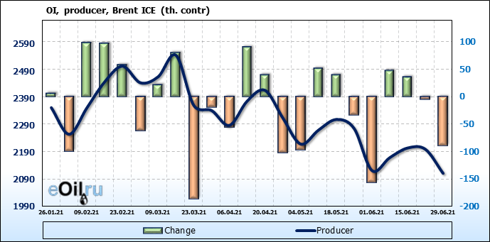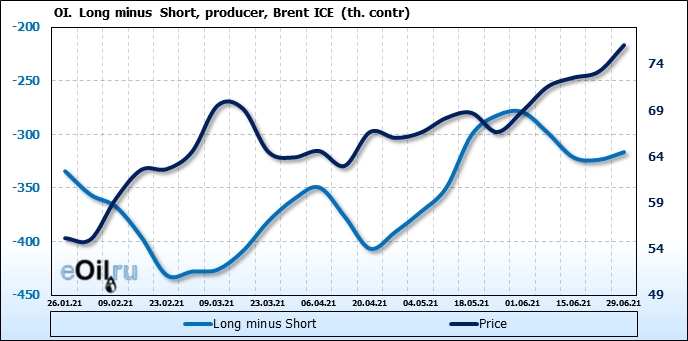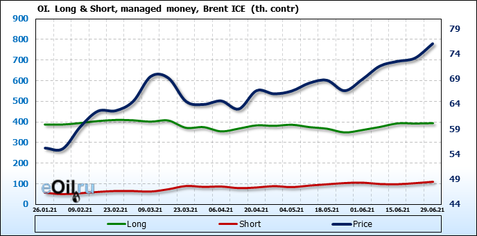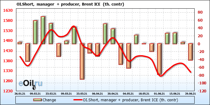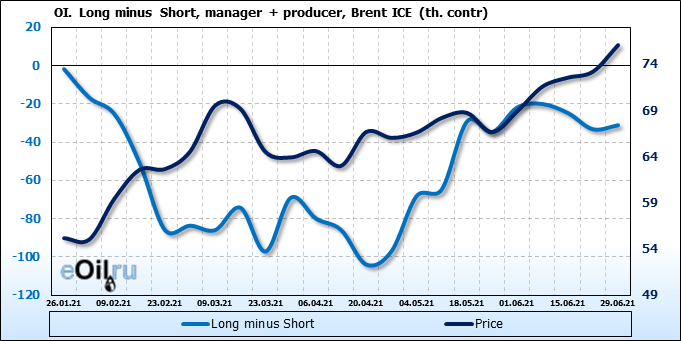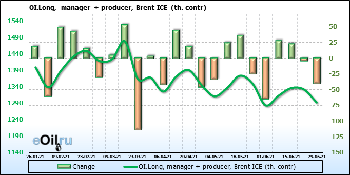 За прошедшую неделю, 23.06.21 — 29.06.21, разница между длинными и короткими позициями управляющих сократилась на 5.1 тыс. контрактов. В тоже время, цена выросла на 2.88 доллара.