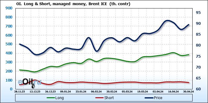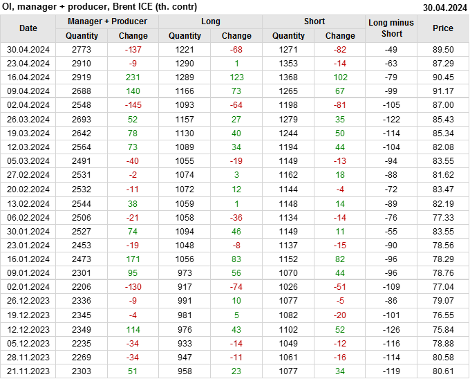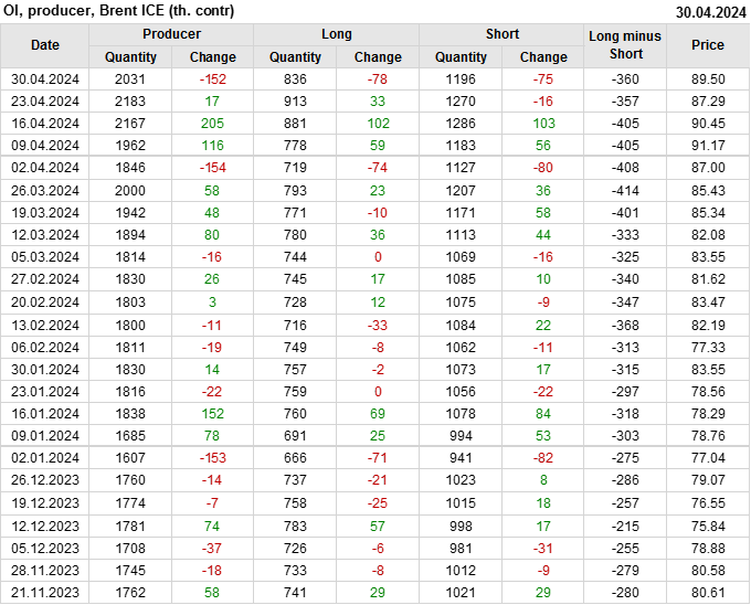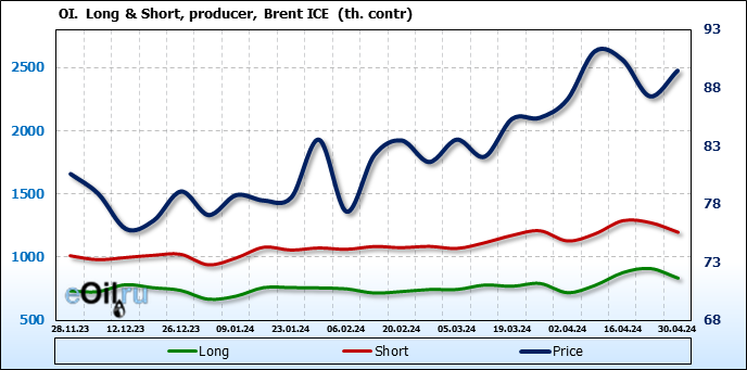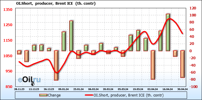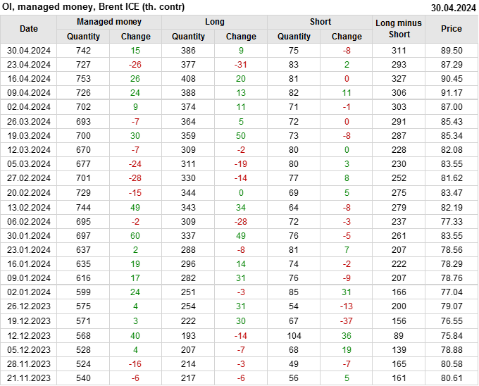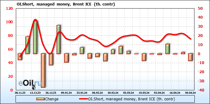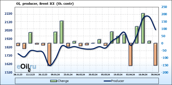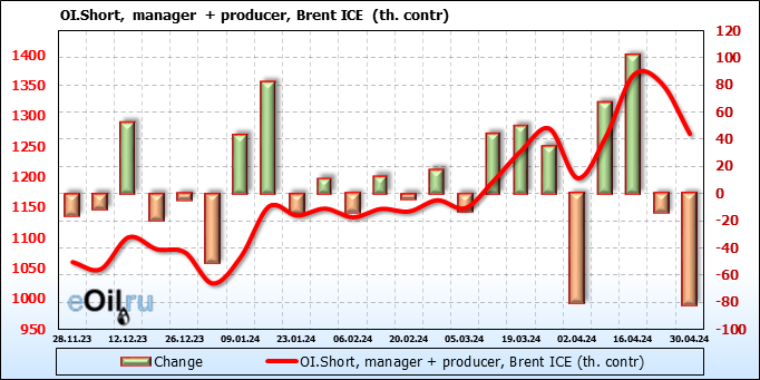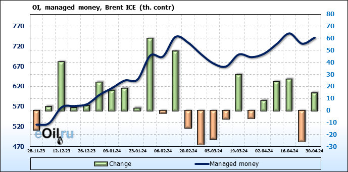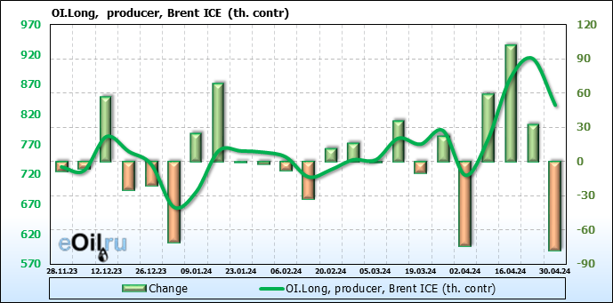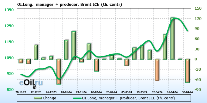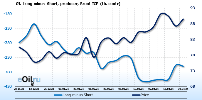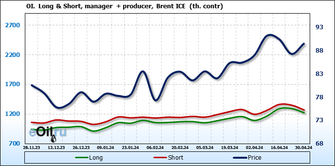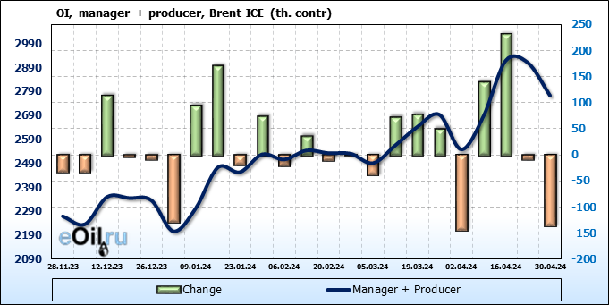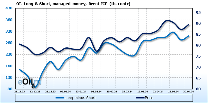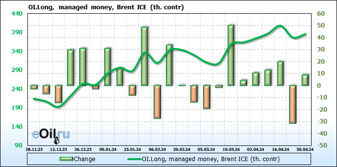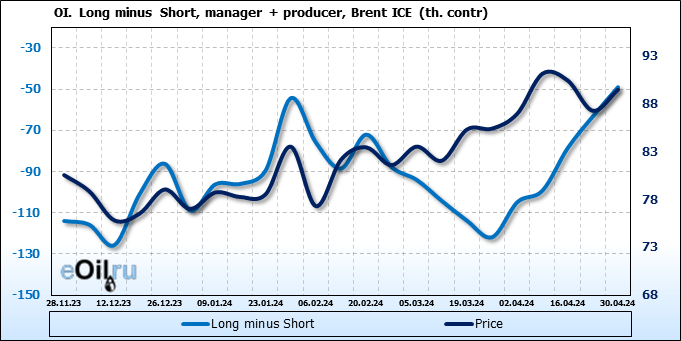 За прошедшую неделю, 24.04.24 — 30.04.24, разница между длинными и короткими позициями управляющих увеличилась на 17.3 тыс. контрактов. В тоже время, цена выросла на 2.21 доллара.