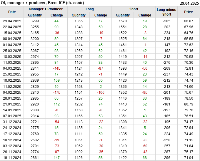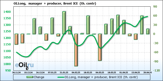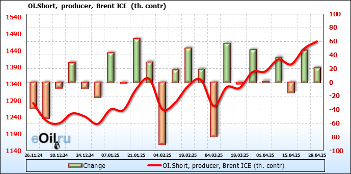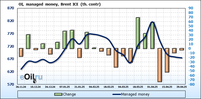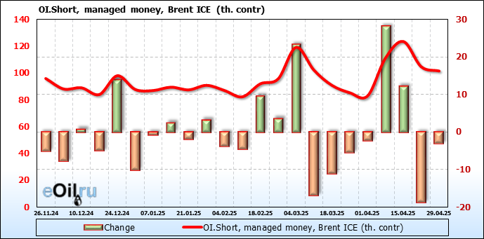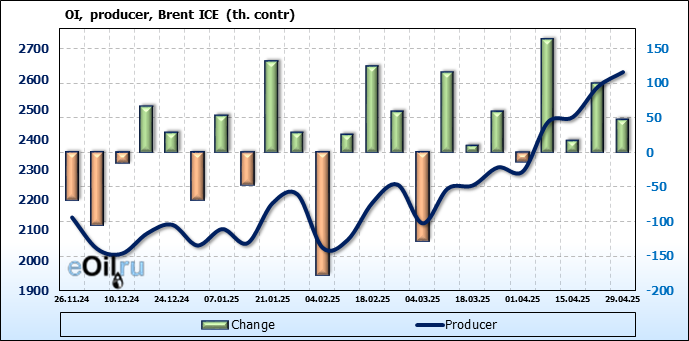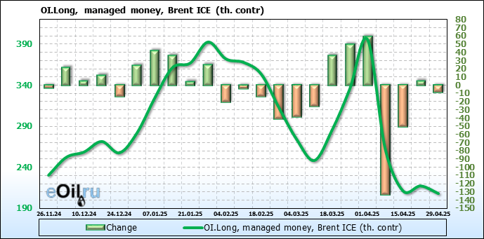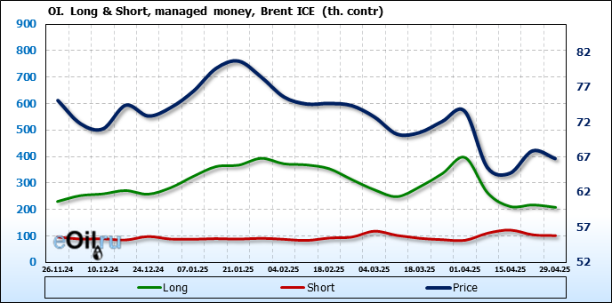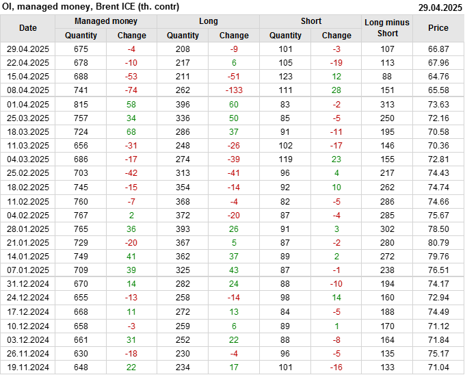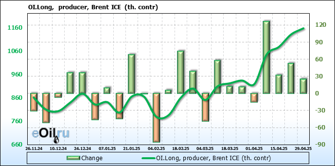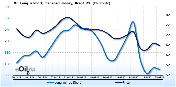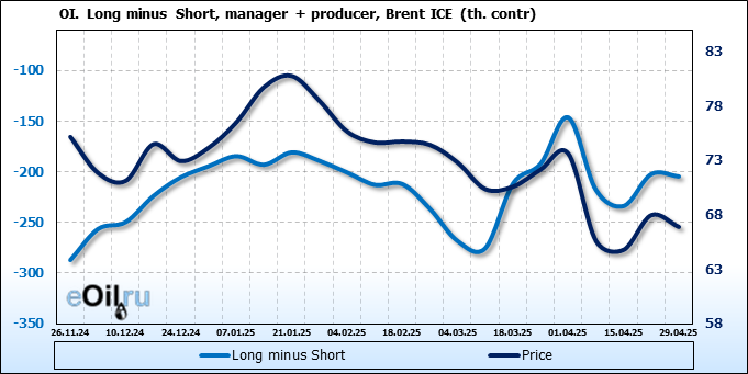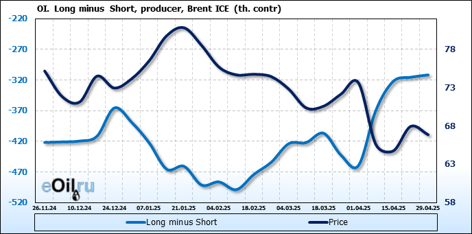 За прошедшую неделю, 23.04.25 — 29.04.25, разница между длинными и короткими позициями управляющих сократилась на 6.1 тыс. контрактов. В тоже время, цена упала на 1.09 доллара.