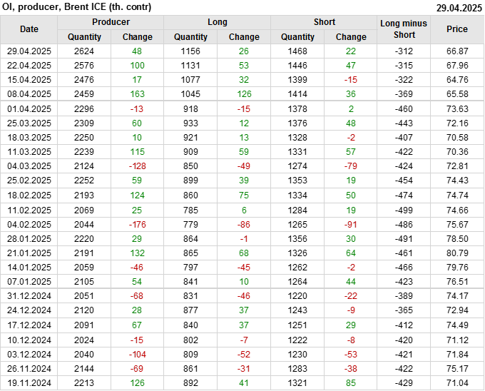 За неделю разница между длинными и короткими позициями производителей сократилась на 3.8 тыс. контрактов.