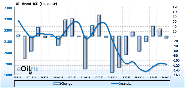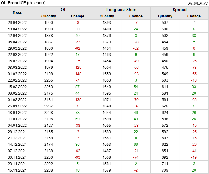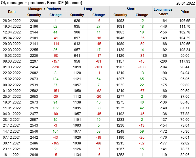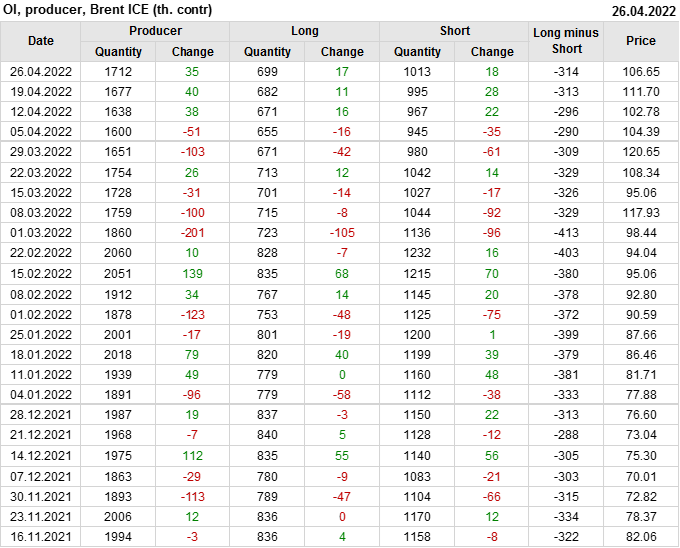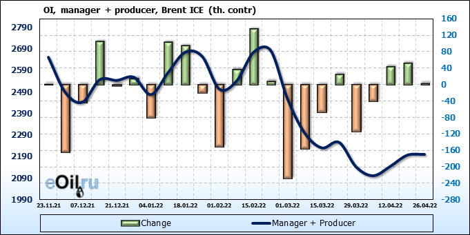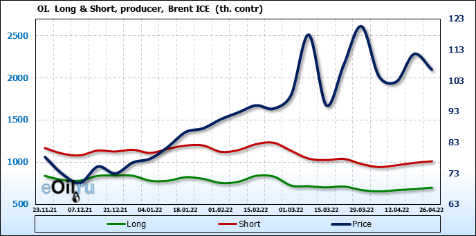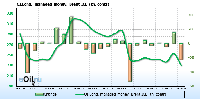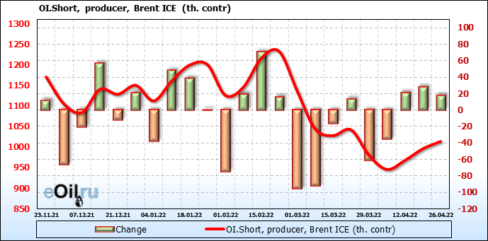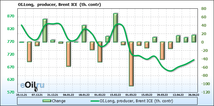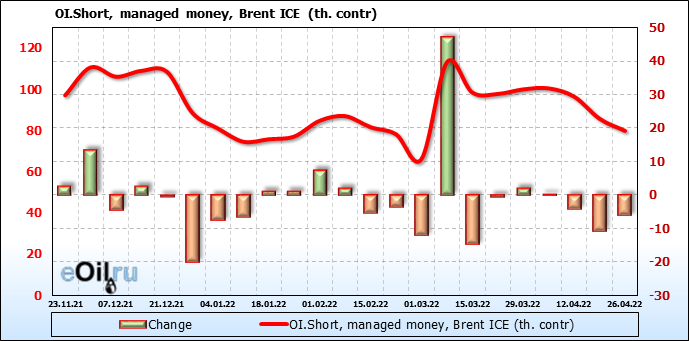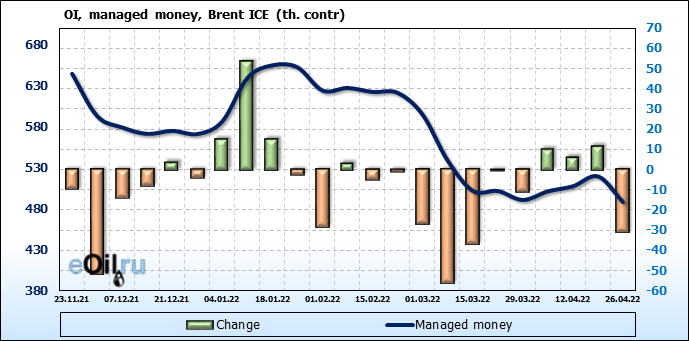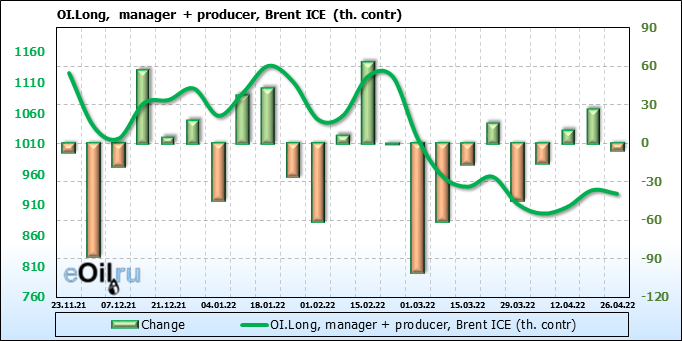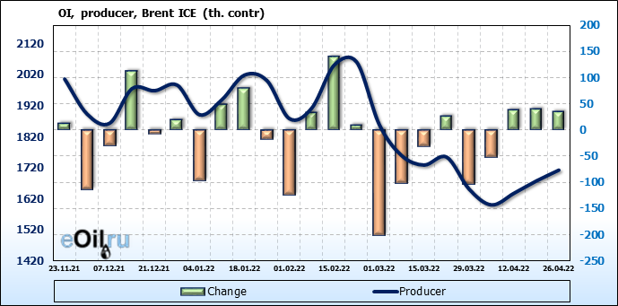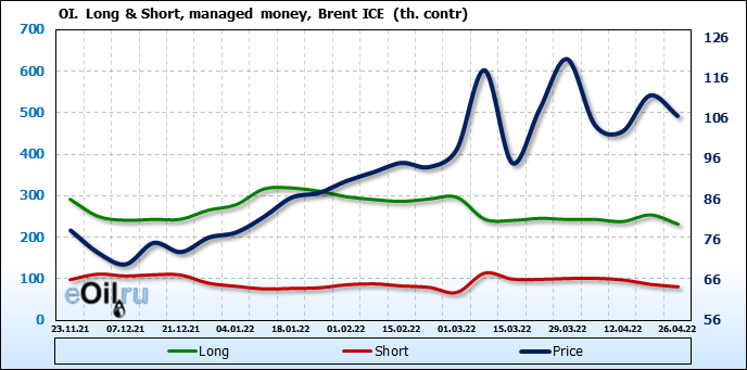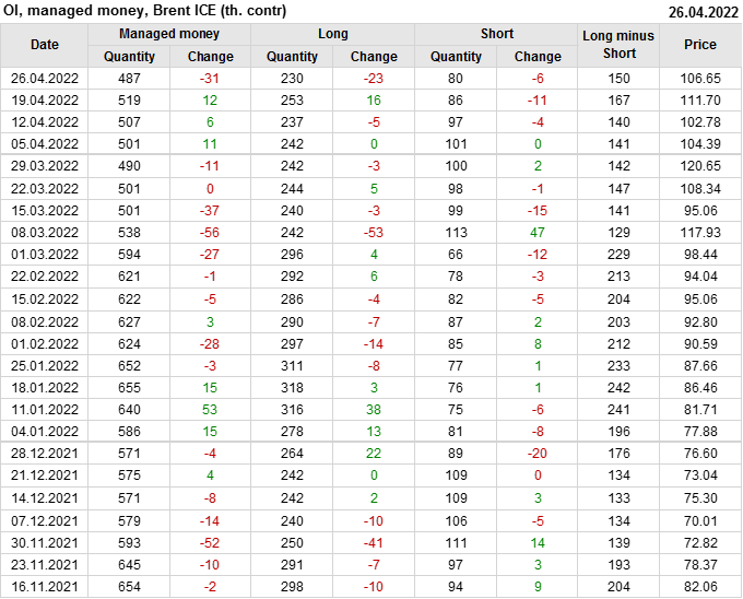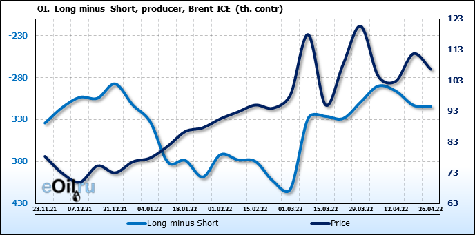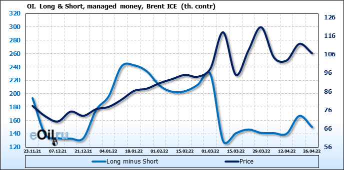 За прошедшую неделю, 20.04.22 — 26.04.22, разница между длинными и короткими позициями управляющих сократилась на 16.7 тыс. контрактов. В тоже время, цена упала на 5.05 доллара.