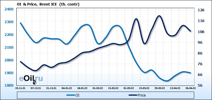 За прошедшую неделю, 20.04.22 — 26.04.22, открытый интерес упал на 8 тыс. контрактов. Объем вовлеченных в торговлю контрактов составляет 1 899 793 штуки. Текущее положение дел на рынке таково, что деньги в течение прошлой недели уходили с рынка не видя привлекательности в текущей ситуации.