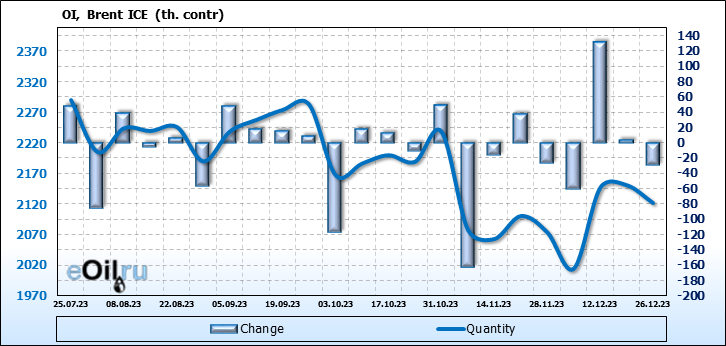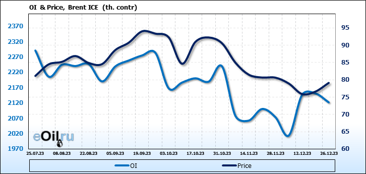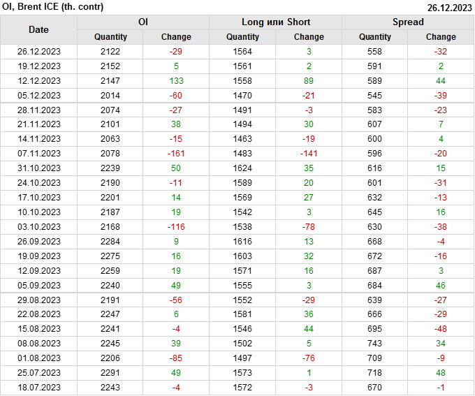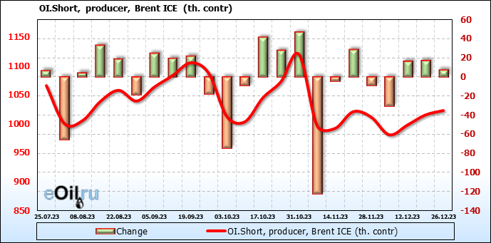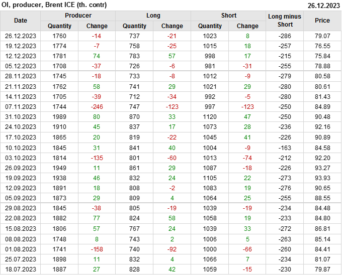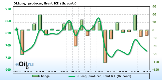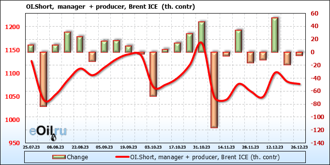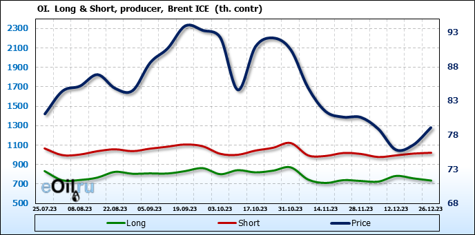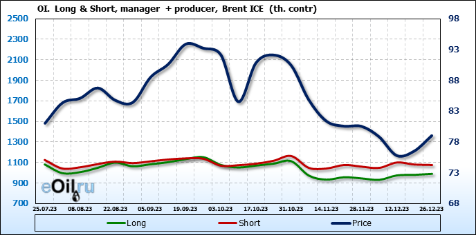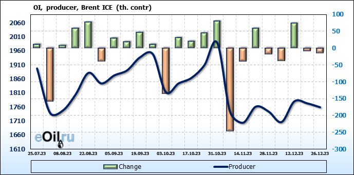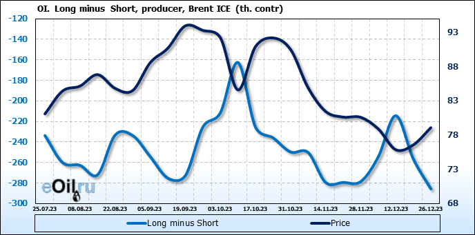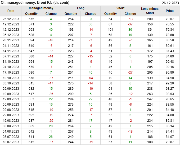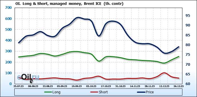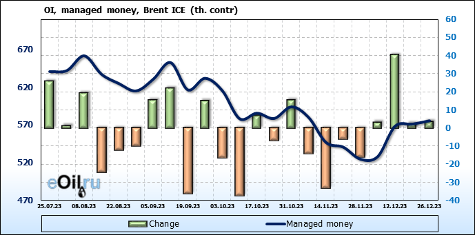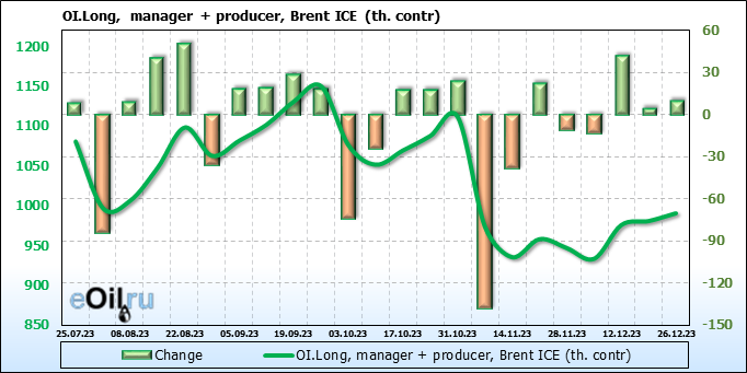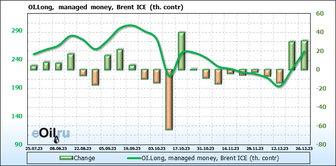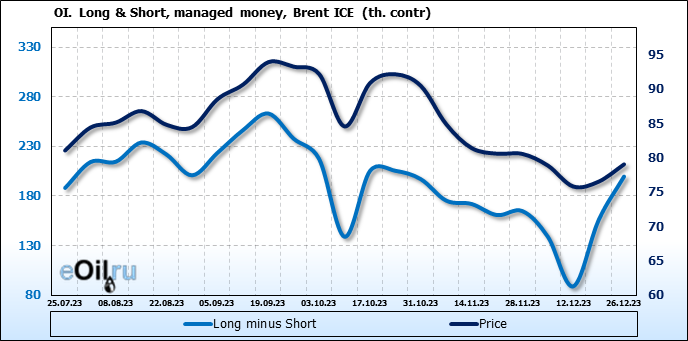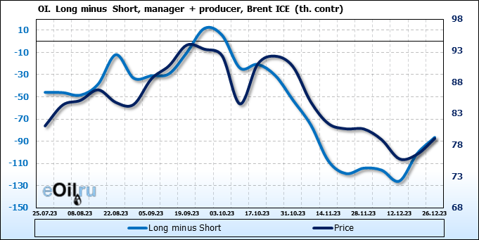 За прошедшую неделю, 20.12.23 — 26.12.23, разница между длинными и короткими позициями управляющих увеличилась на 44 тыс. контрактов. В тоже время, цена выросла на 2.52 доллара.