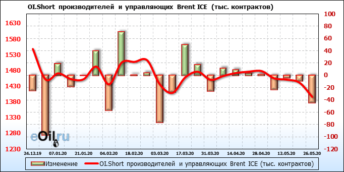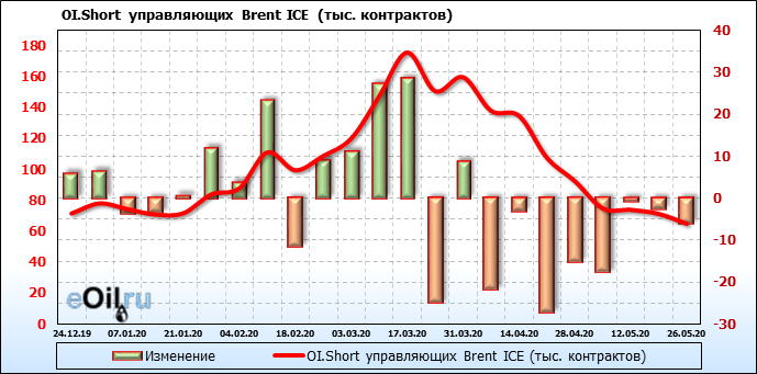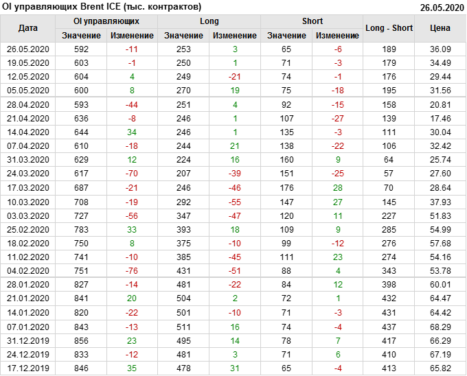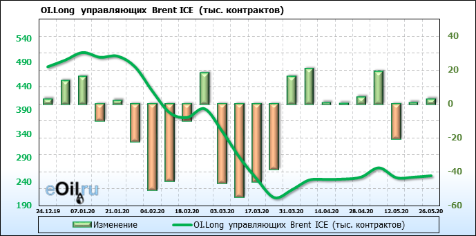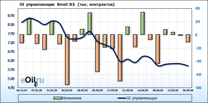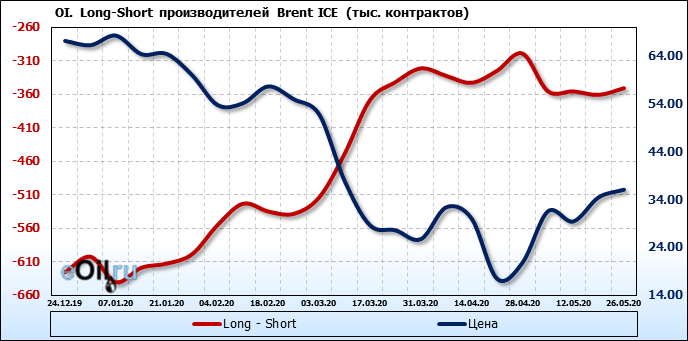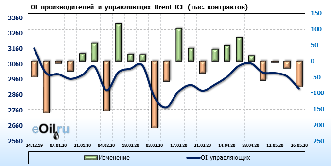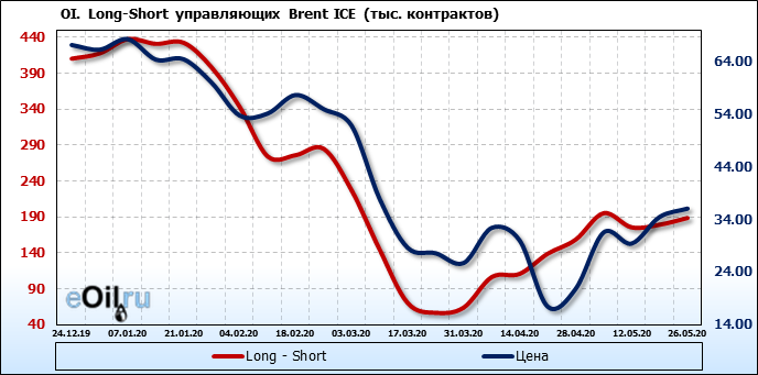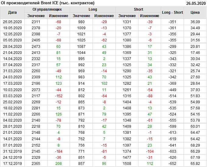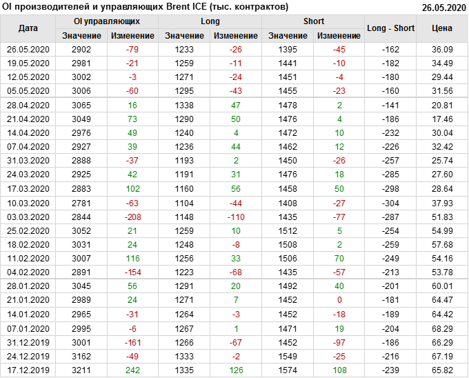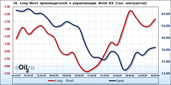 За прошлую неделю, 20.05.20 — 26.05.20, разница между длинными и короткими позициями управляющих выросла на 9 тыс. контрактов. В тоже время, цена выросла на 1.6 доллара. Управляющие наращивают позиции, разгоняя тем самым рост цен, что говорит нам о текущей силе рынка.