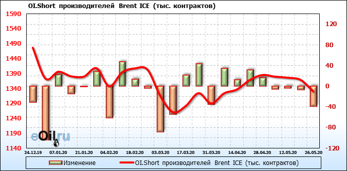 За прошлую неделю, 20.05.20 — 26.05.20, разница между длинными и короткими позициями производителей выросла на 10 тыс. контрактов. В тоже время, цена выросла на 1.6 доллара. Производители не торопятся наращивать продажи, предполагая, что возможен рост цены в ближайшее время.