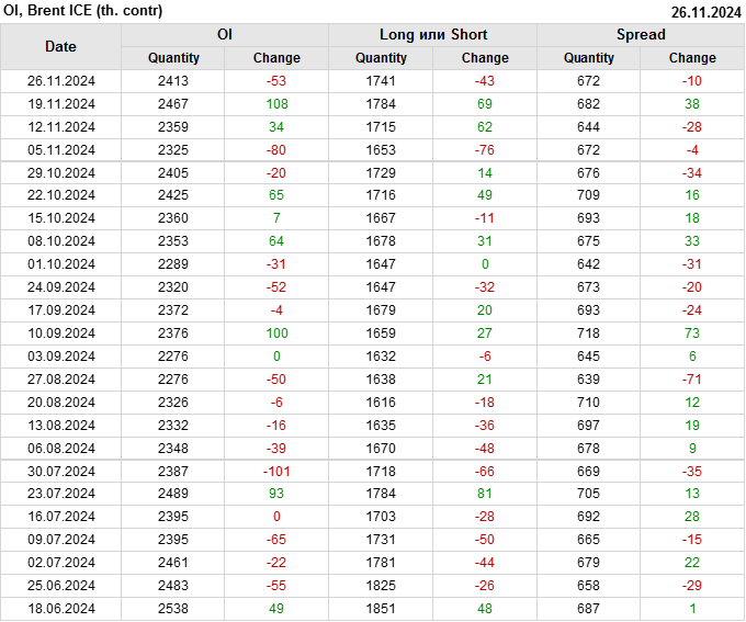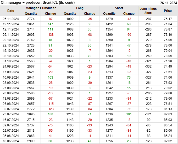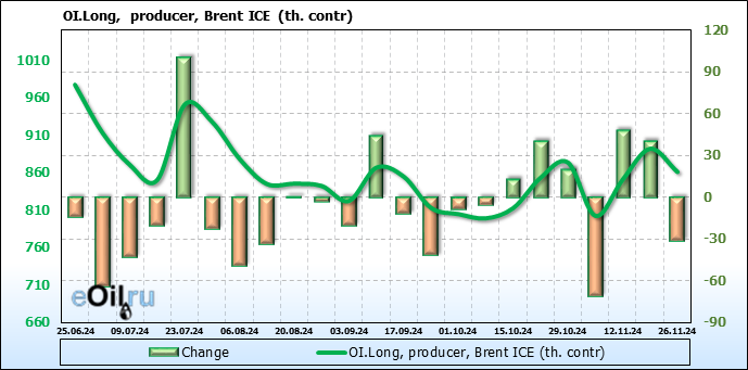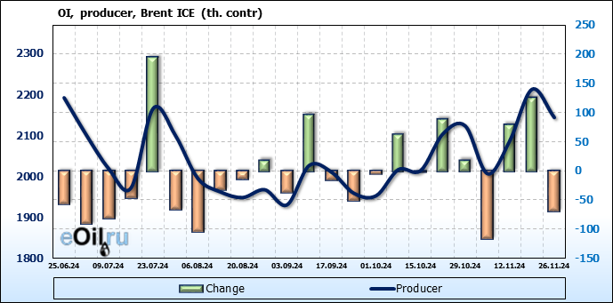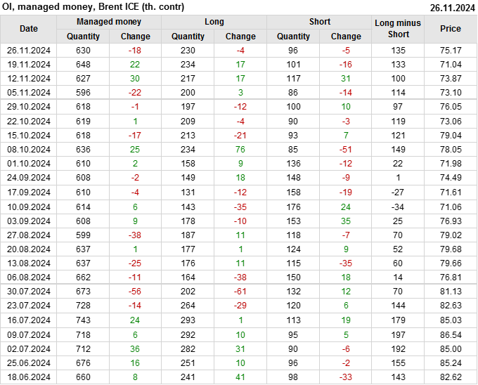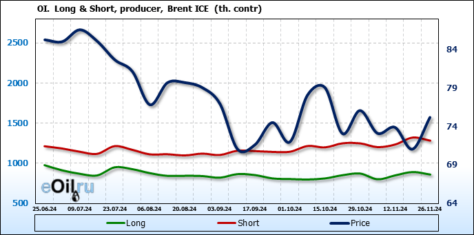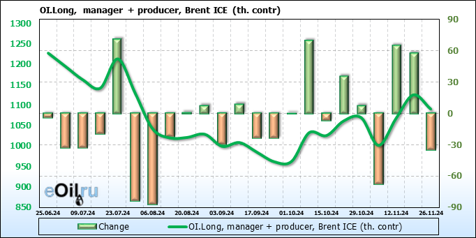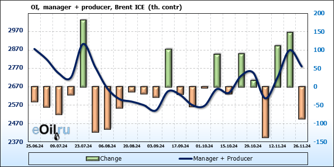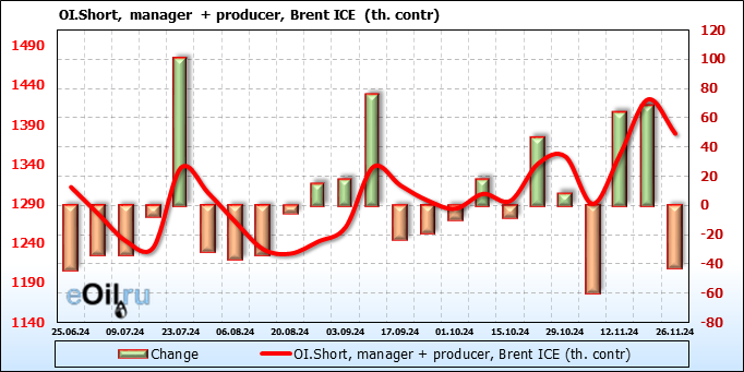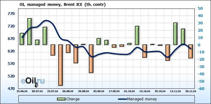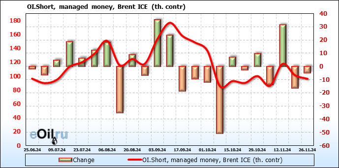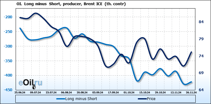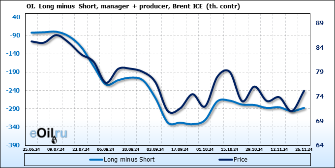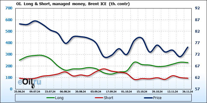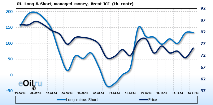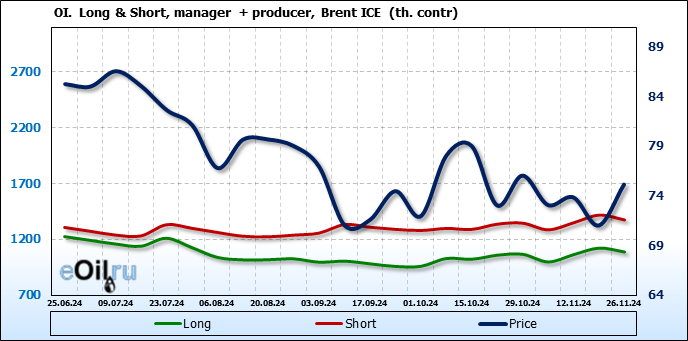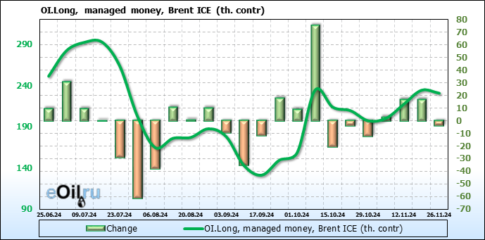За прошедшую неделю, 20.11.24 — 26.11.24, разница между длинными и короткими позициями управляющих увеличилась на 1.5 тыс. контрактов. В тоже время, цена выросла на 4.13 доллара.