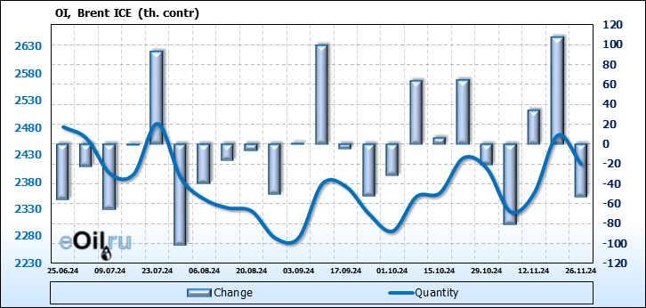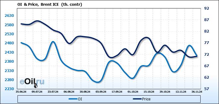 За прошедшую неделю, 20.11.24 — 26.11.24, открытый интерес упал на 53 тыс. контрактов. Объем вовлеченных в торговлю контрактов составляет 2 413 315 штук. Текущее положение дел на рынке таково, что деньги в течение прошлой недели уходили с рынка не видя привлекательности в текущей ситуации.