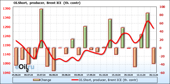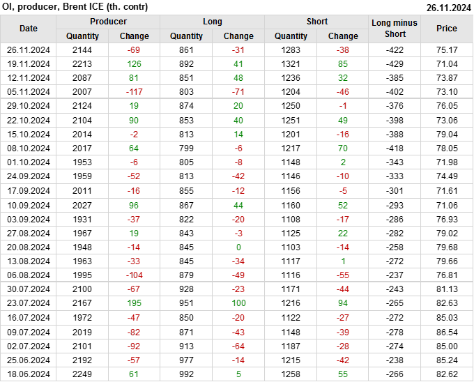 За неделю разница между длинными и короткими позициями производителей сократилась на 7.2 тыс. контрактов.