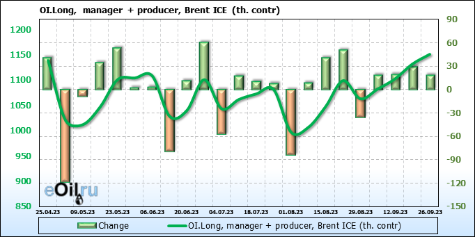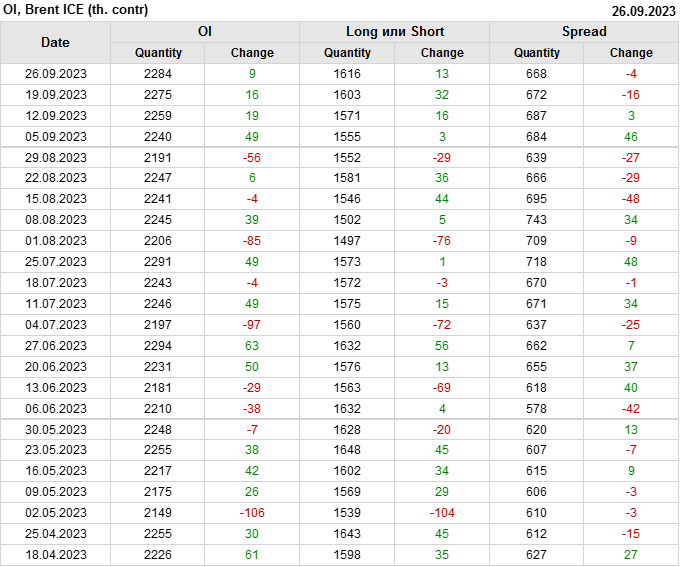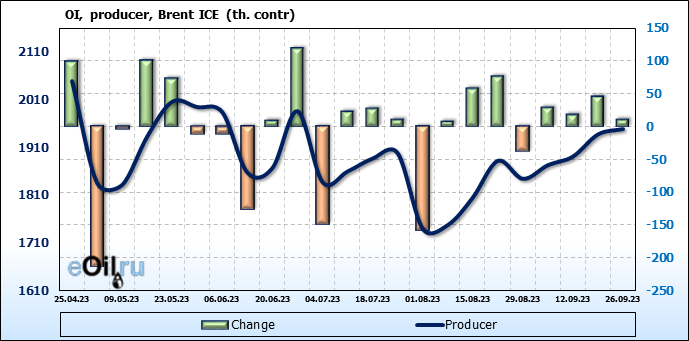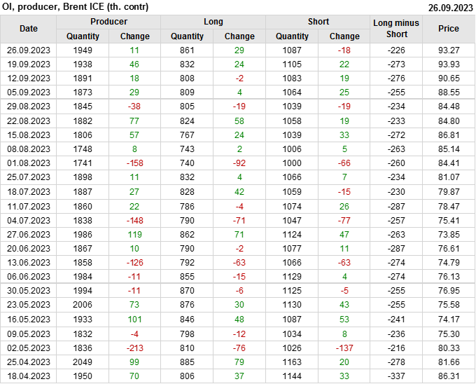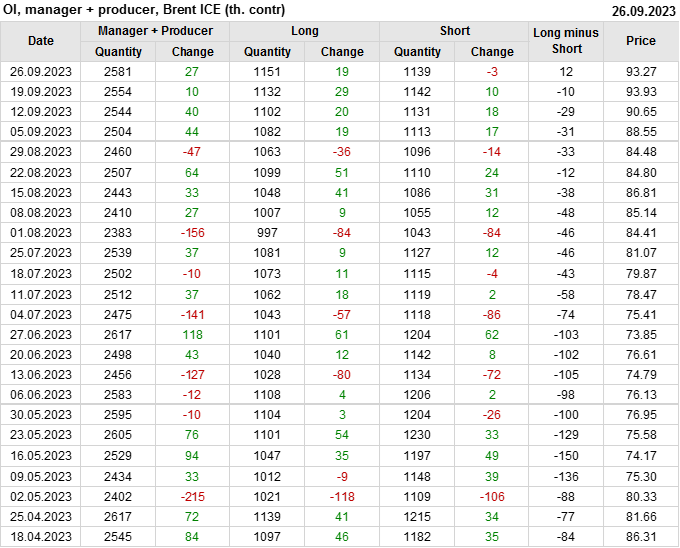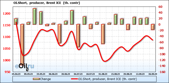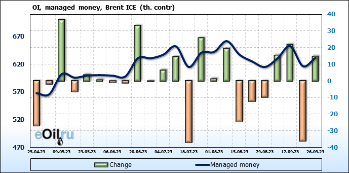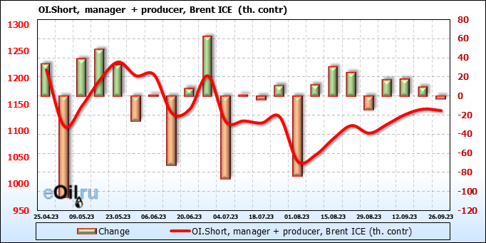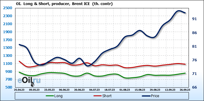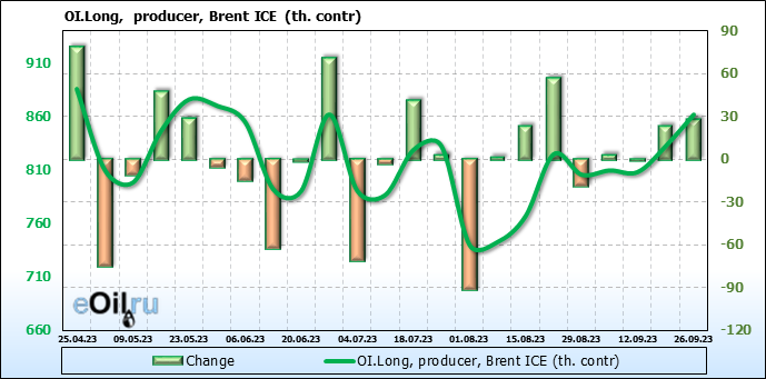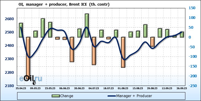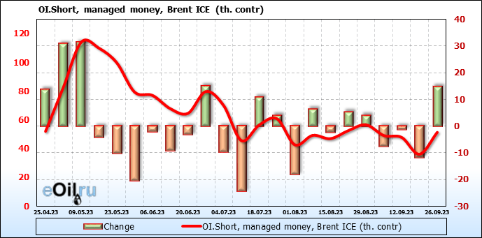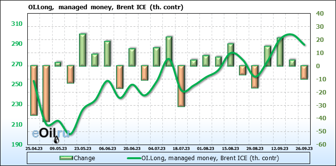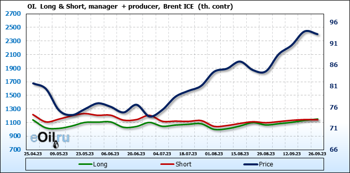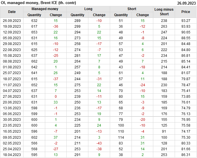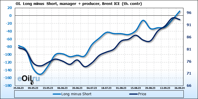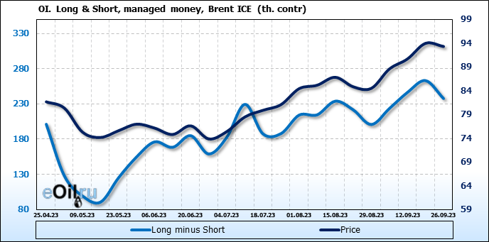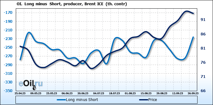 За прошедшую неделю, 20.09.23 — 26.09.23, разница между длинными и короткими позициями управляющих сократилась на 25.5 тыс. контрактов. В тоже время, цена упала на 0.66 доллара.