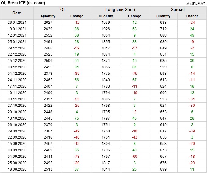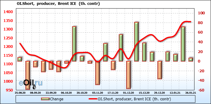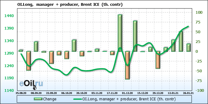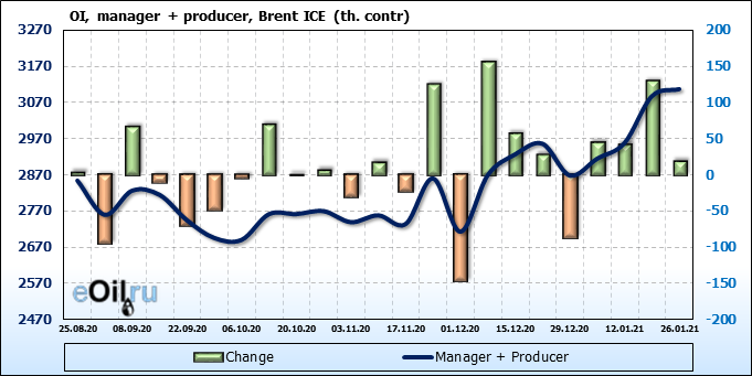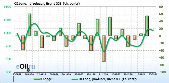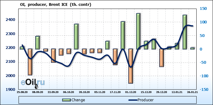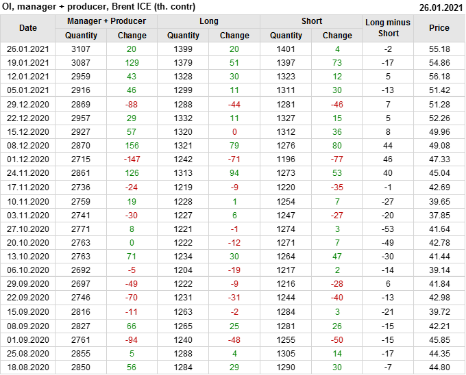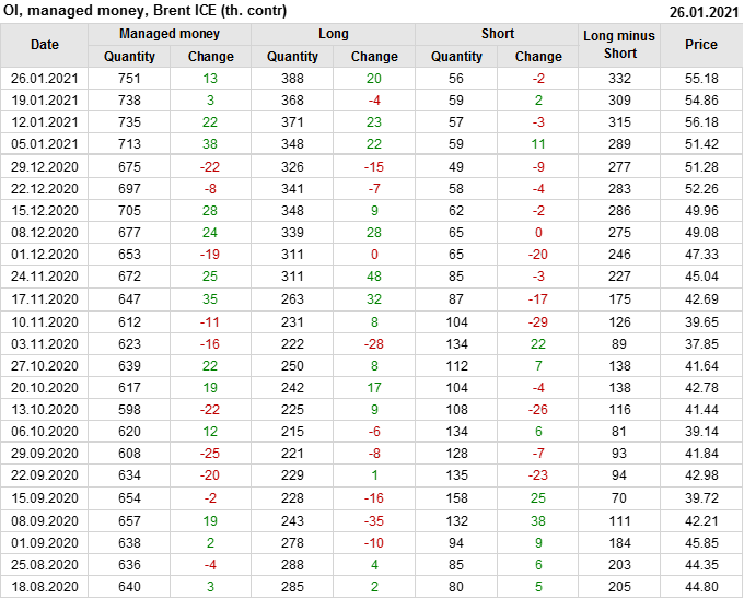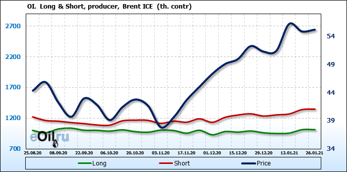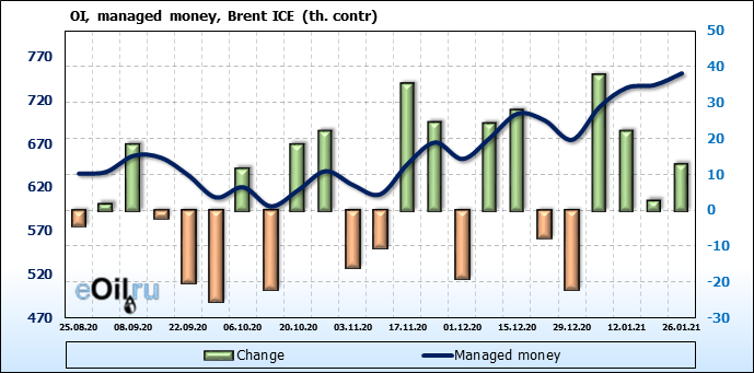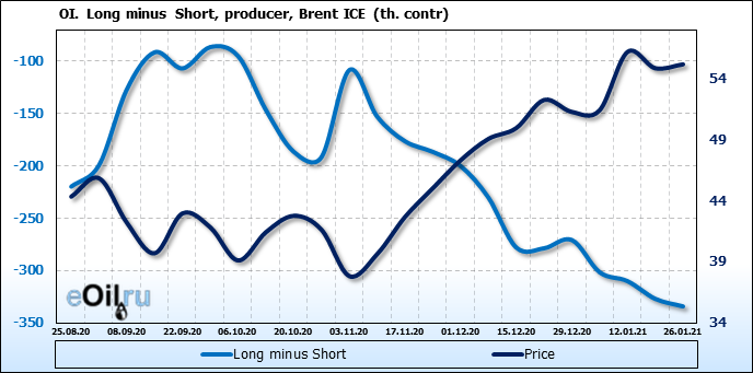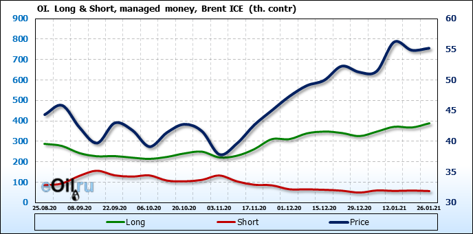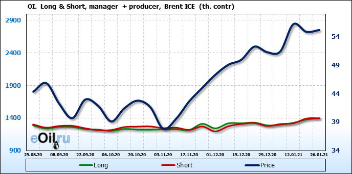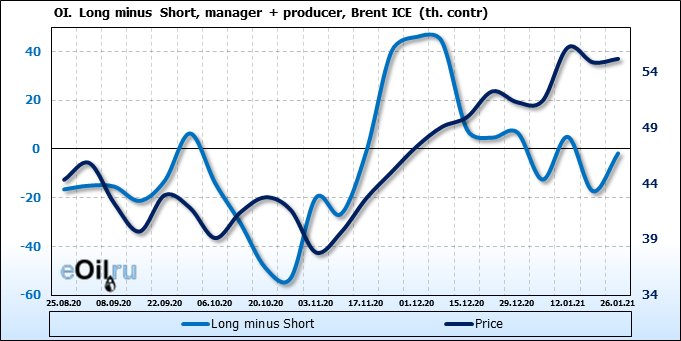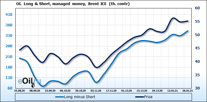 За прошлую неделю, 20.01.21 — 26.01.21, разница между длинными и короткими позициями управляющих выросла на 23 тыс. контрактов. В тоже время, цена выросла на 0.32 доллара. Управляющие наращивают позиции, разгоняя тем самым рост цен, что говорит нам о текущей силе рынка.