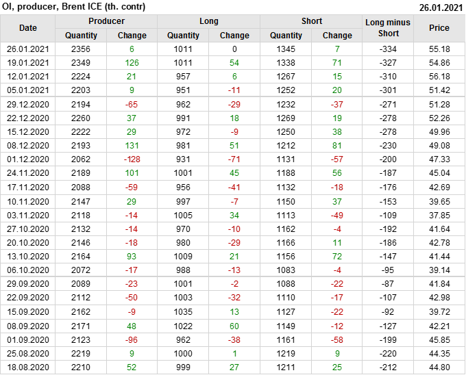 За прошлую неделю, 20.01.21 — 26.01.21, разница между длинными и короткими позициями производителей упала на 7 тыс. контрактов. В тоже время, цена выросла на 0.32 доллара. Производители увеличивают продажи, предполагая, что текущие уровни являются привлекательными для них. И не смотря на это, рынок продолжает расти, что показывает силу текущего тренда.