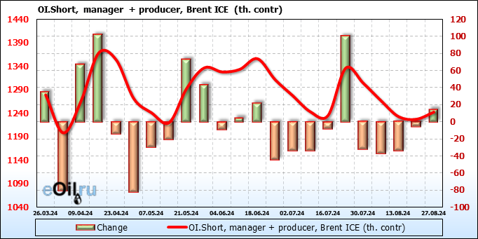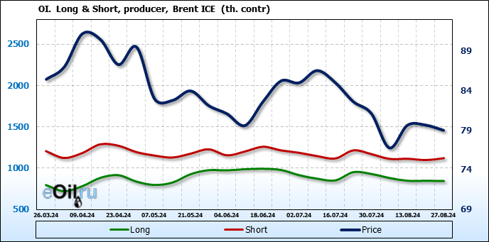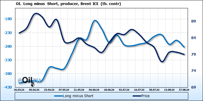 За прошедшую неделю, 21.08.24 — 27.08.24, разница между длинными и короткими позициями управляющих увеличилась на 17.4 тыс. контрактов. В тоже время, цена упала на 0.66 доллара.