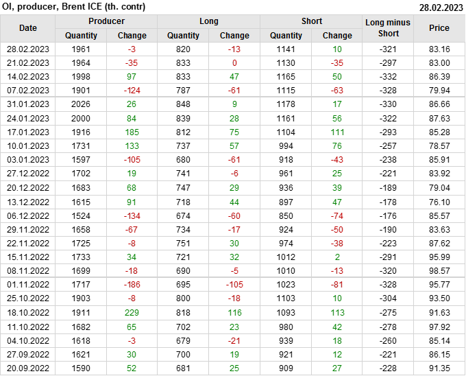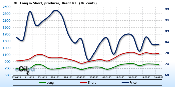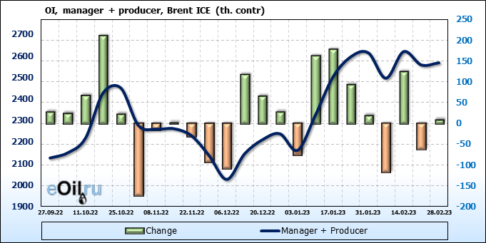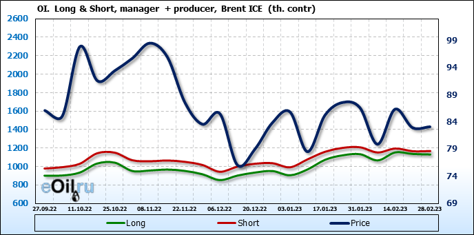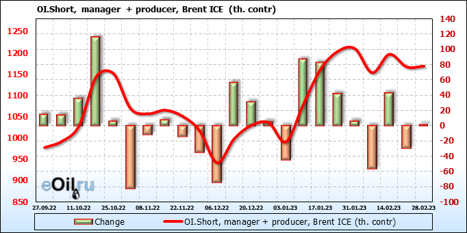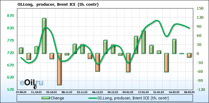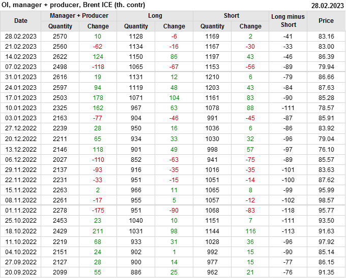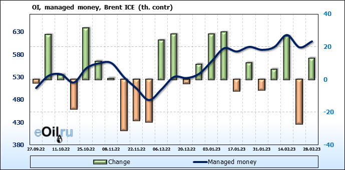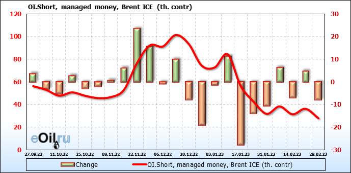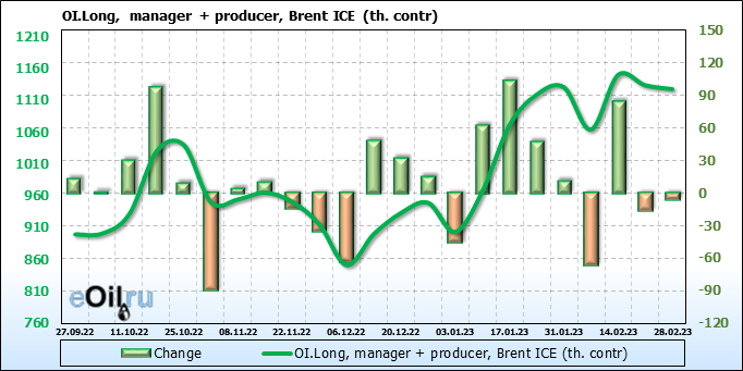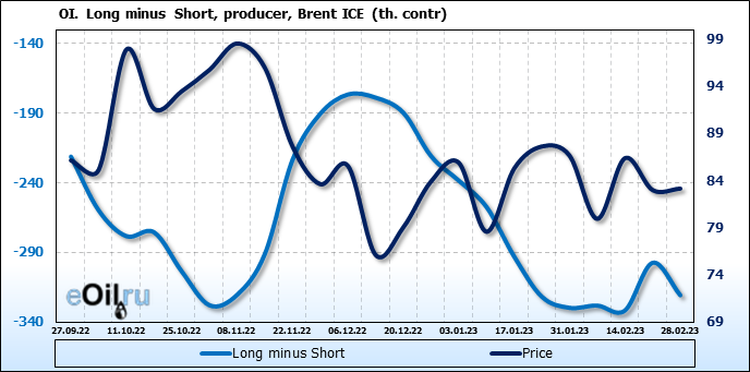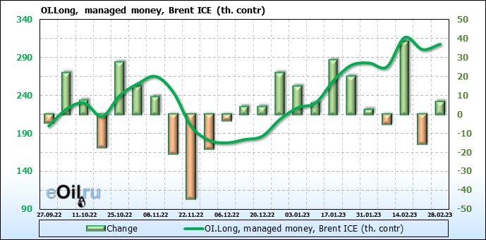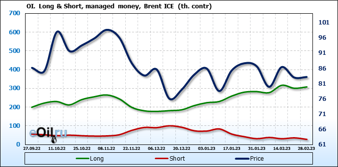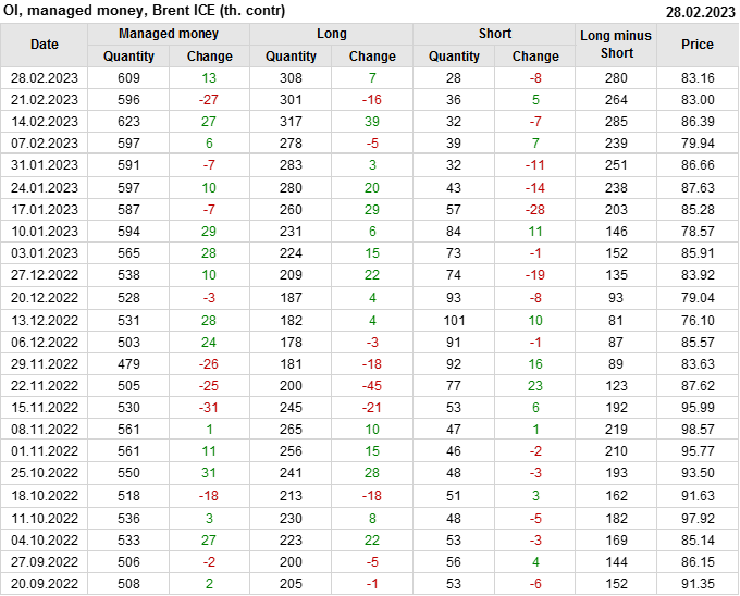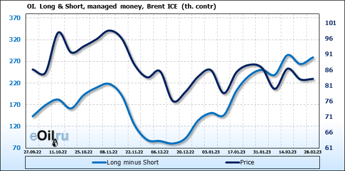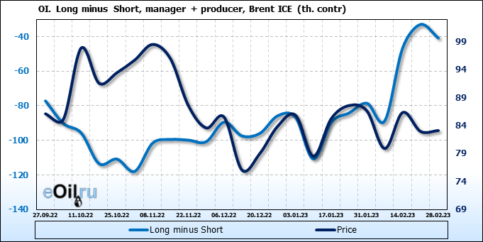 За прошедшую неделю, 22.02.23 — 28.02.23, разница между длинными и короткими позициями управляющих увеличилась на 15.5 тыс. контрактов. В тоже время, цена выросла на 0.16 доллара.